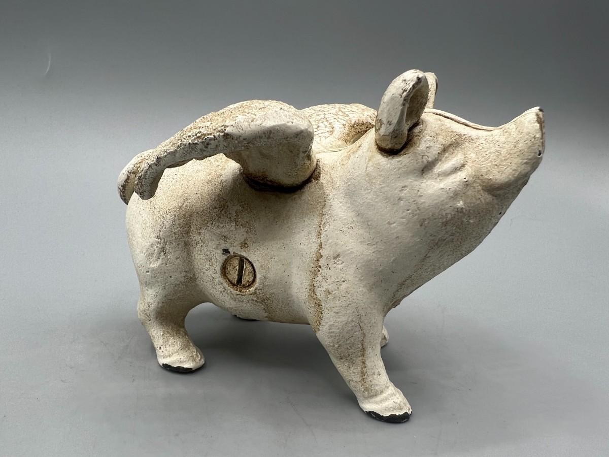 There is some light wear to the pig, but there is no significant damage and is in overall good displayable condition. Can be unscrewed to access the coins, check pictures for more details and for sizing.