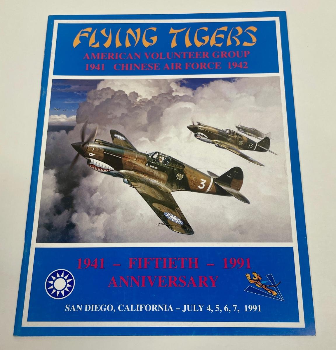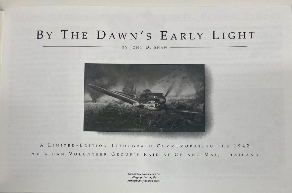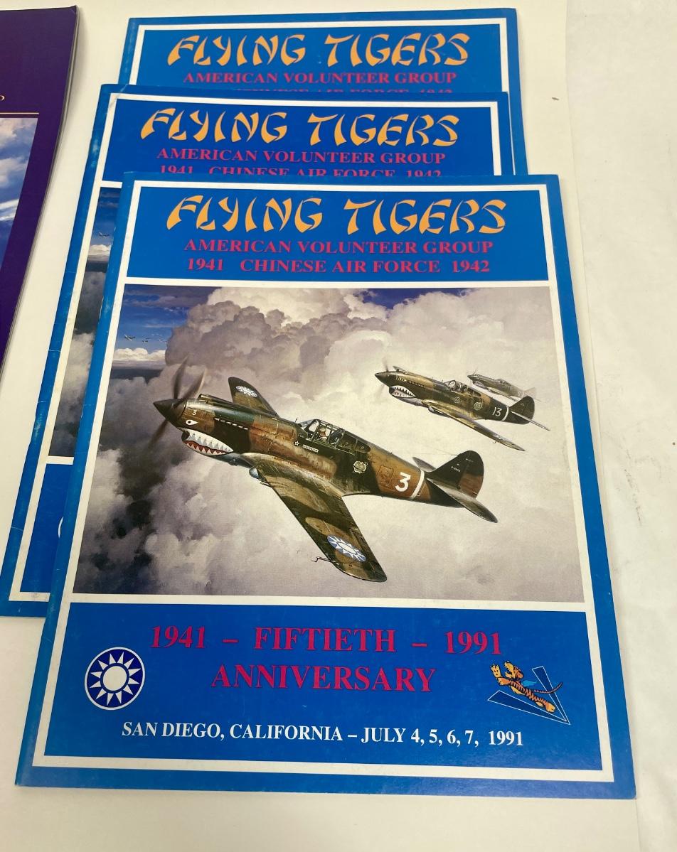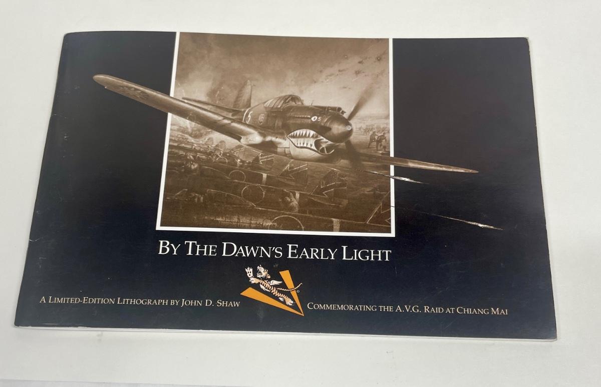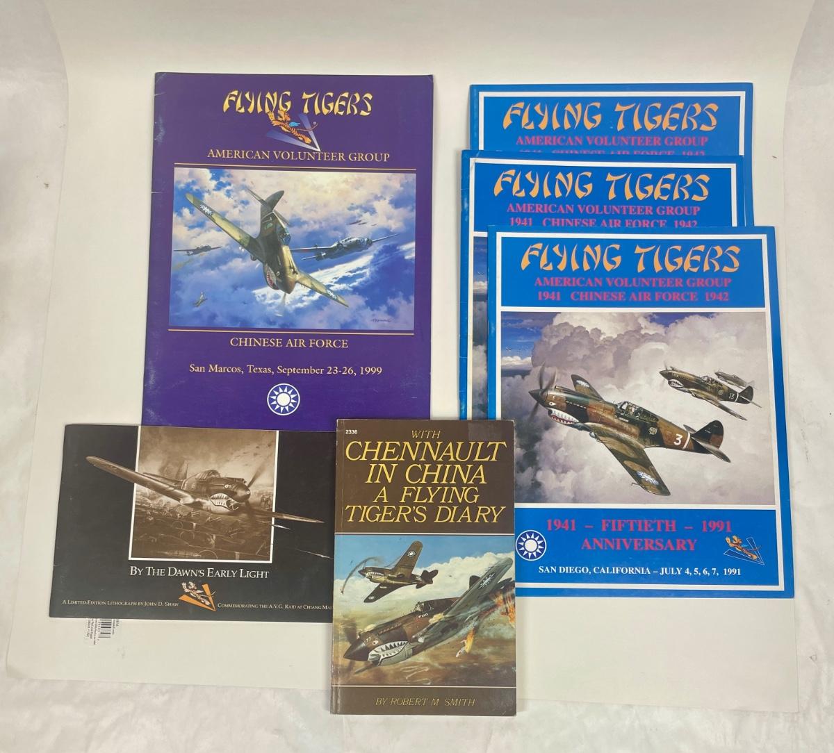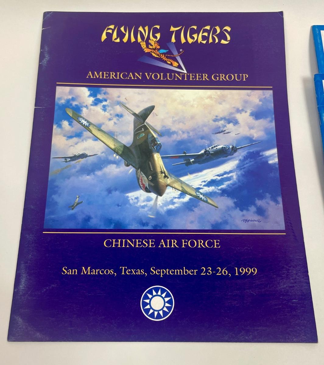 Collectible Books and Reunion programs for the WWII Flying Tigers US Army Air Force Unit, with some signatures of people who served in the units. Signatures include Tex Hill, Charlie Bond, Dick Rossi, Erik Shilling, Rode Rodewald and others who attended reunions in 1991 and 1999. Also included is a pamphlet describing an artwork "By the Dawn's Early Light" by John Shaw, commemorating an attack on the Japanese airbase at Chiang Mai, Thailand and the book "With Chennault in China: A Flying Tiger's Diary" also signed by many of the personnel who served in the AVG Flying Tigers unit in China. All in good condition.