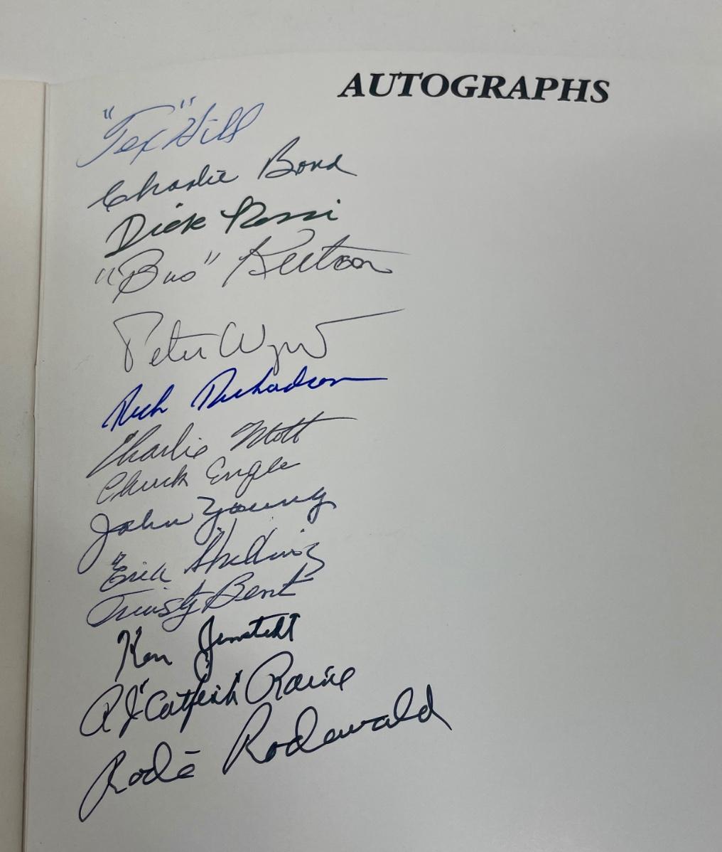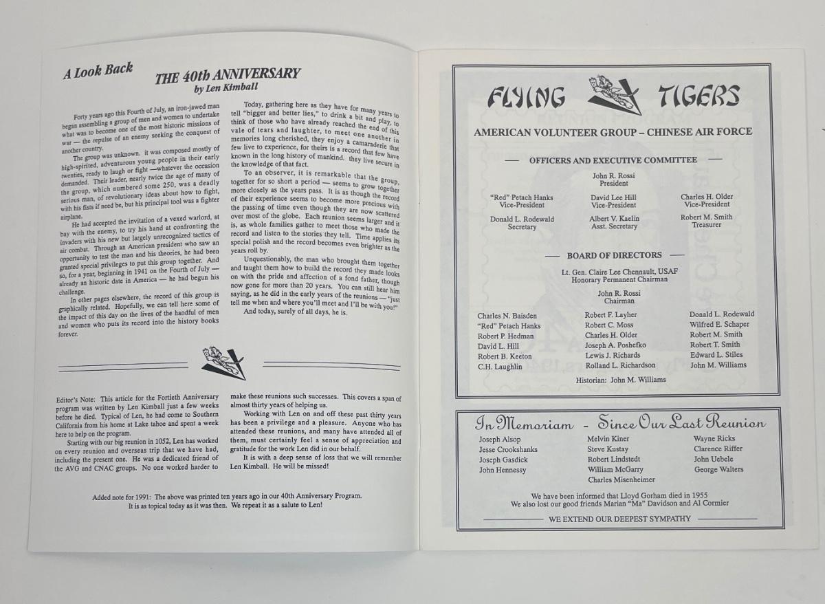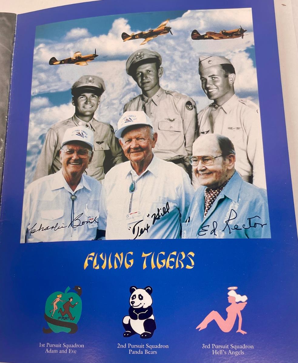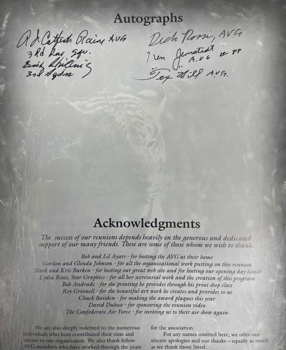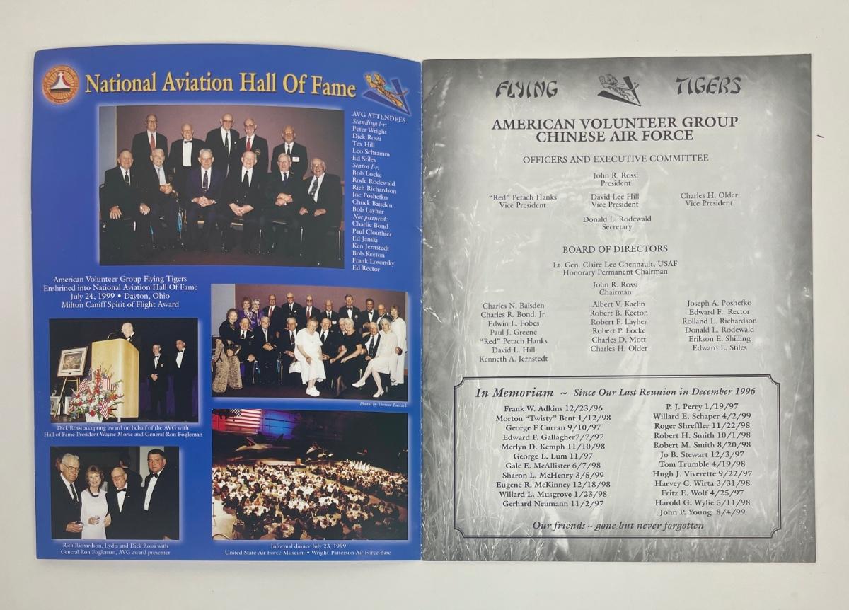 Collectible Books and Reunion programs for the WWII Flying Tigers US Army Air Force Unit, with some signatures of people who served in the units. Signatures include Tex Hill, Charlie Bond, Dick Rossi, Erik Shilling, Rode Rodewald and others who attended reunions in 1991 and 1999. Also included is a pamphlet describing an artwork "By the Dawn's Early Light" by John Shaw, commemorating an attack on the Japanese airbase at Chiang Mai, Thailand and the book "With Chennault in China: A Flying Tiger's Diary" also signed by many of the personnel who served in the AVG Flying Tigers unit in China. All in good condition.