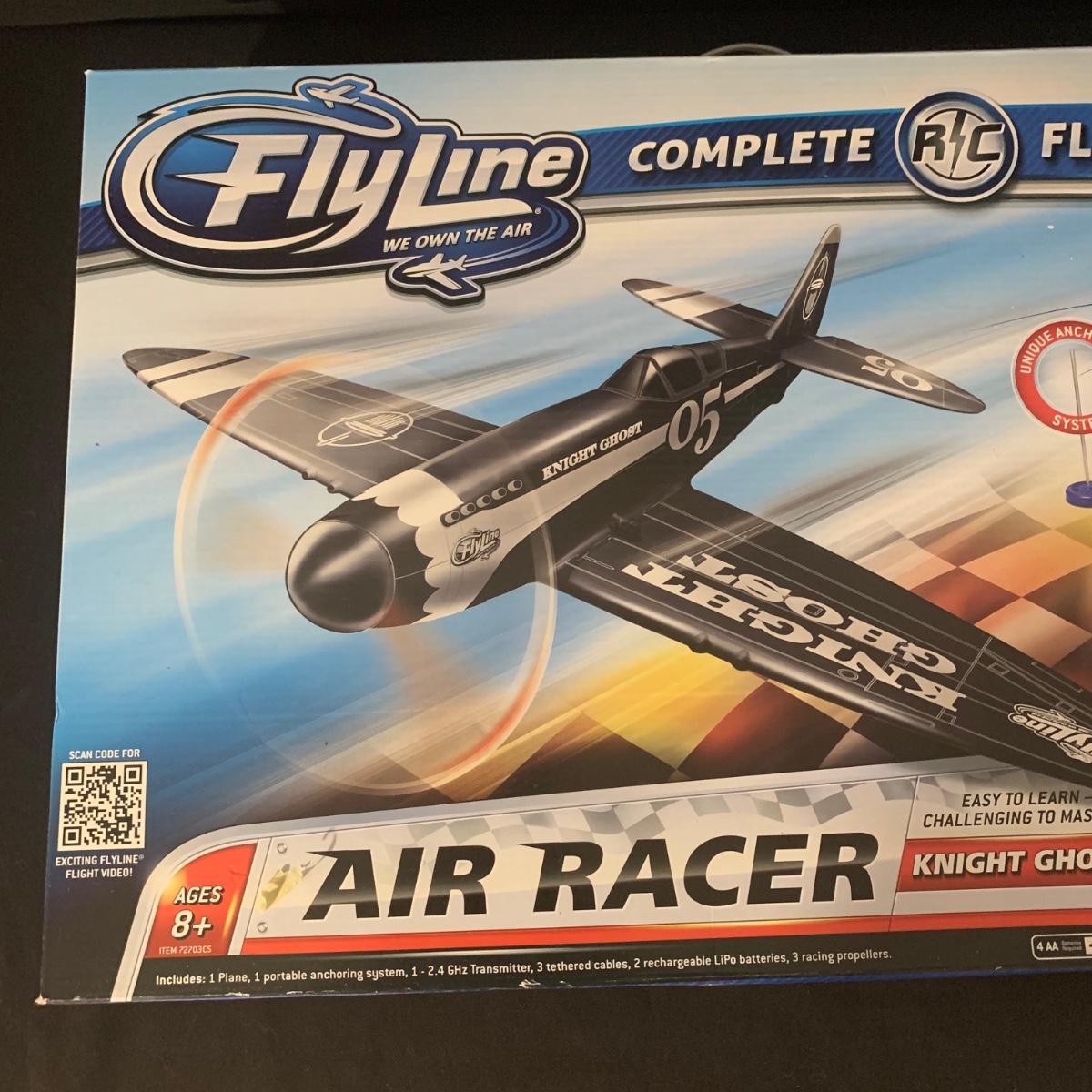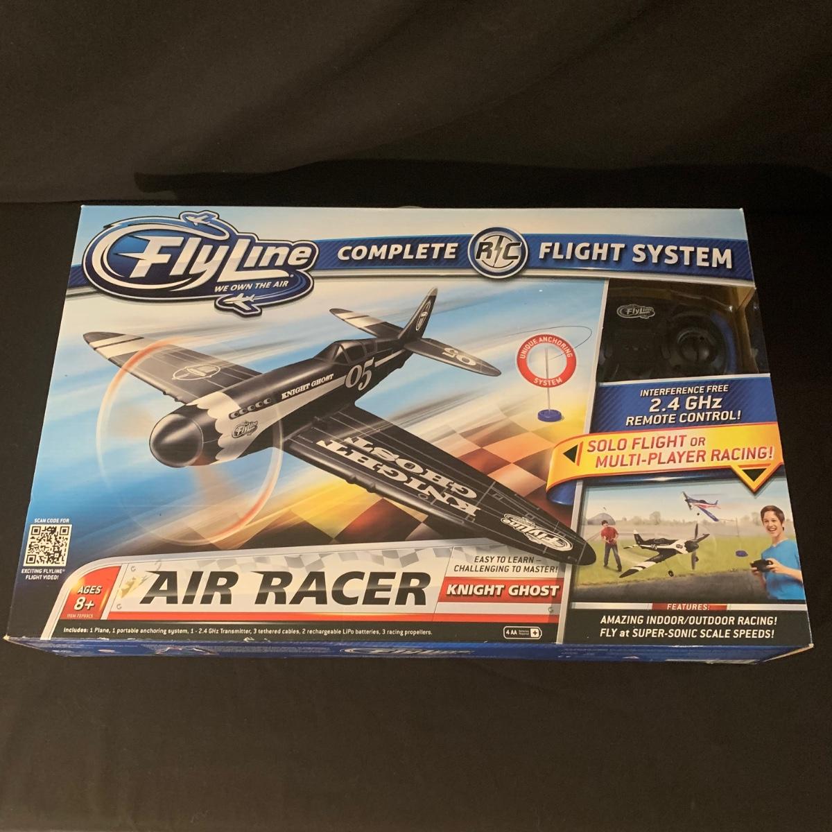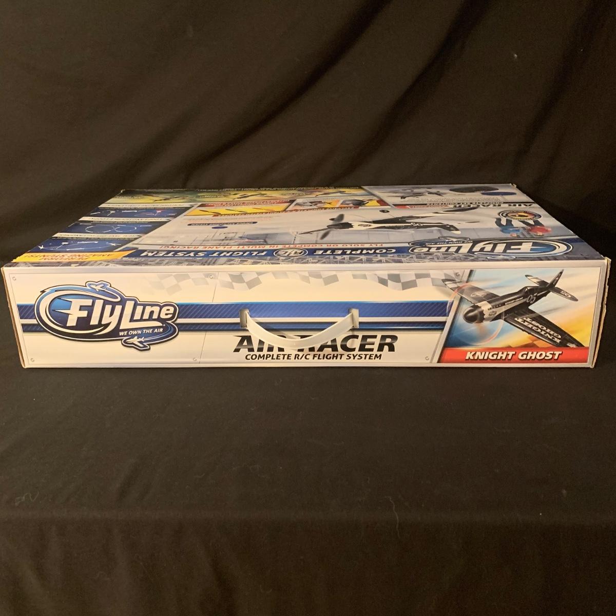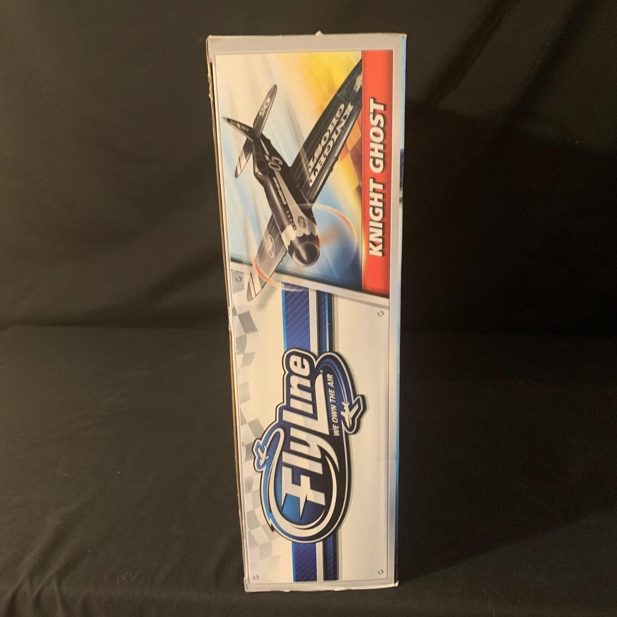 Unopened in box FlyLine Air Racer R/C airplane; Knight Ghost style. Plane is for ages 8+ and requires four AA batteries (not included). Model number: 0610074087496. Box measures, 23.5”L x 4.5W x 15”H.