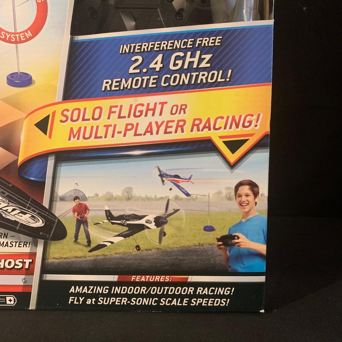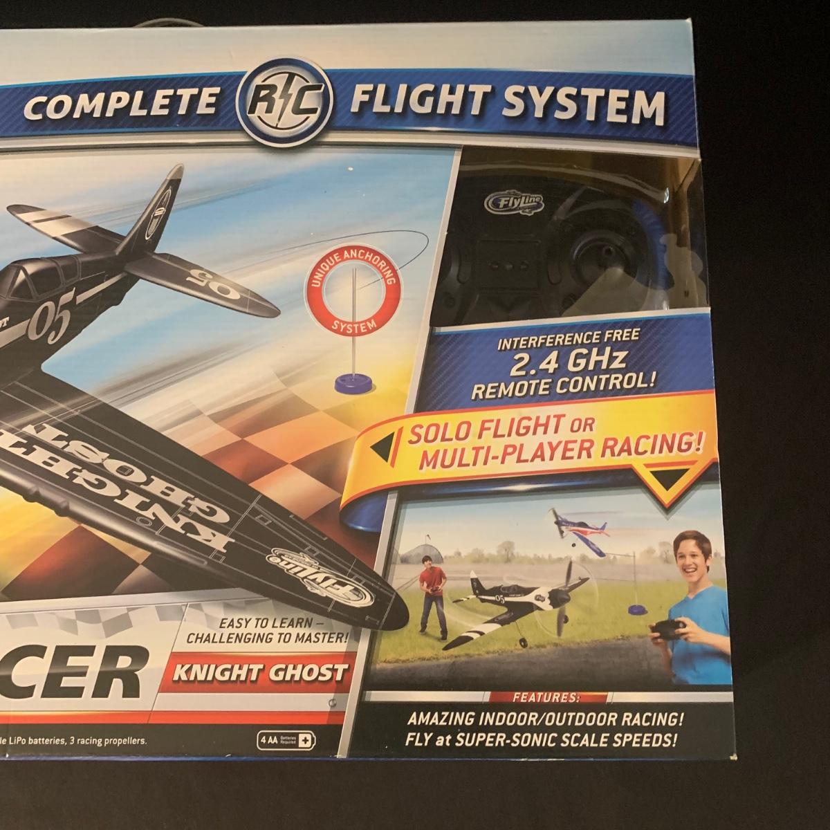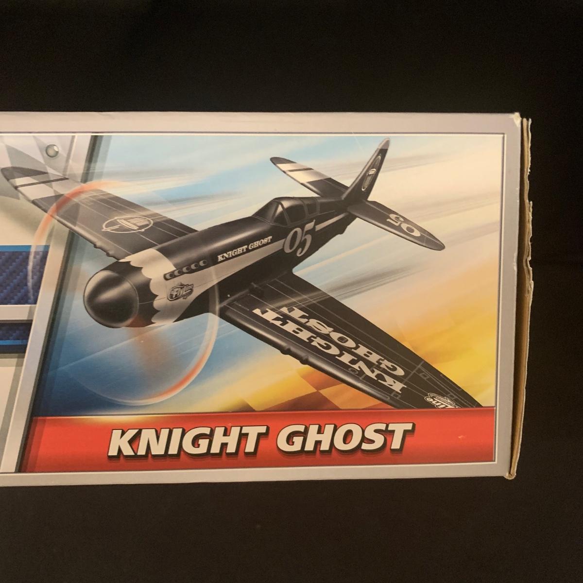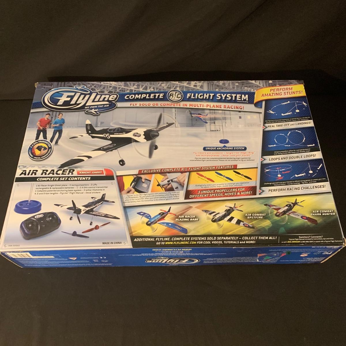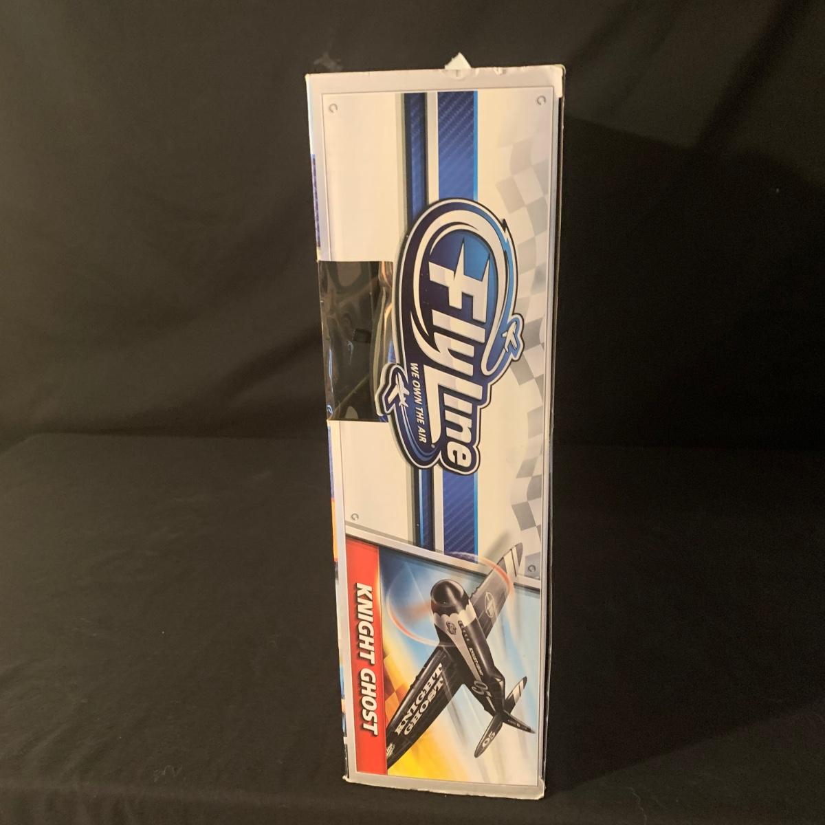 Unopened in box FlyLine Air Racer R/C airplane; Knight Ghost style. Plane is for ages 8+ and requires four AA batteries (not included). Model number: 0610074087496. Box measures, 23.5”L x 4.5W x 15”H.