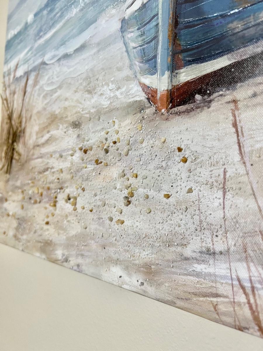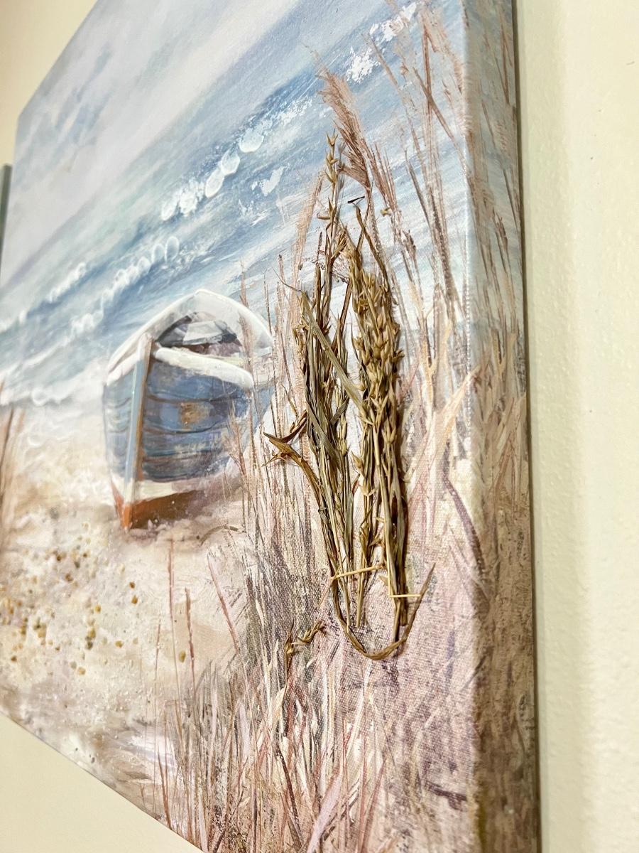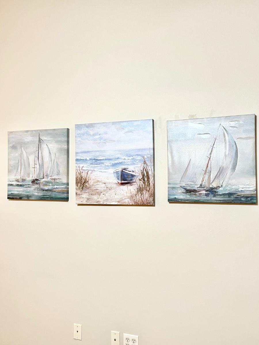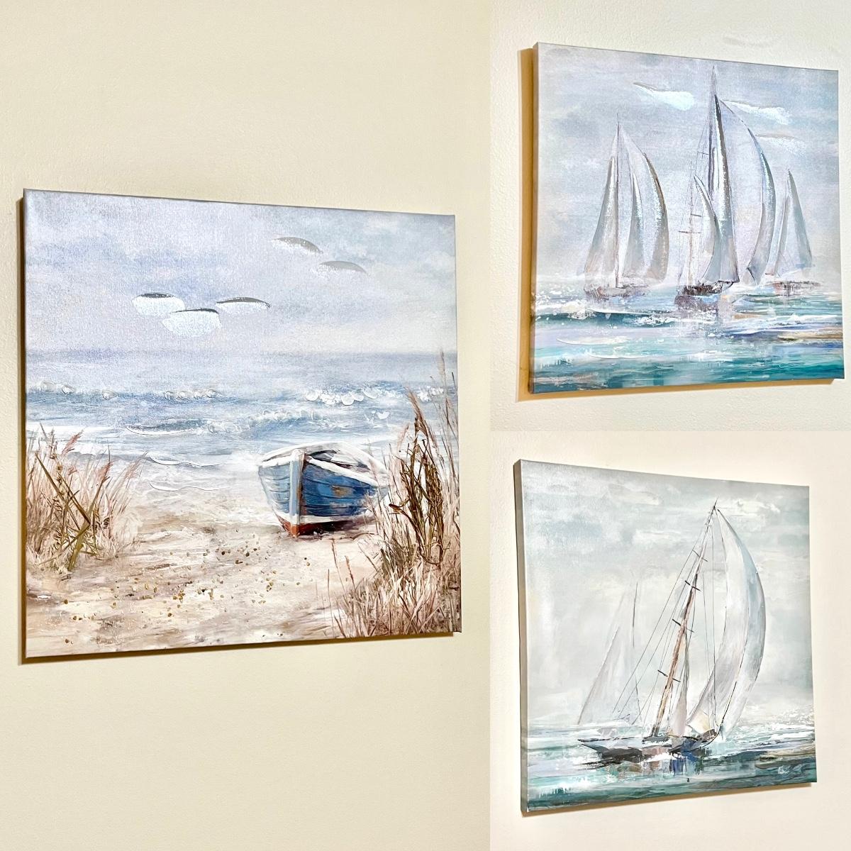 Both Sail boat canvases = 22” Square ~ Textured beach canvas = 24” Square