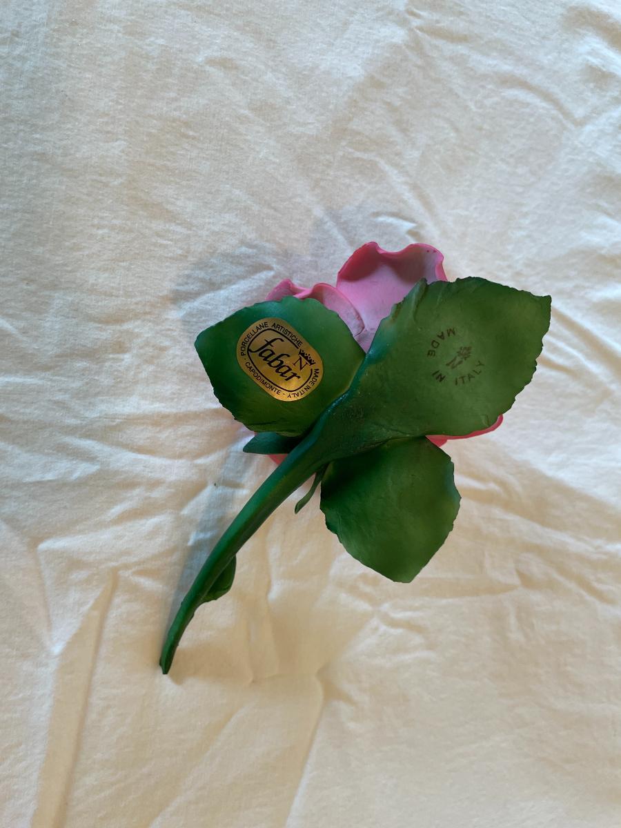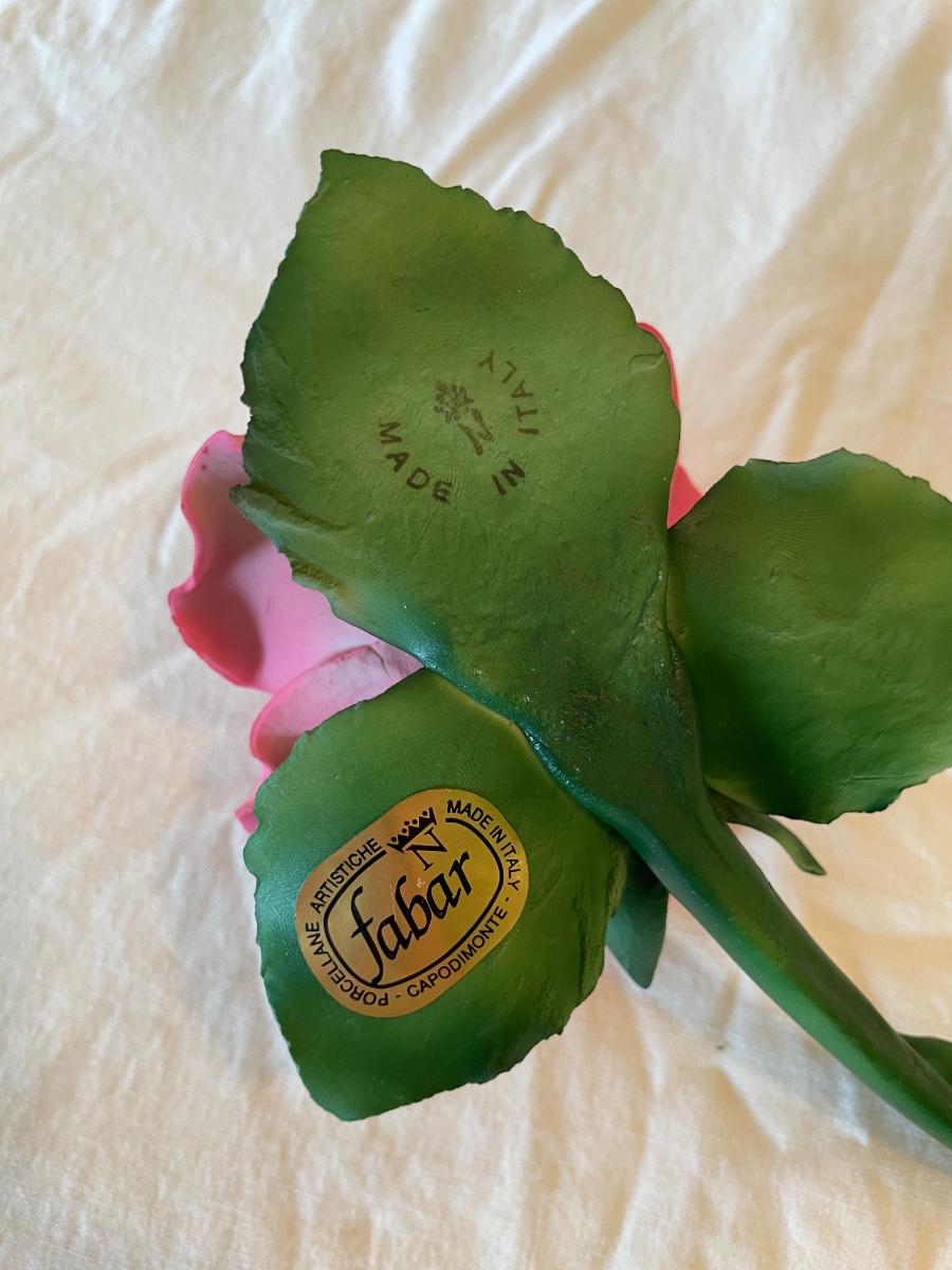 Capodimonte Fabar handmade porcelain rose figurine crafted in Italy. This piece features a pink rose with green leaves and a stem, showcasing delicate detailing. The underside of the leaf bears the "Made in Italy" stamp and an original Capodimonte Fabar label. The figurine measures approximately 7 inches in length.