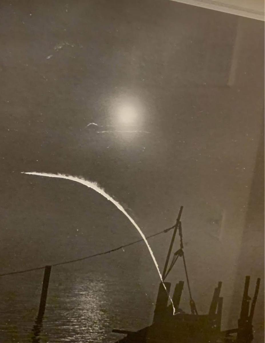 The bright white arc across the sky is part of the original photograph — a long-exposure light trail, which adds a dramatic focal point and a sense of motion in an otherwise still, moody scene.