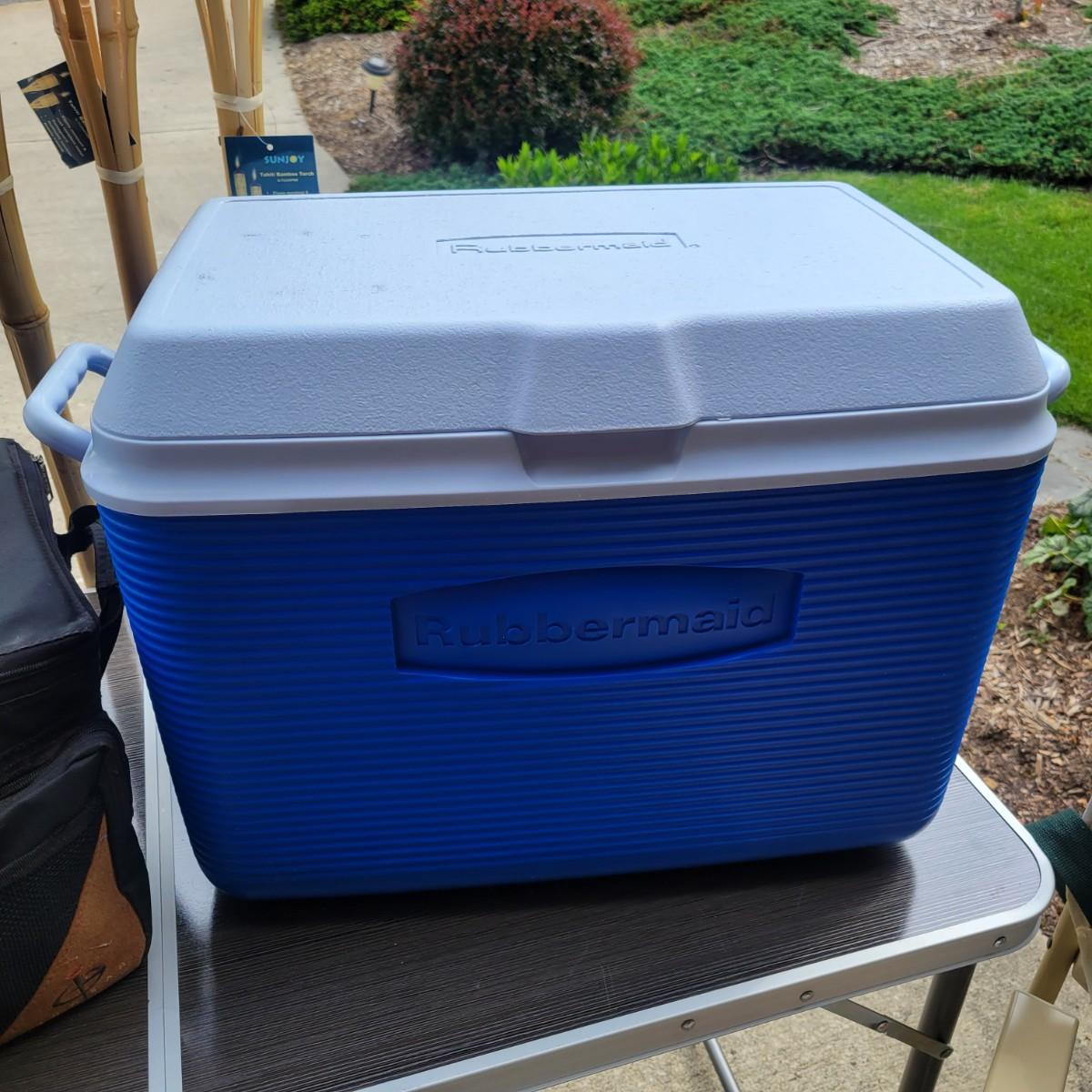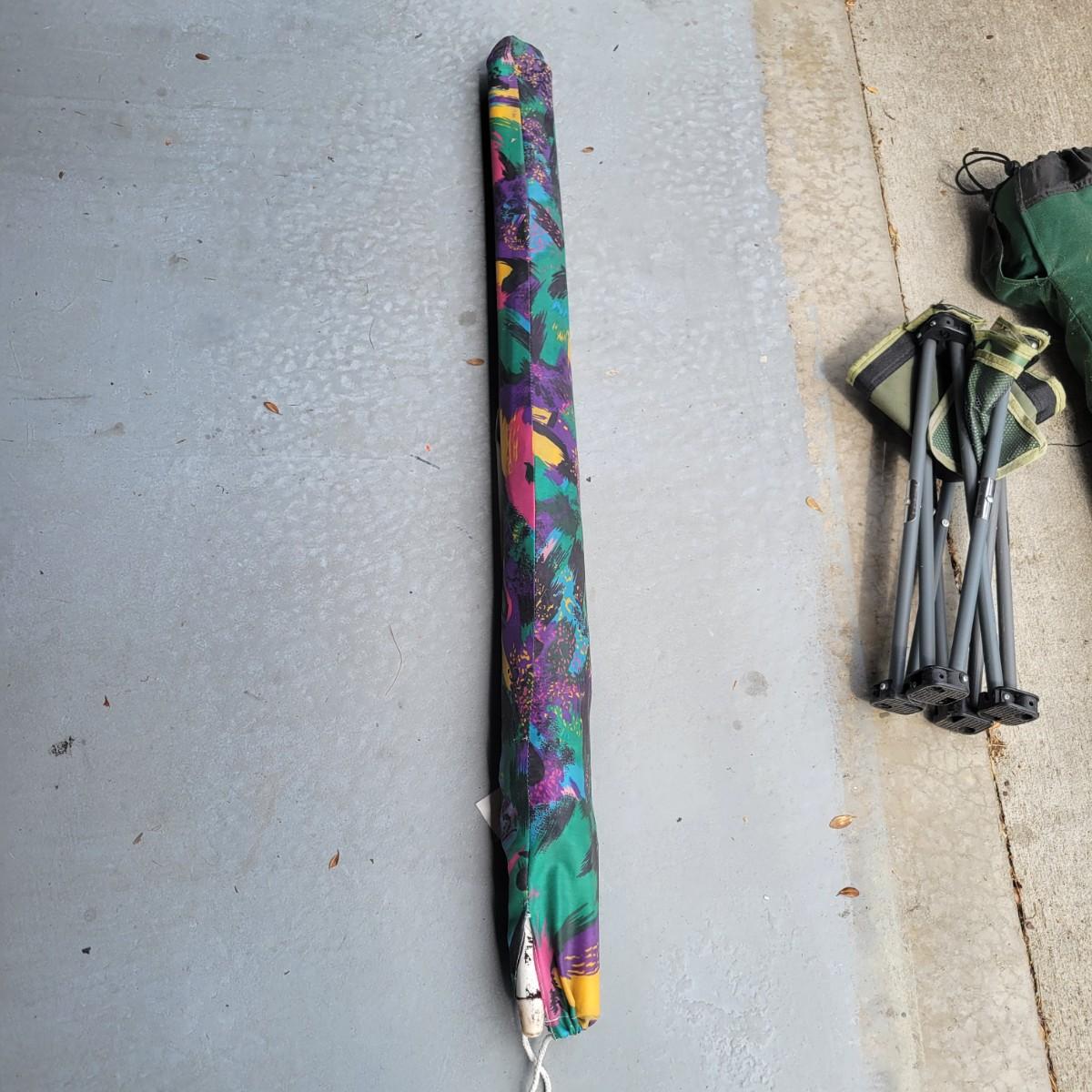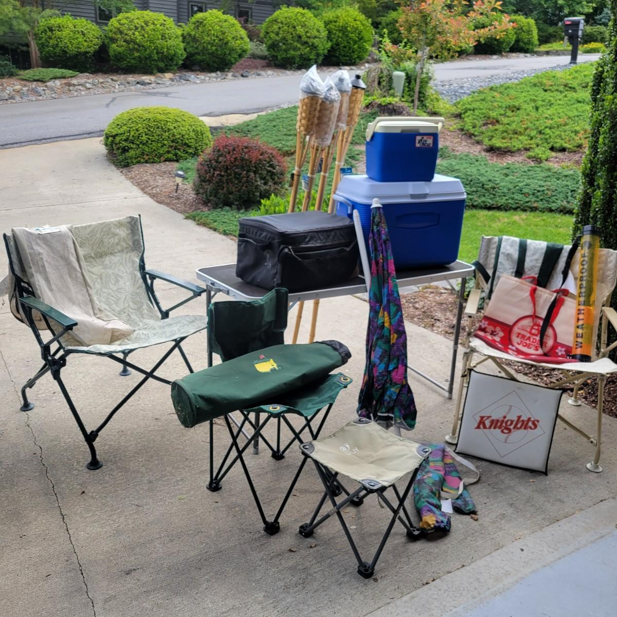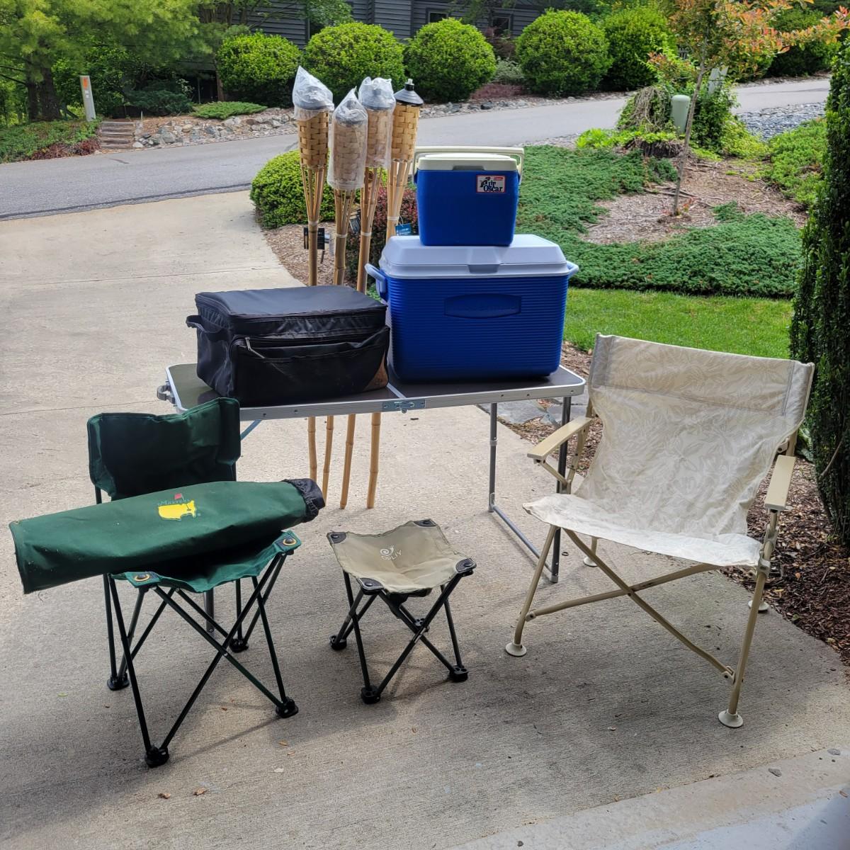 An assortment of camping related items that includes a folding camp table that measures approximately 48" x 24" x 20"H. Multiple coolers and folding camp chairs, a beach umbrella, four unused tiki torches and more. Local pickup only