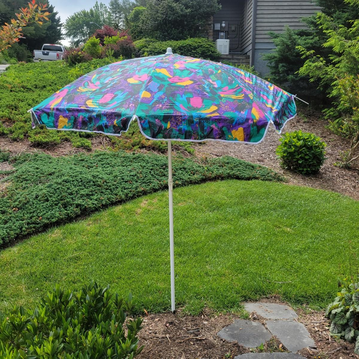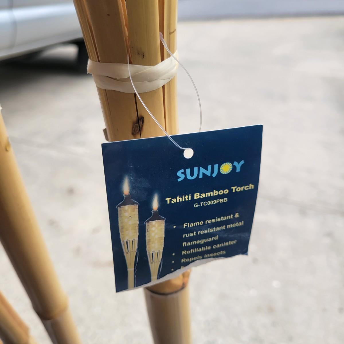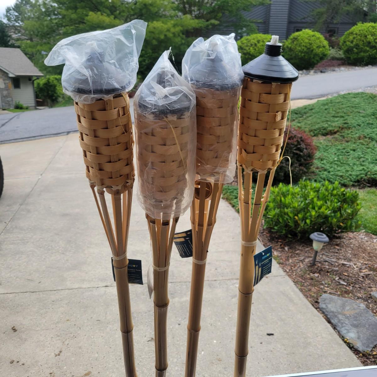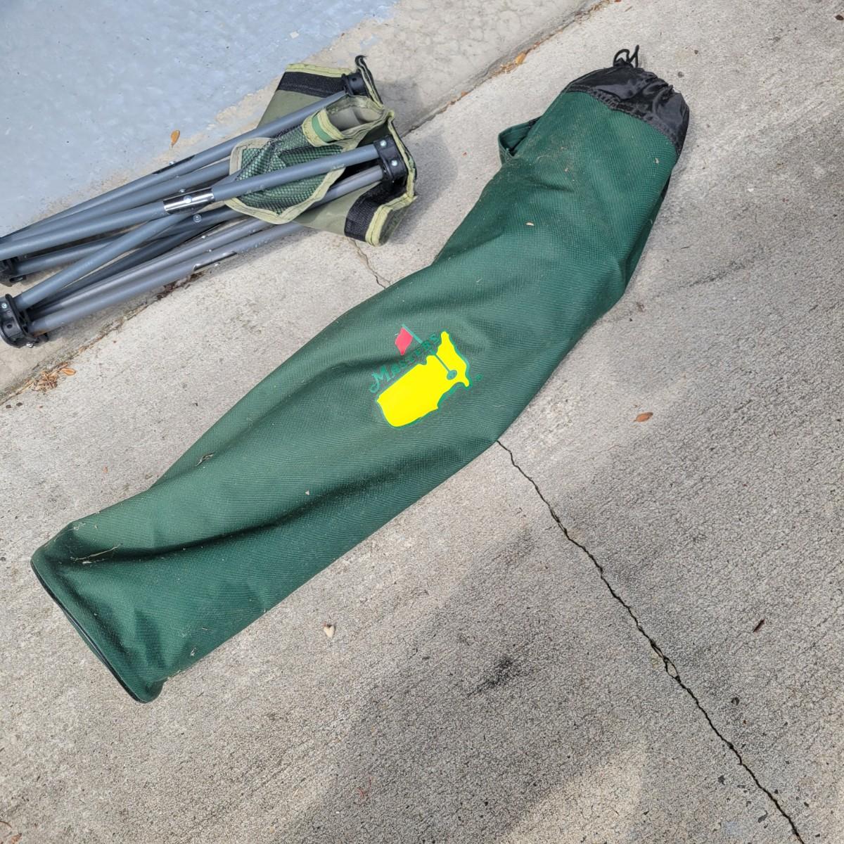 An assortment of camping related items that includes a folding camp table that measures approximately 48" x 24" x 20"H. Multiple coolers and folding camp chairs, a beach umbrella, four unused tiki torches and more. Local pickup only