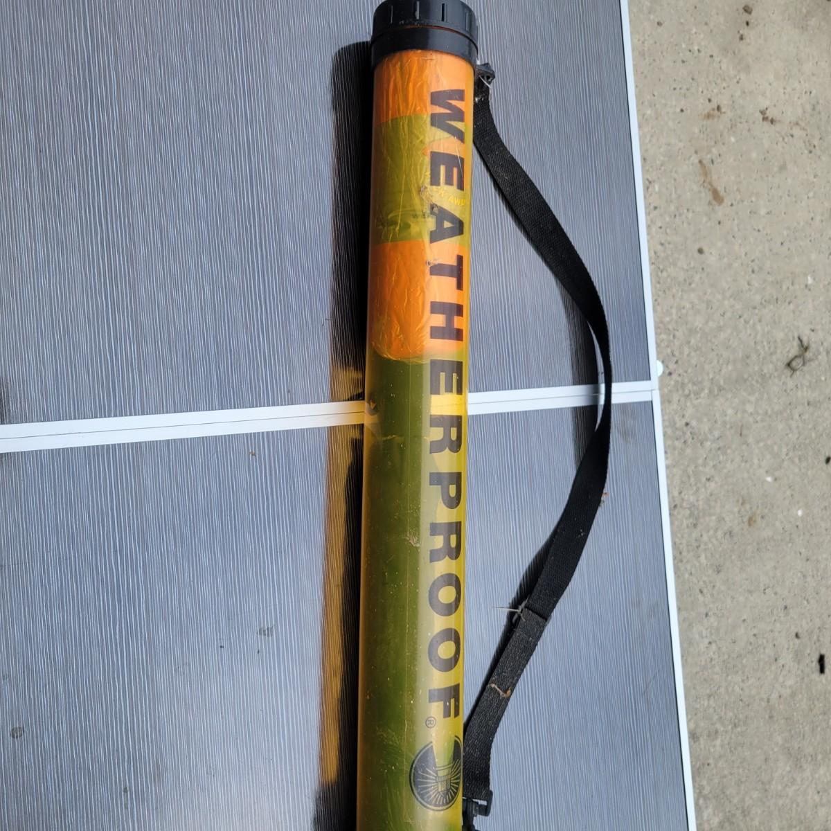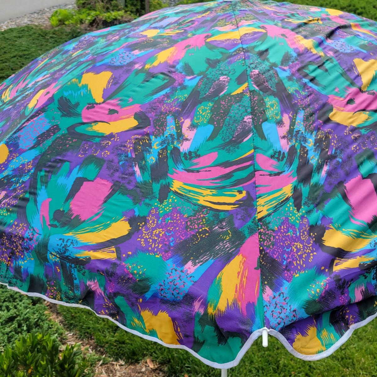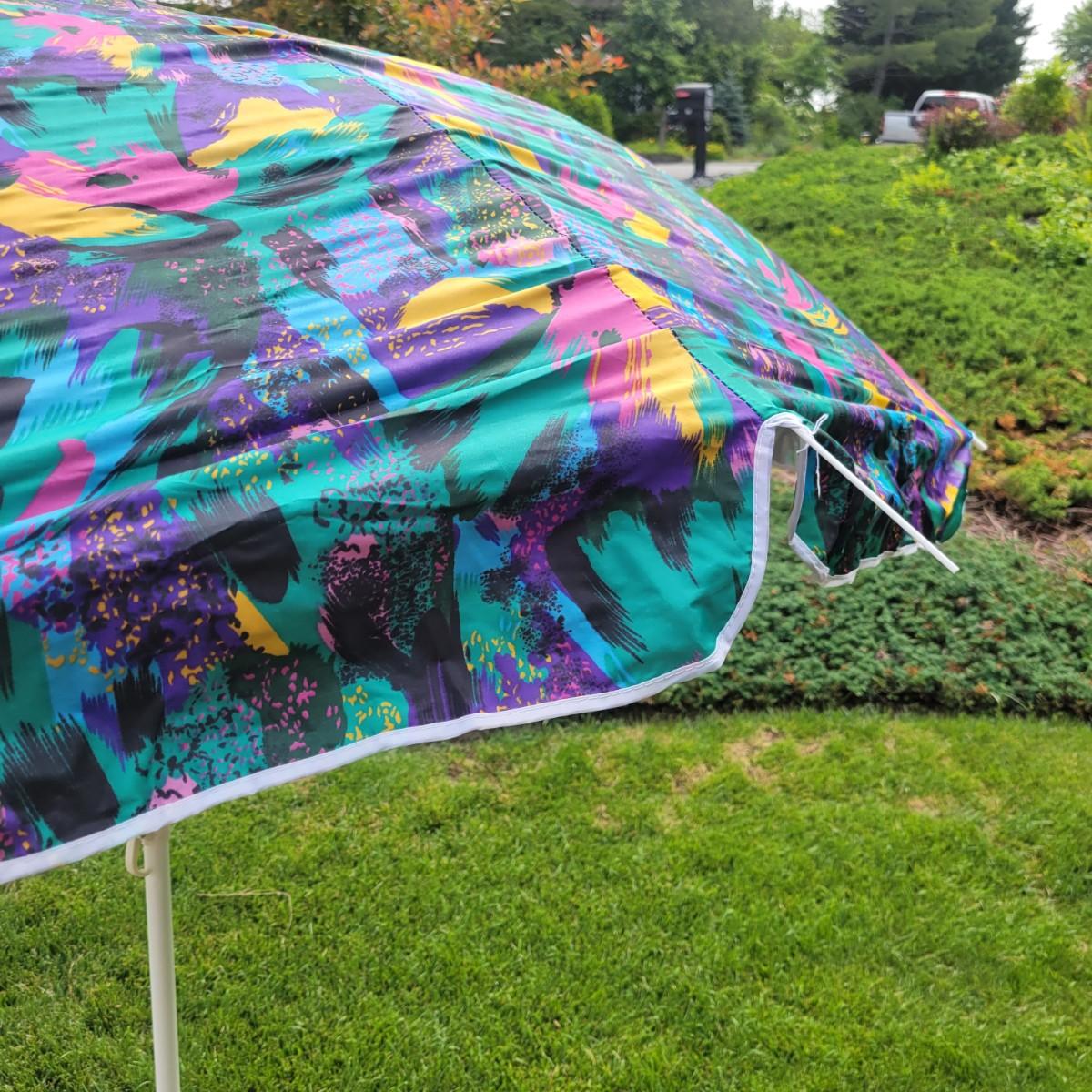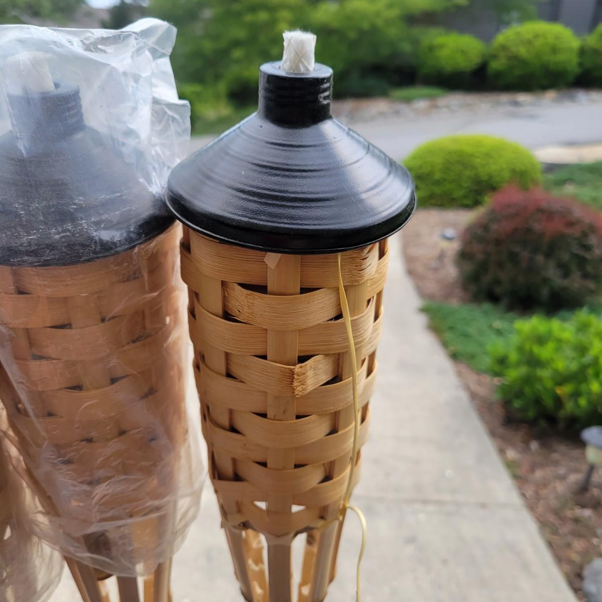 An assortment of camping related items that includes a folding camp table that measures approximately 48" x 24" x 20"H. Multiple coolers and folding camp chairs, a beach umbrella, four unused tiki torches and more. Local pickup only