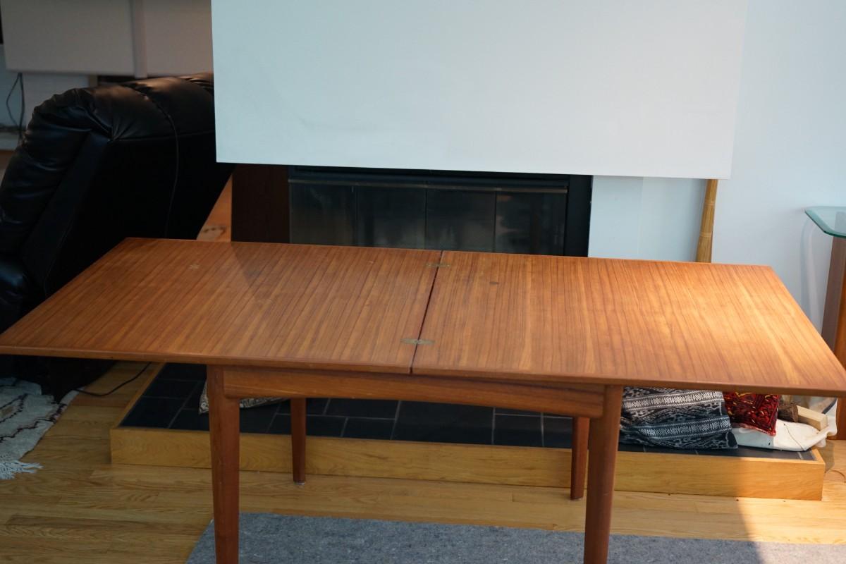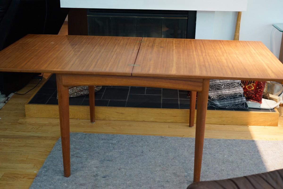 teak table that folds in the center. Sometimes called a game table. as you can fold and put up against a wall for room. the one leaf lift up to store cards and game pieces and is green felt lined. the top from what I tried can not be "swiveld" but just folds. The top of the table as some wear in areas and may need refinishing. not bad but noticeable. Measures: open 71" in length, or 35 1/2" per leaf, Width is 35" and the height is 28"