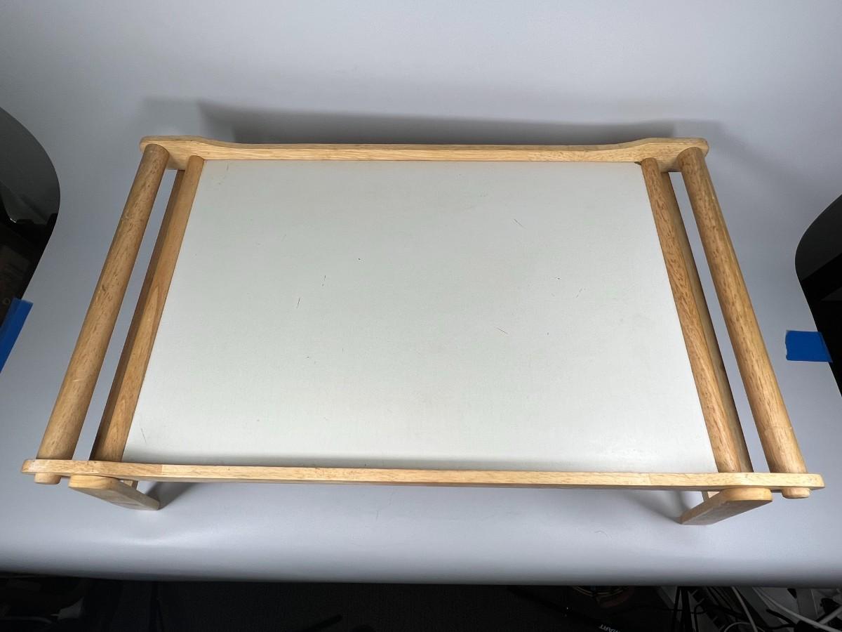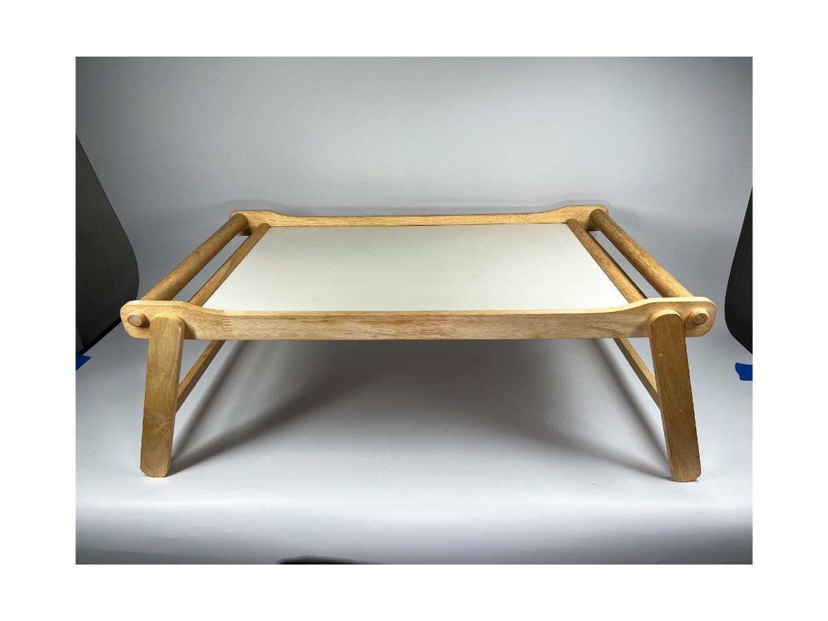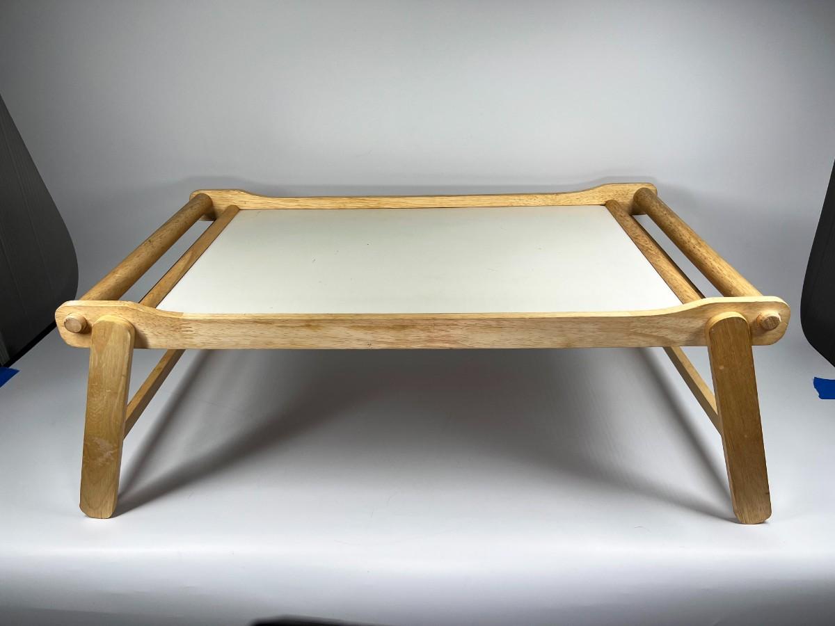 Foldable Plastic Wooden Lap Breakfast Tray, there is some light wear to the tray, but there is no significant damage to the tray and is in good useable condition. Check pictures for more details and for sizing.
