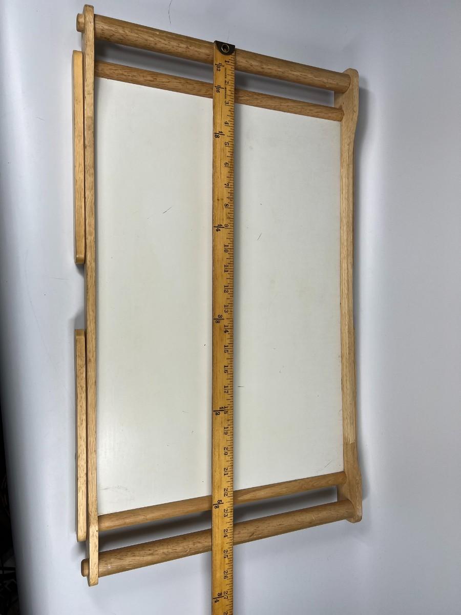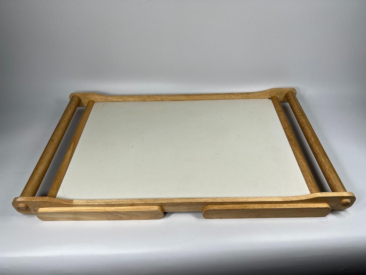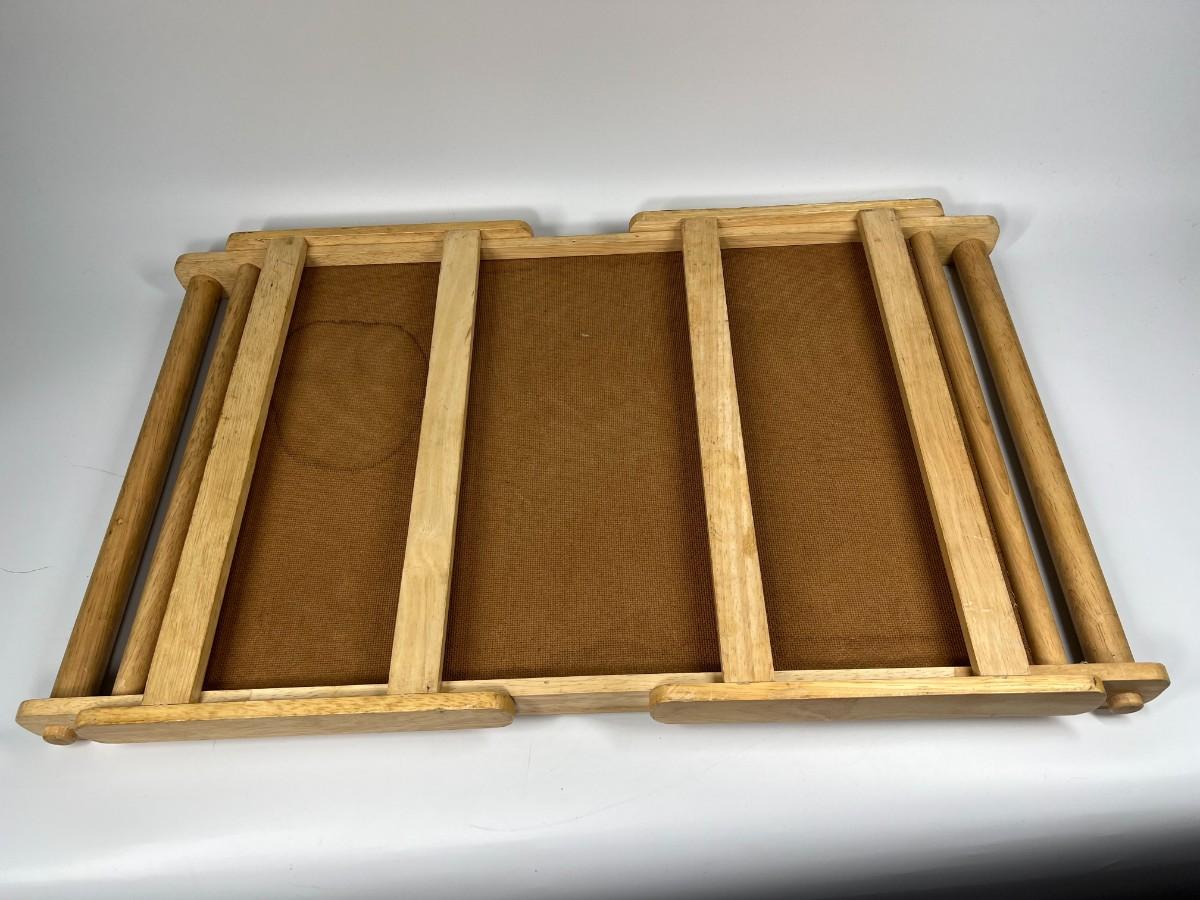 Foldable Plastic Wooden Lap Breakfast Tray, there is some light wear to the tray, but there is no significant damage to the tray and is in good useable condition. Check pictures for more details and for sizing.