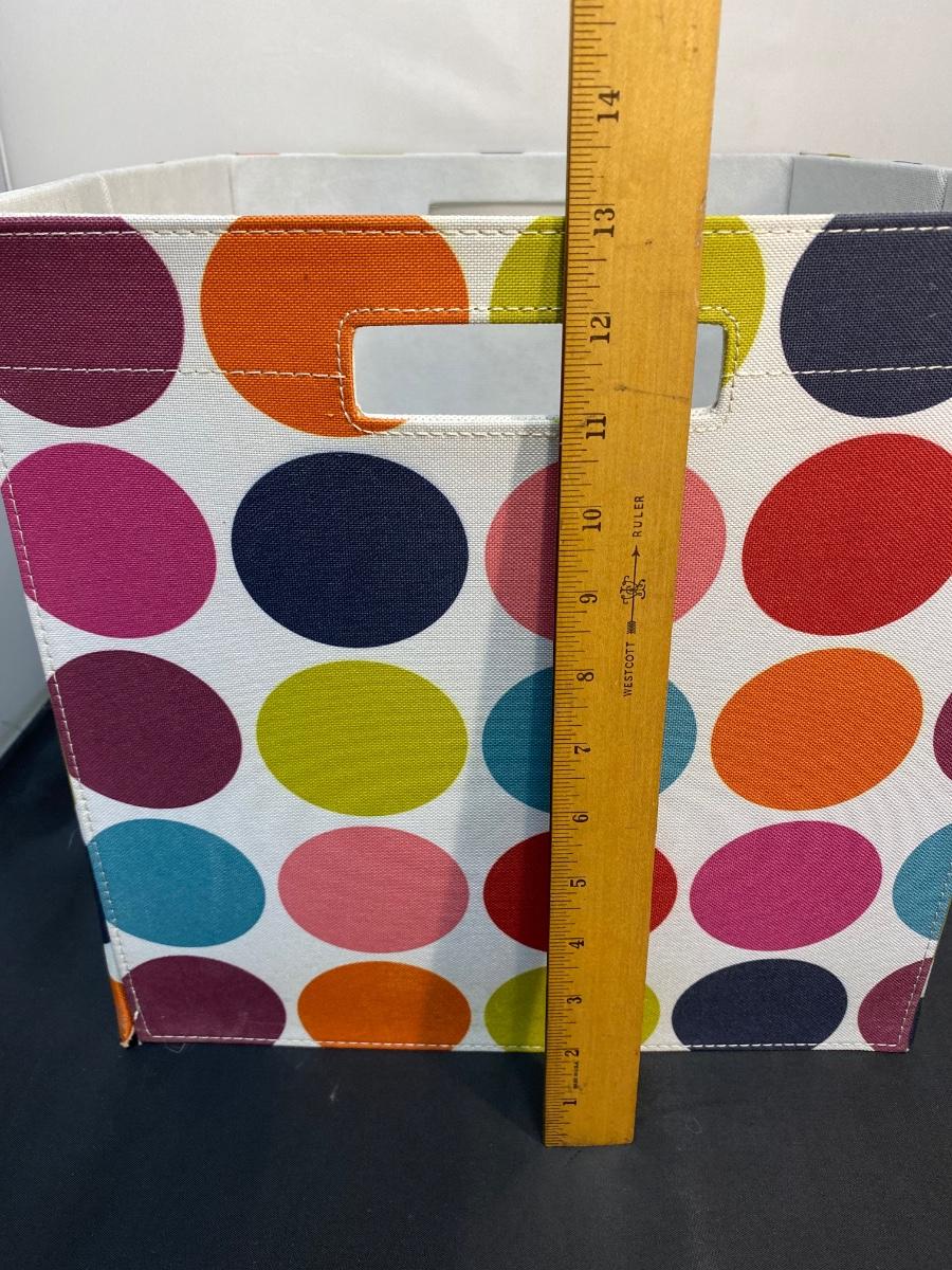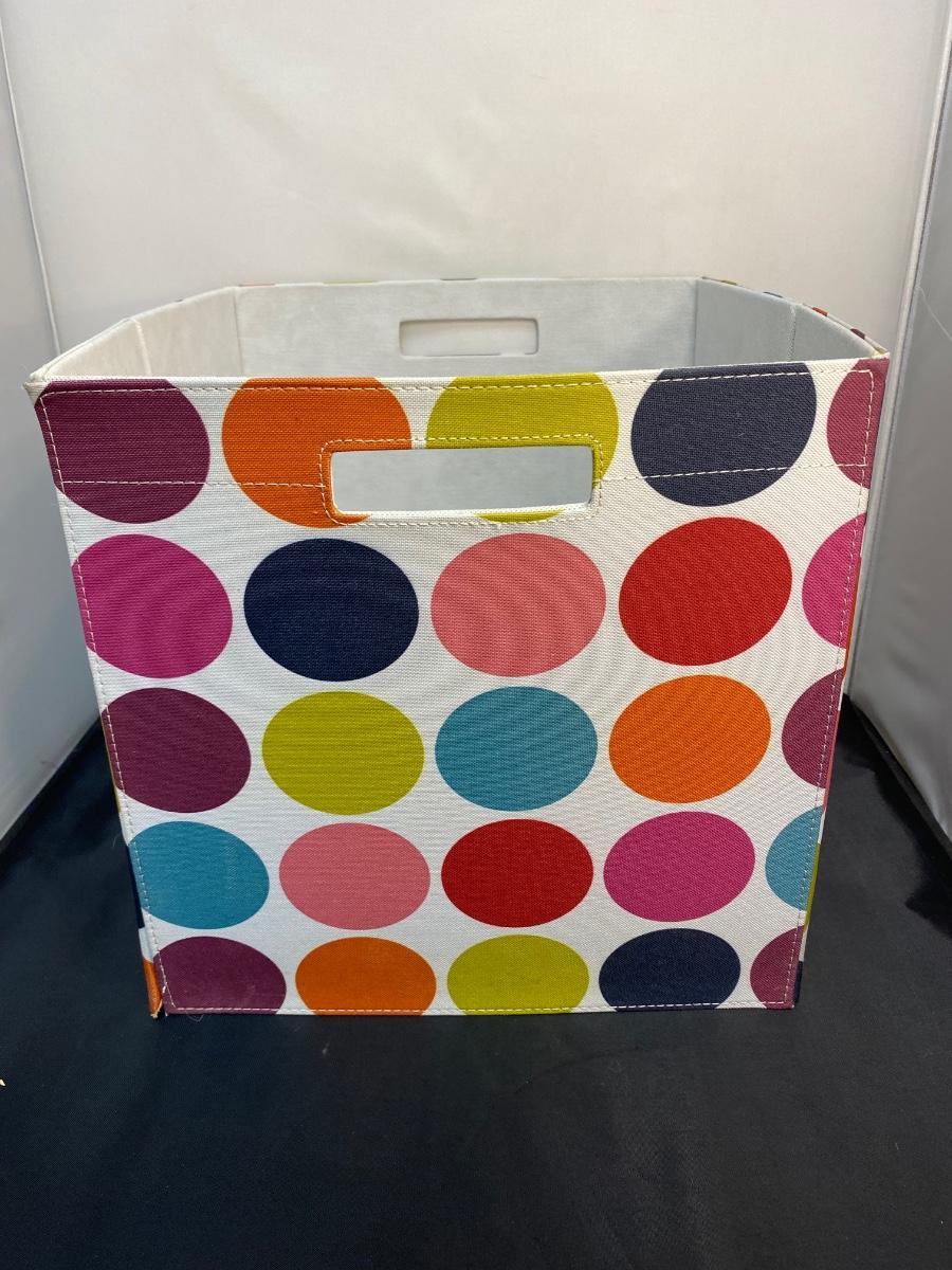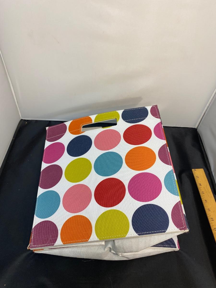 Foldable bin with colorful polka dot pattern. In good condition. About 13" size.