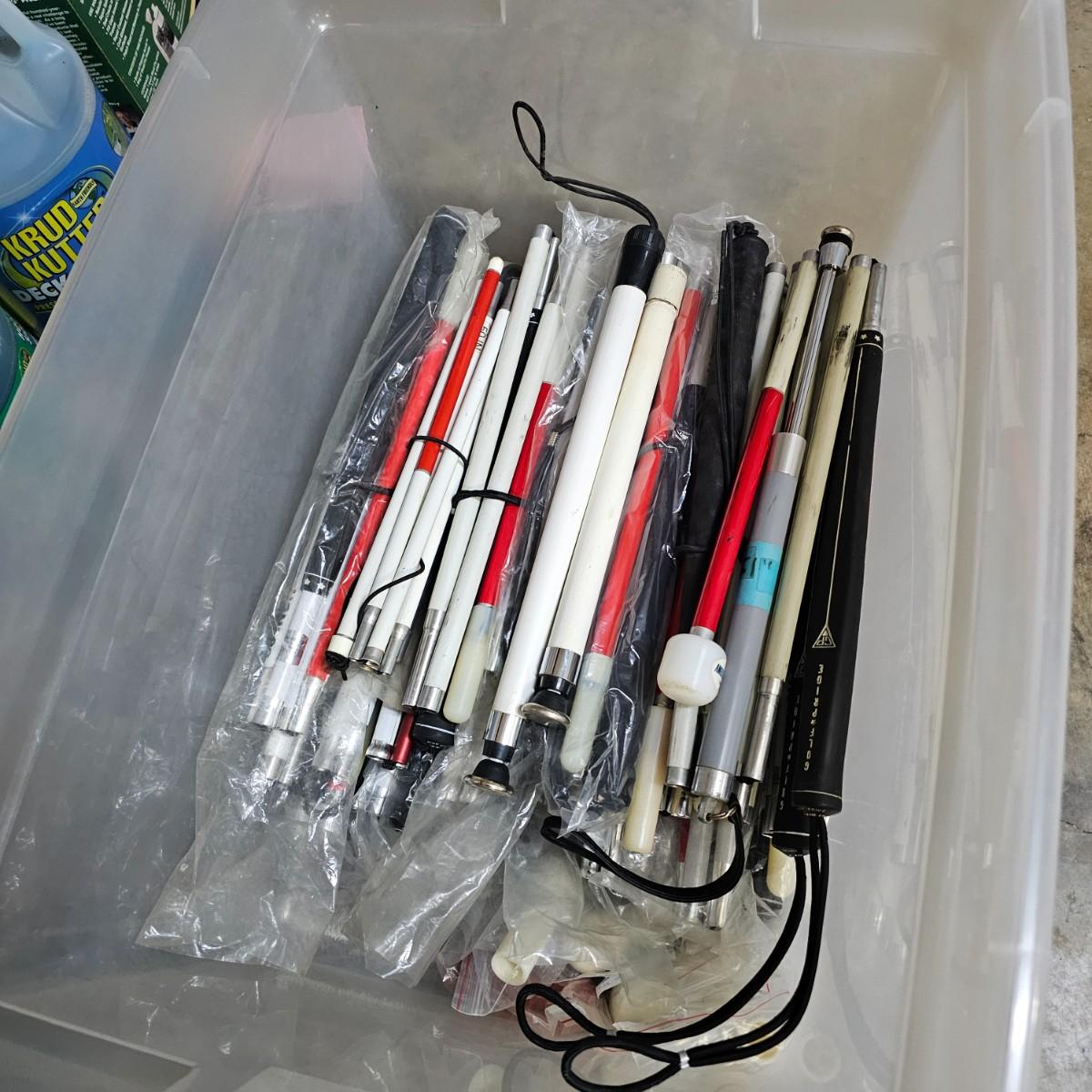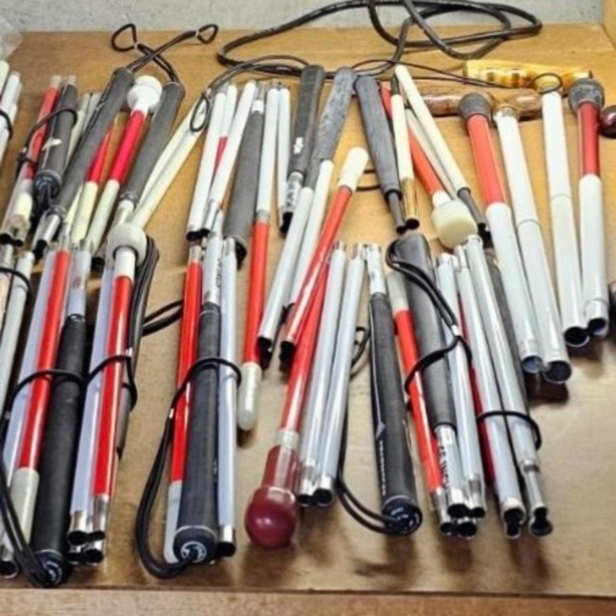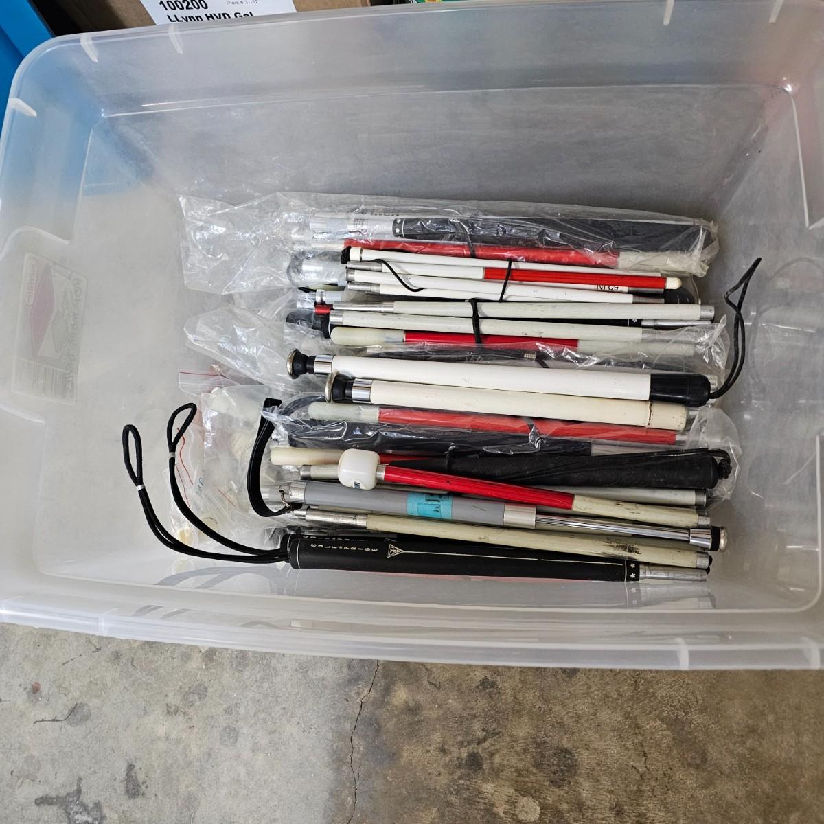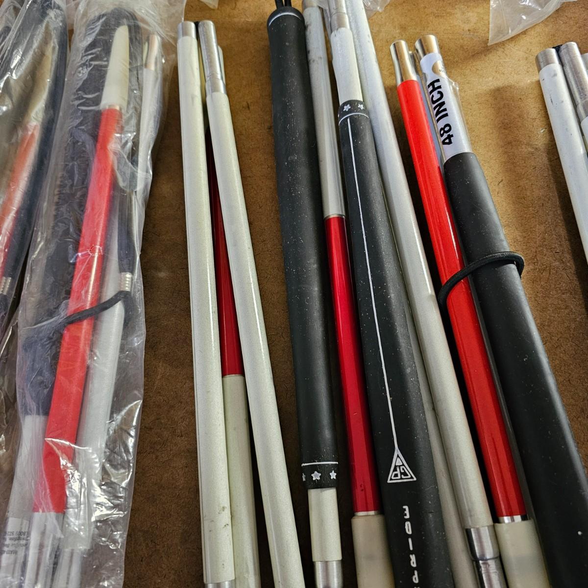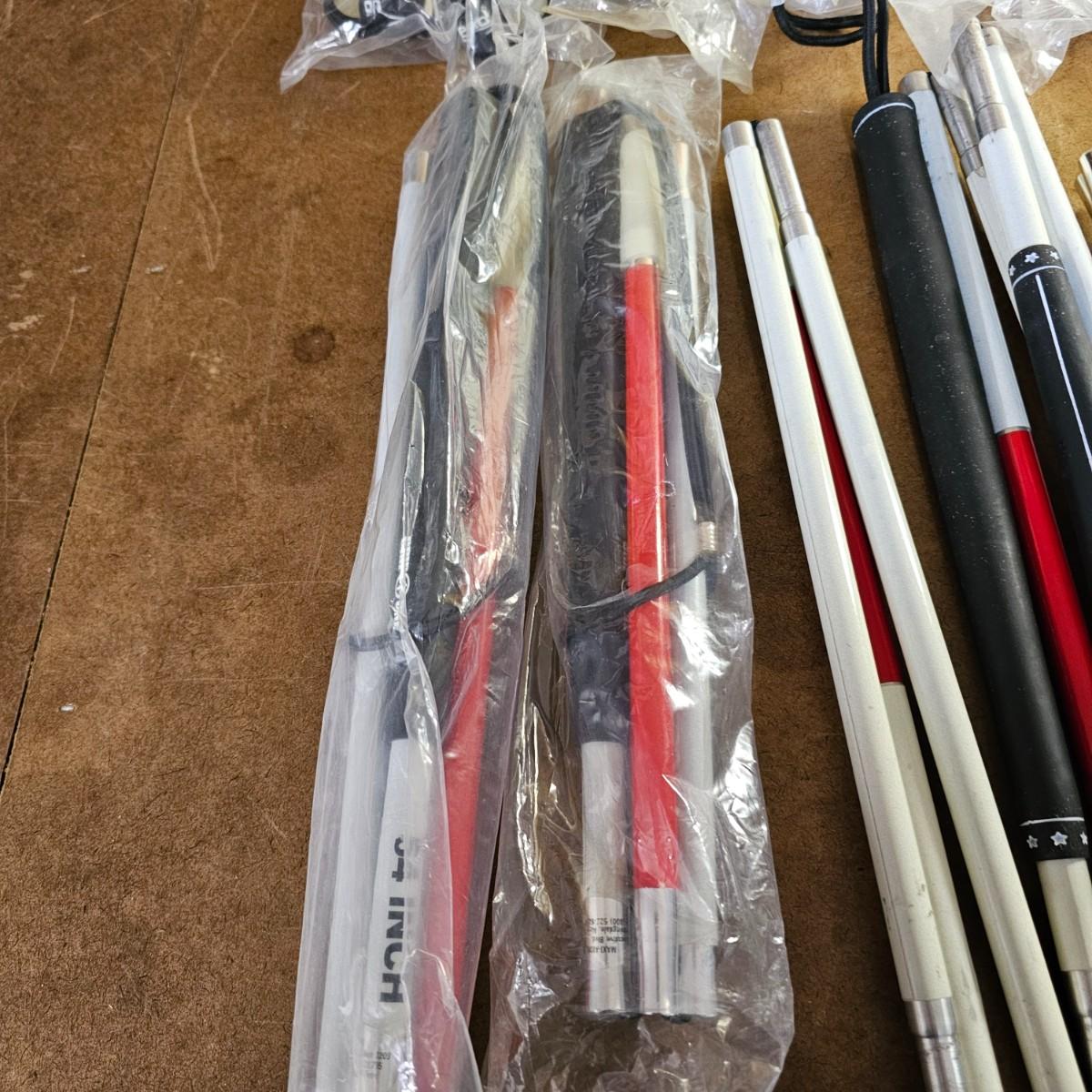 Large assortment of red tip walking canes that fold down to three, four or five short sections. Canes have a tension band inside to help extend and hold canes open when in use. Soft grip handles with lanyard hand strap. Some have wood handles. Sizes range from 46" to 60" in length. 61 pieces total, many still new in package. Storage bin included. See photos for details.