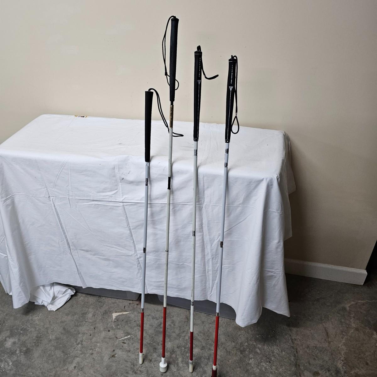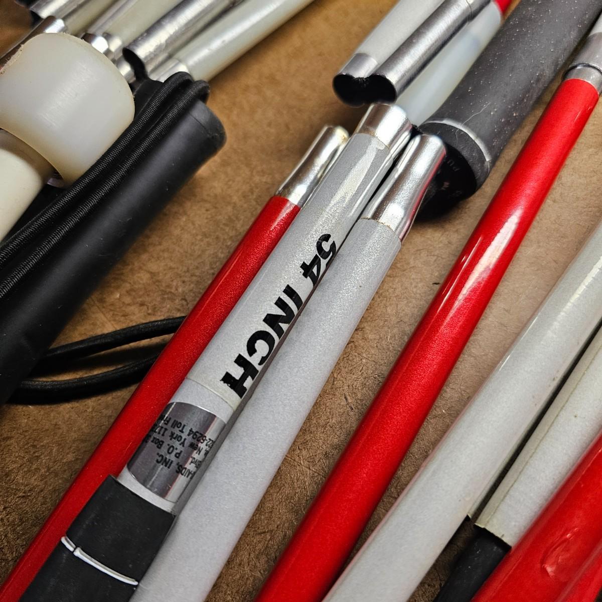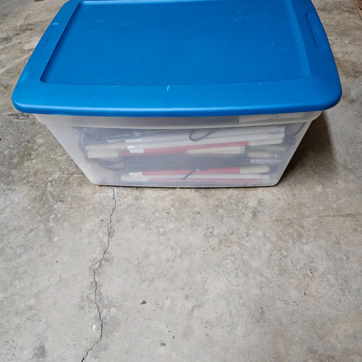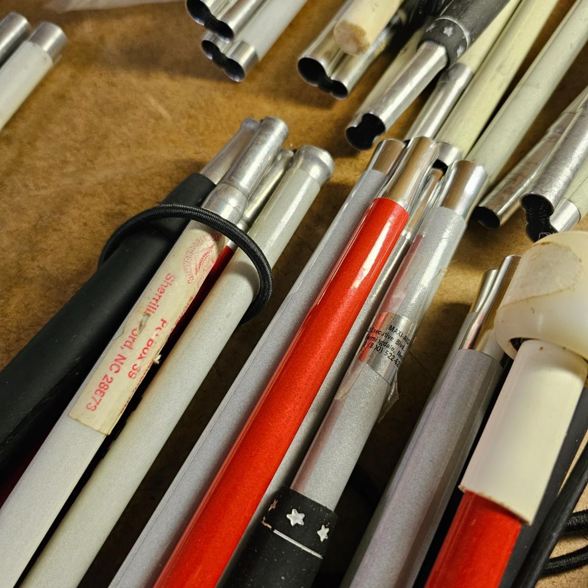 Large assortment of red tip walking canes that fold down to three, four or five short sections. Canes have a tension band inside to help extend and hold canes open when in use. Soft grip handles with lanyard hand strap. Some have wood handles. Sizes range from 46" to 60" in length. 61 pieces total, many still new in package. Storage bin included. See photos for details.