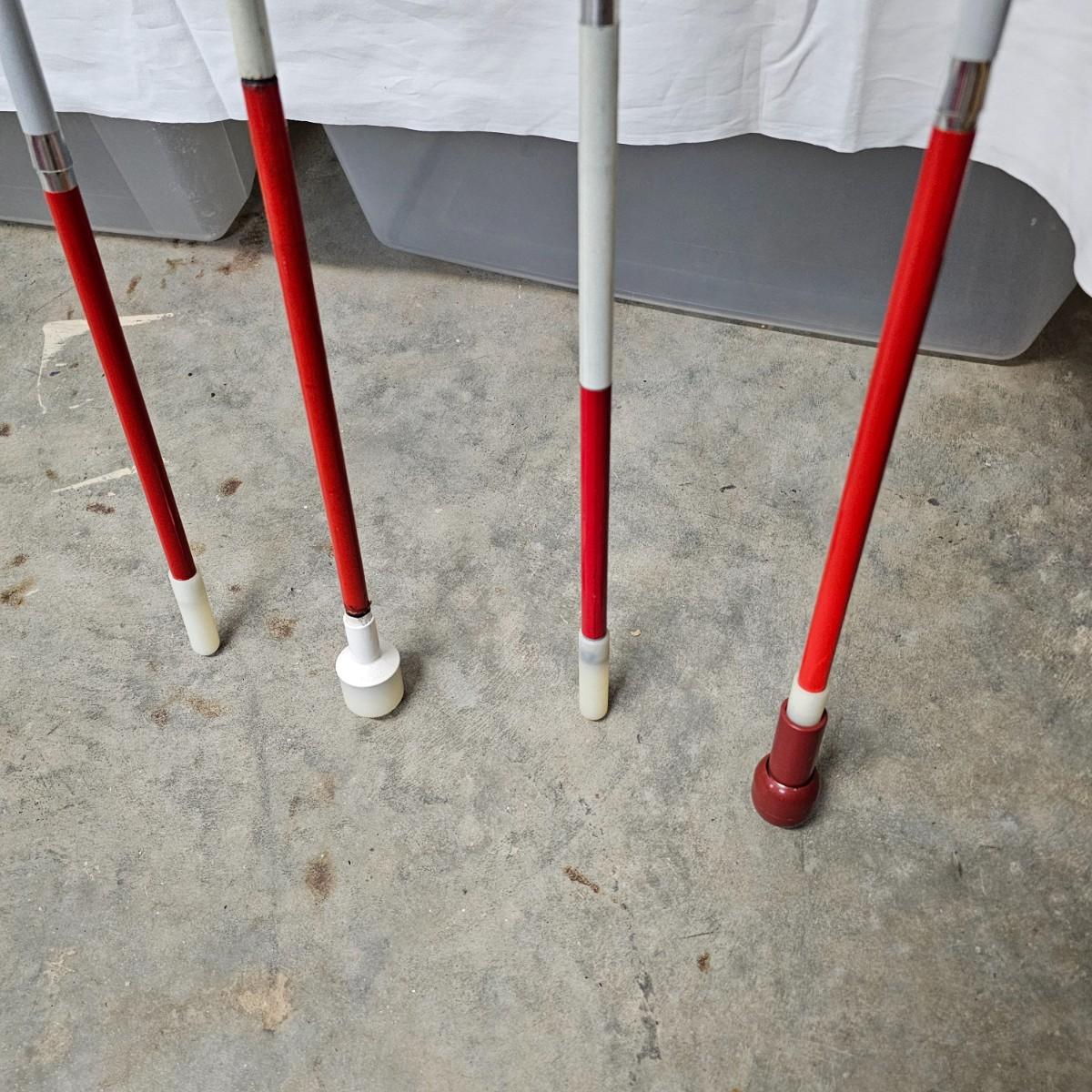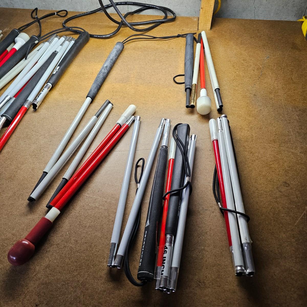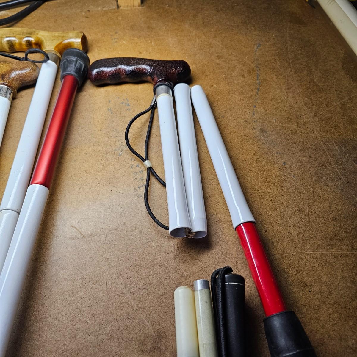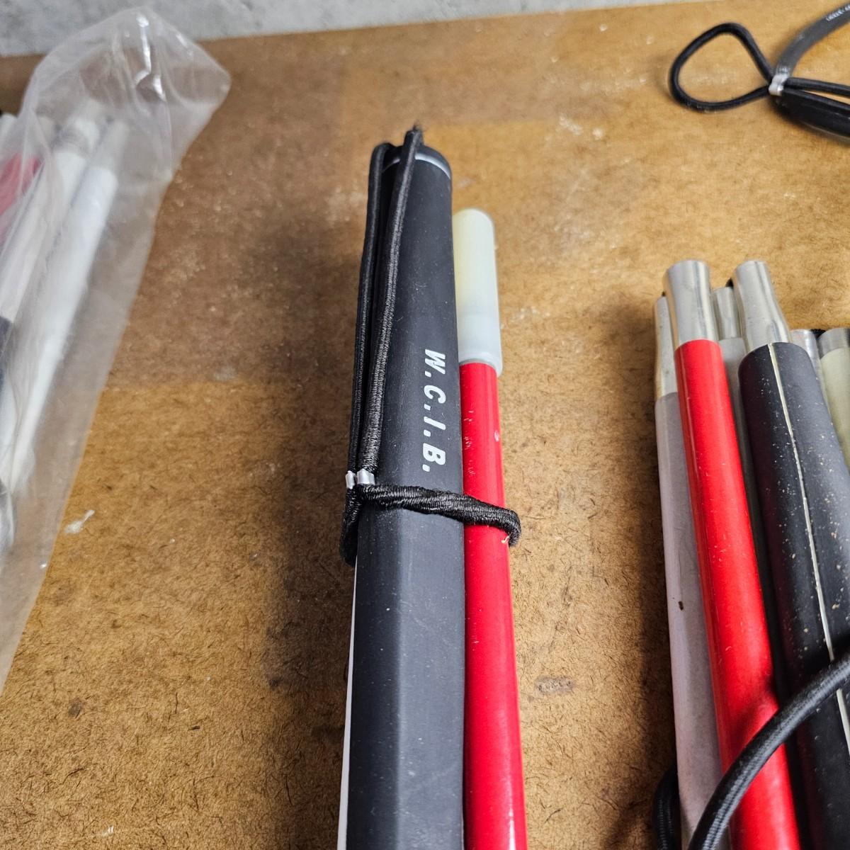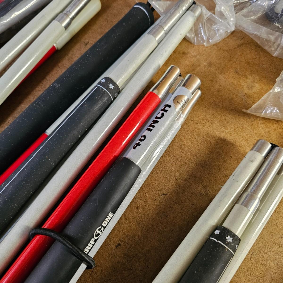 Large assortment of red tip walking canes that fold down to three, four or five short sections. Canes have a tension band inside to help extend and hold canes open when in use. Soft grip handles with lanyard hand strap. Some have wood handles. Sizes range from 46" to 60" in length. 61 pieces total, many still new in package. Storage bin included. See photos for details.