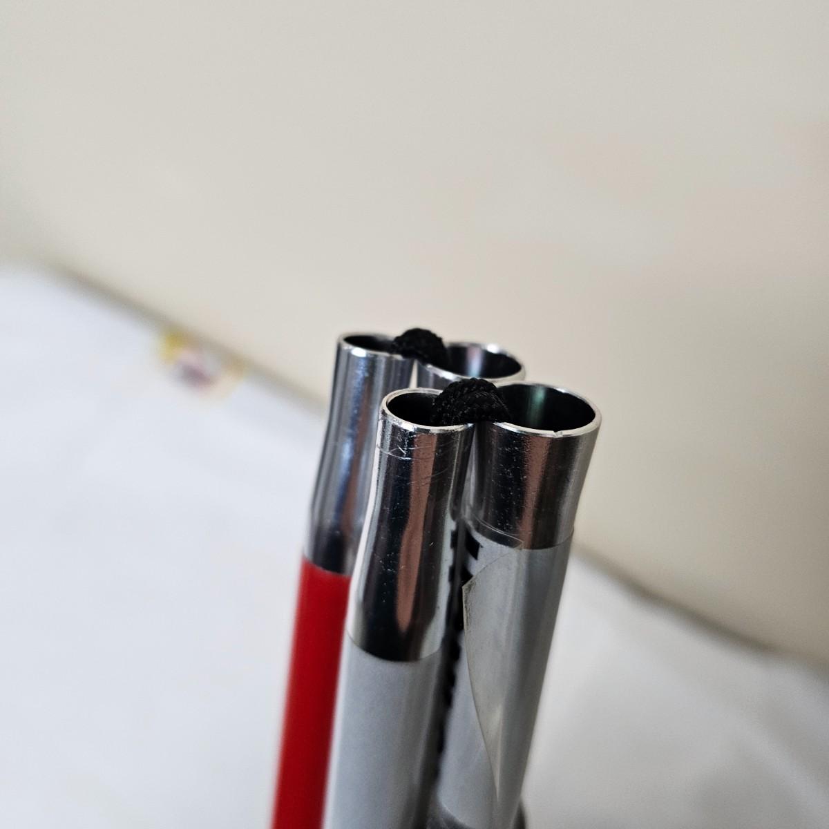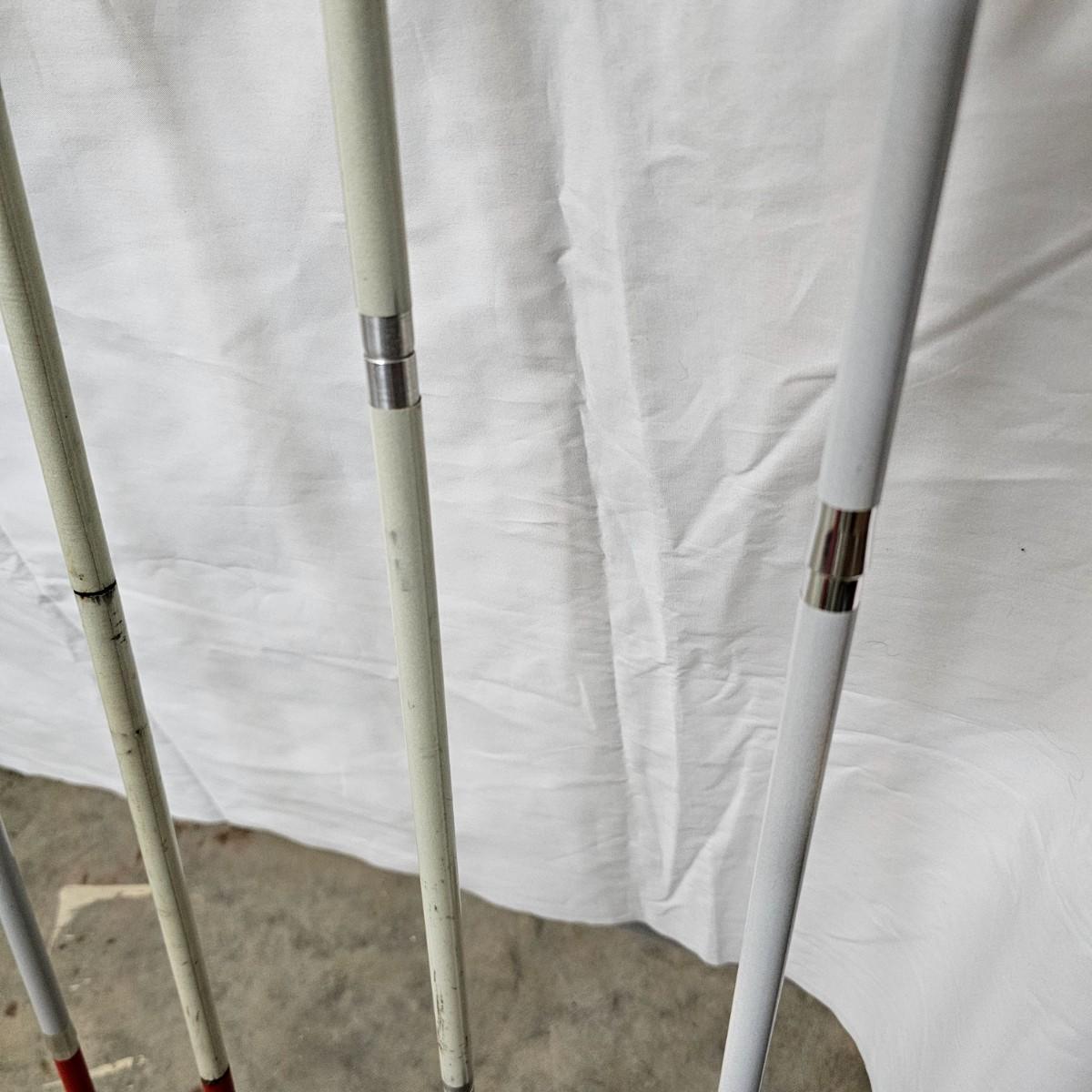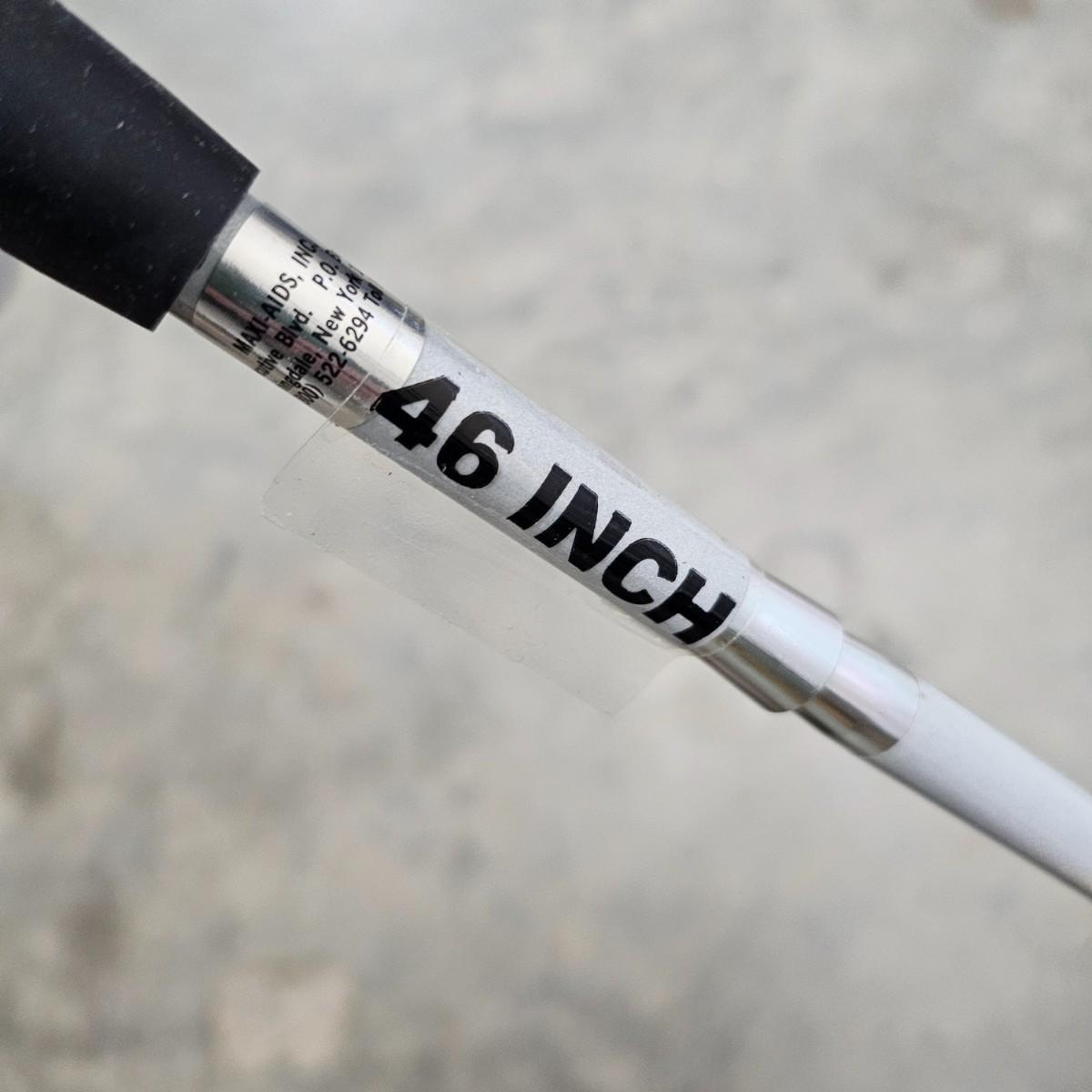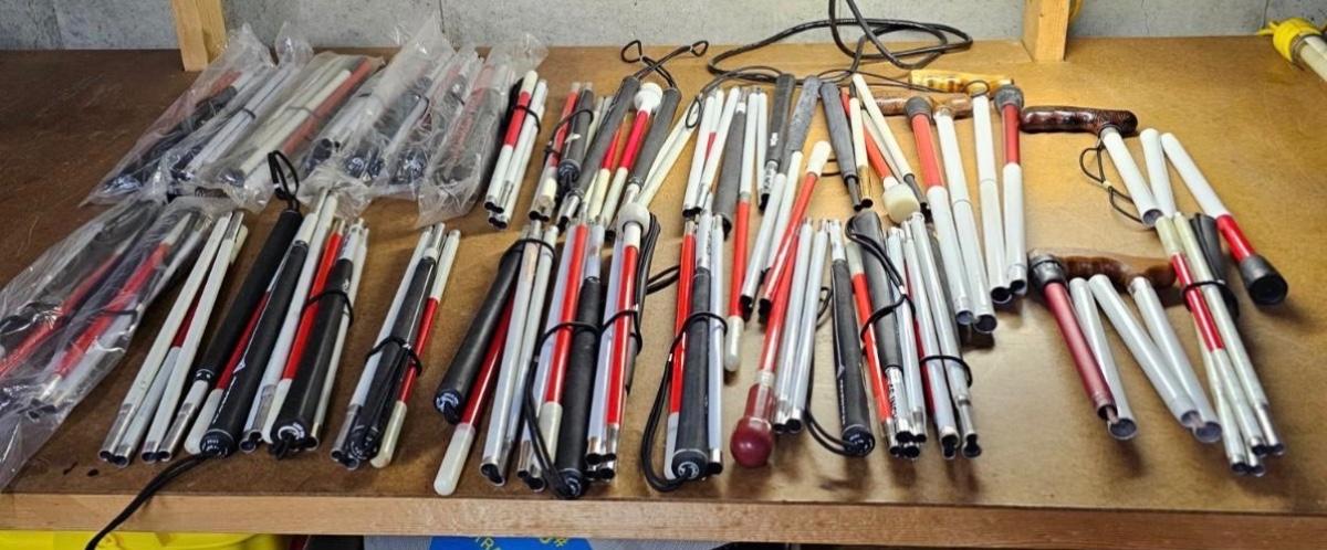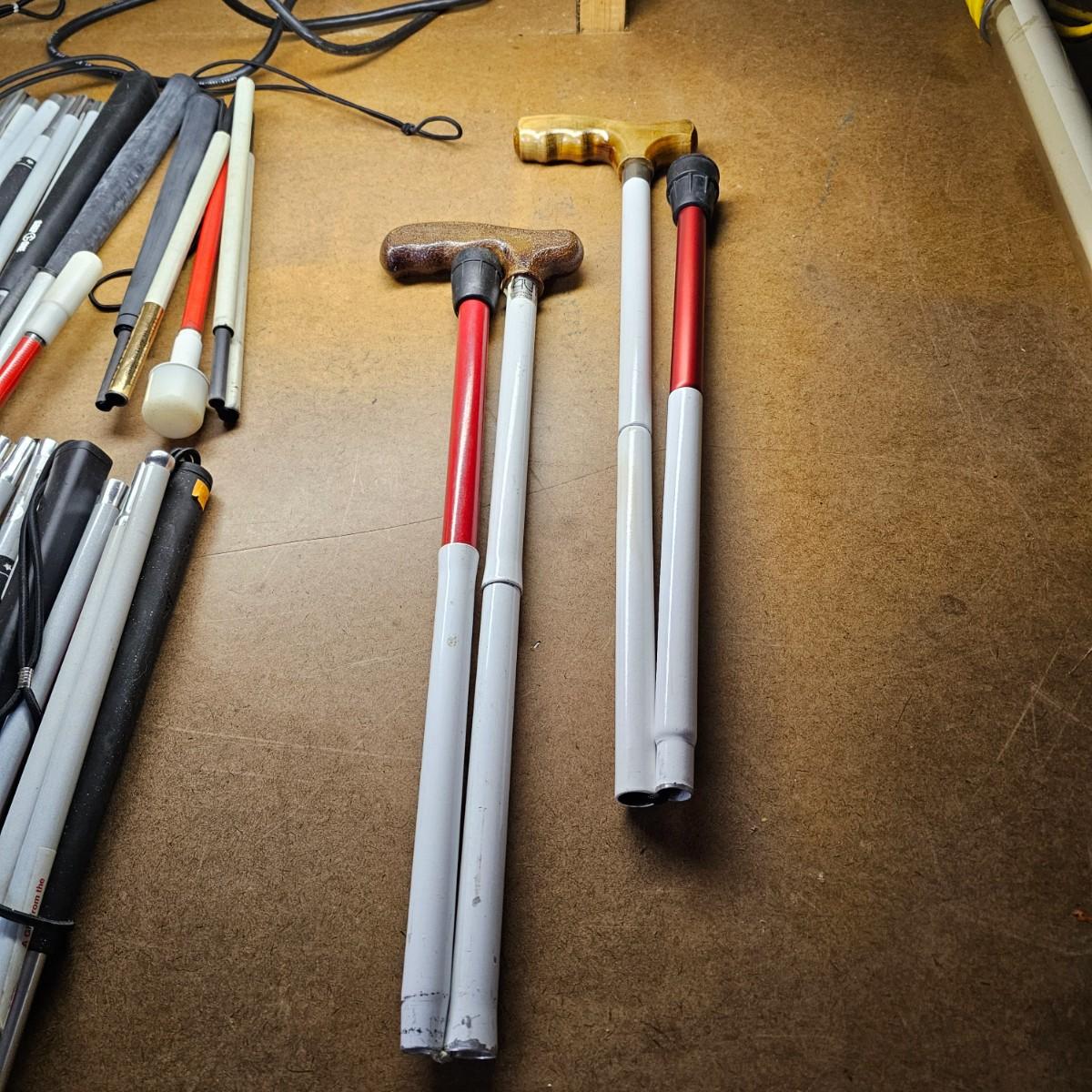 Large assortment of red tip walking canes that fold down to three, four or five short sections. Canes have a tension band inside to help extend and hold canes open when in use. Soft grip handles with lanyard hand strap. Some have wood handles. Sizes range from 46" to 60" in length. 61 pieces total, many still new in package. Storage bin included. See photos for details.