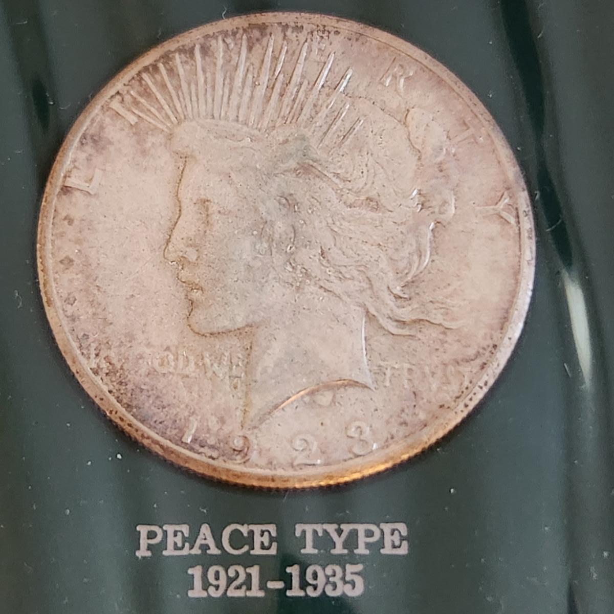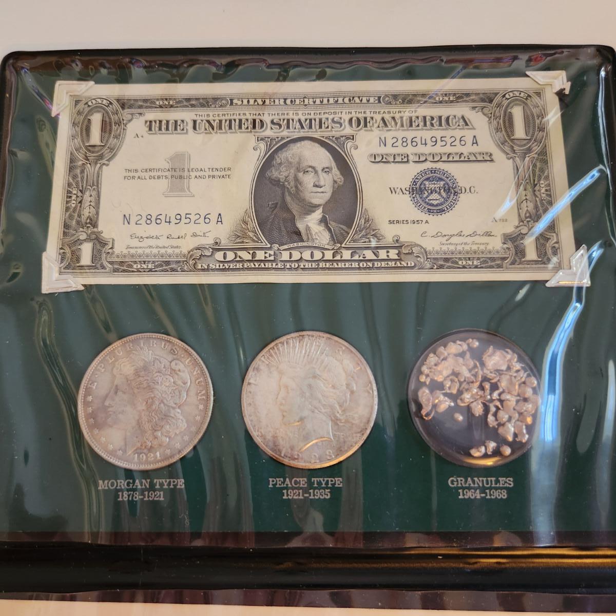 This auction lot is for The Silver Story Foldered Coin Collection with Silver Certificate - Lot A. This folder holds a Silver Certificate One Dollar Bill, series 1957A, a Morgan Silver Dollar dated 1921, a Peace Silver Dollar dated 1923 and a capsule of uncertified silver granules with the printed Silver Story. This item is KY sales tax-exempt.