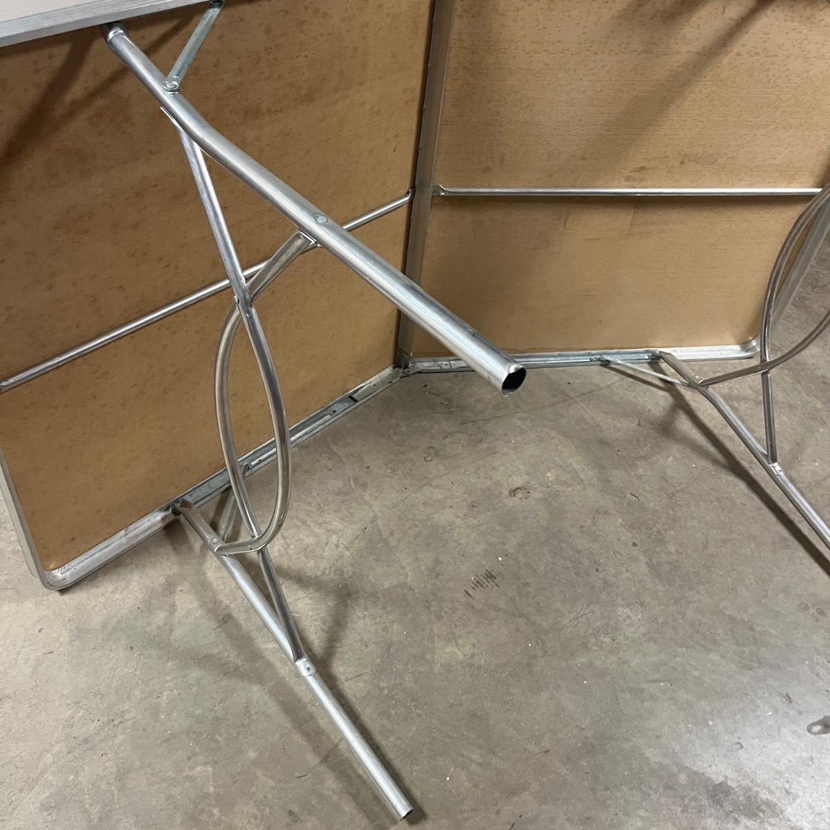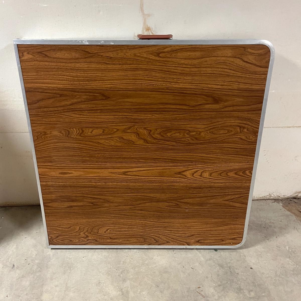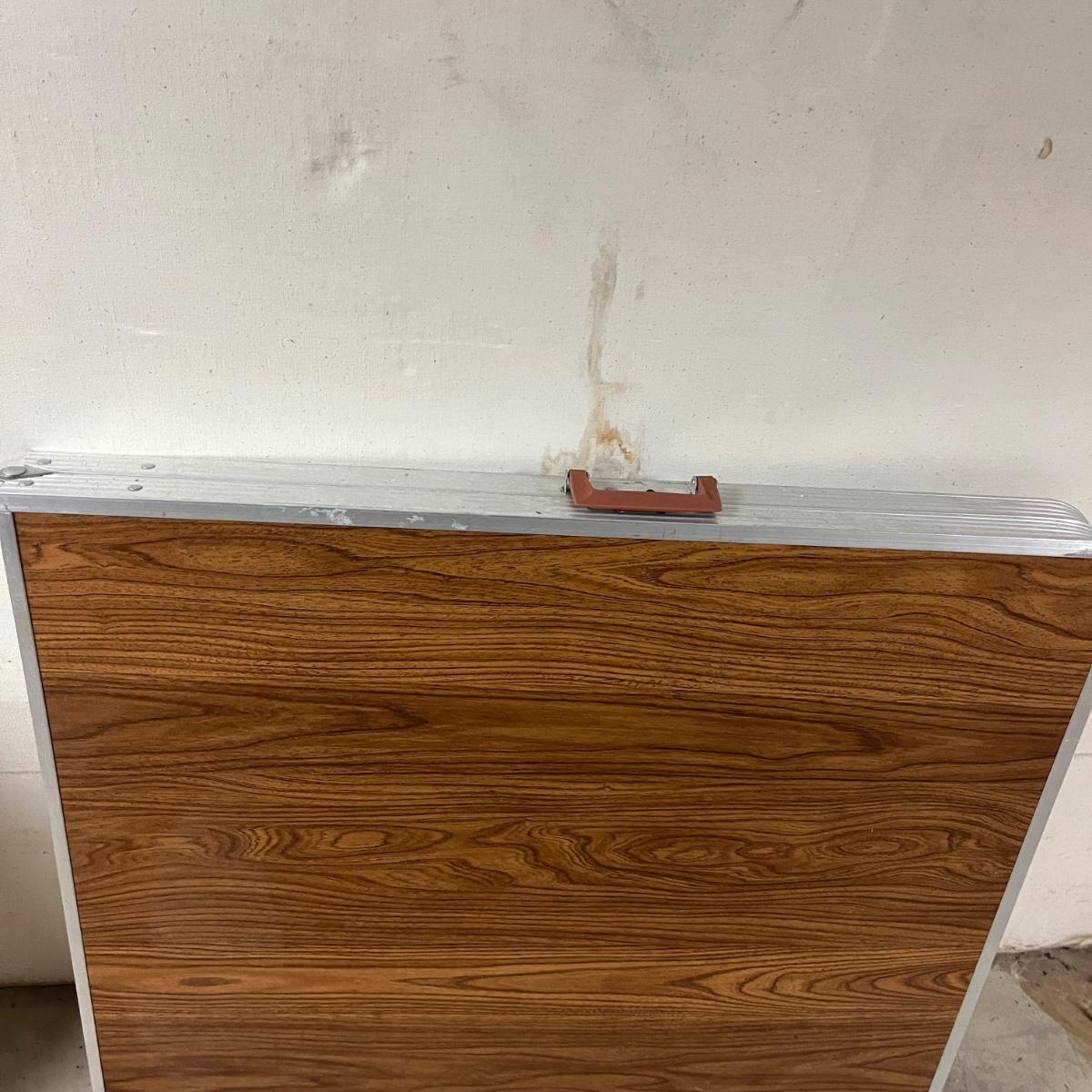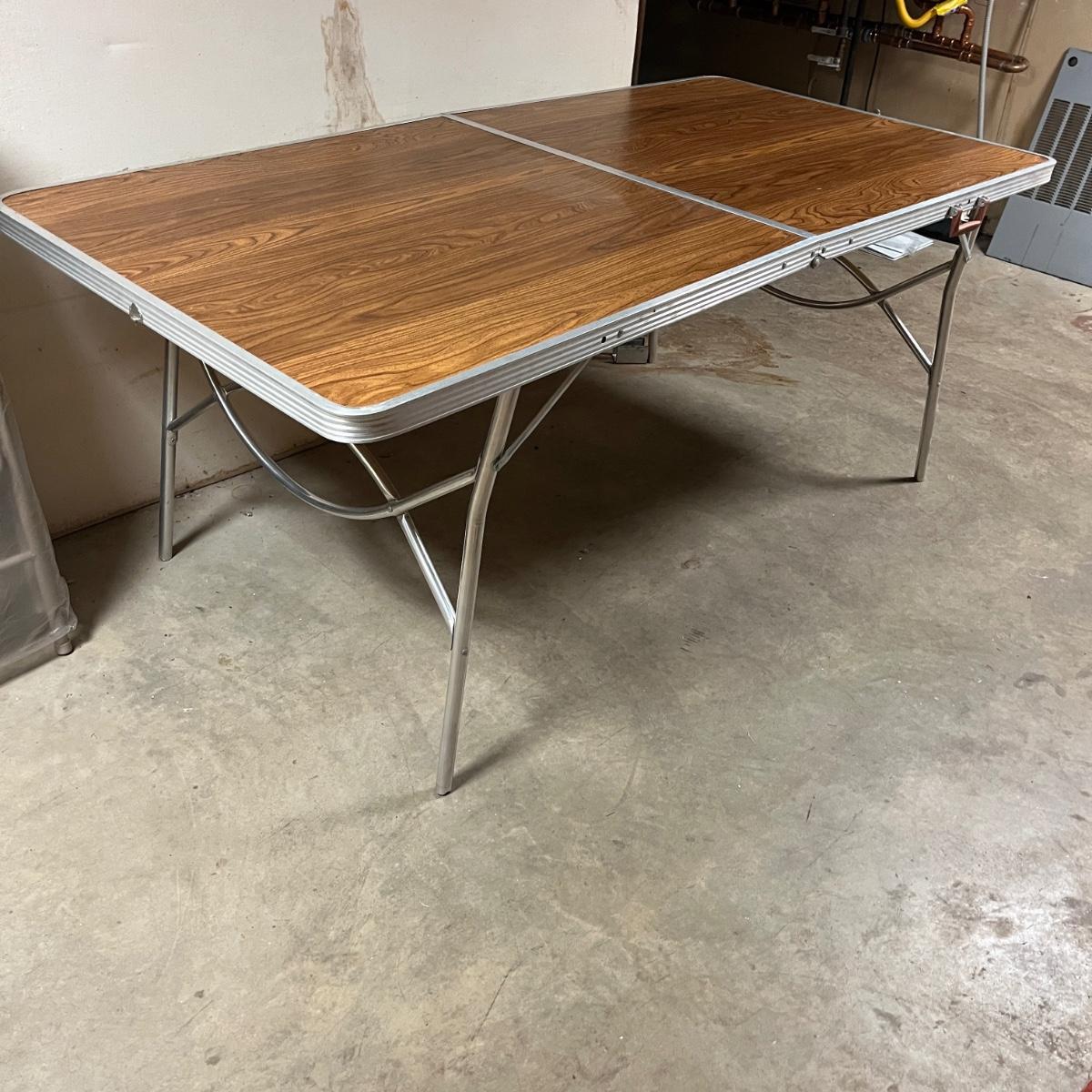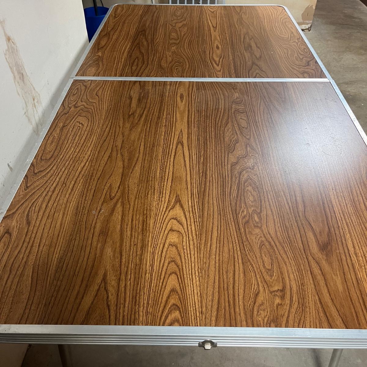 Lot includes a folding aluminum table with a faux wood top. Table measures 72” x 36” x 29”H when open.