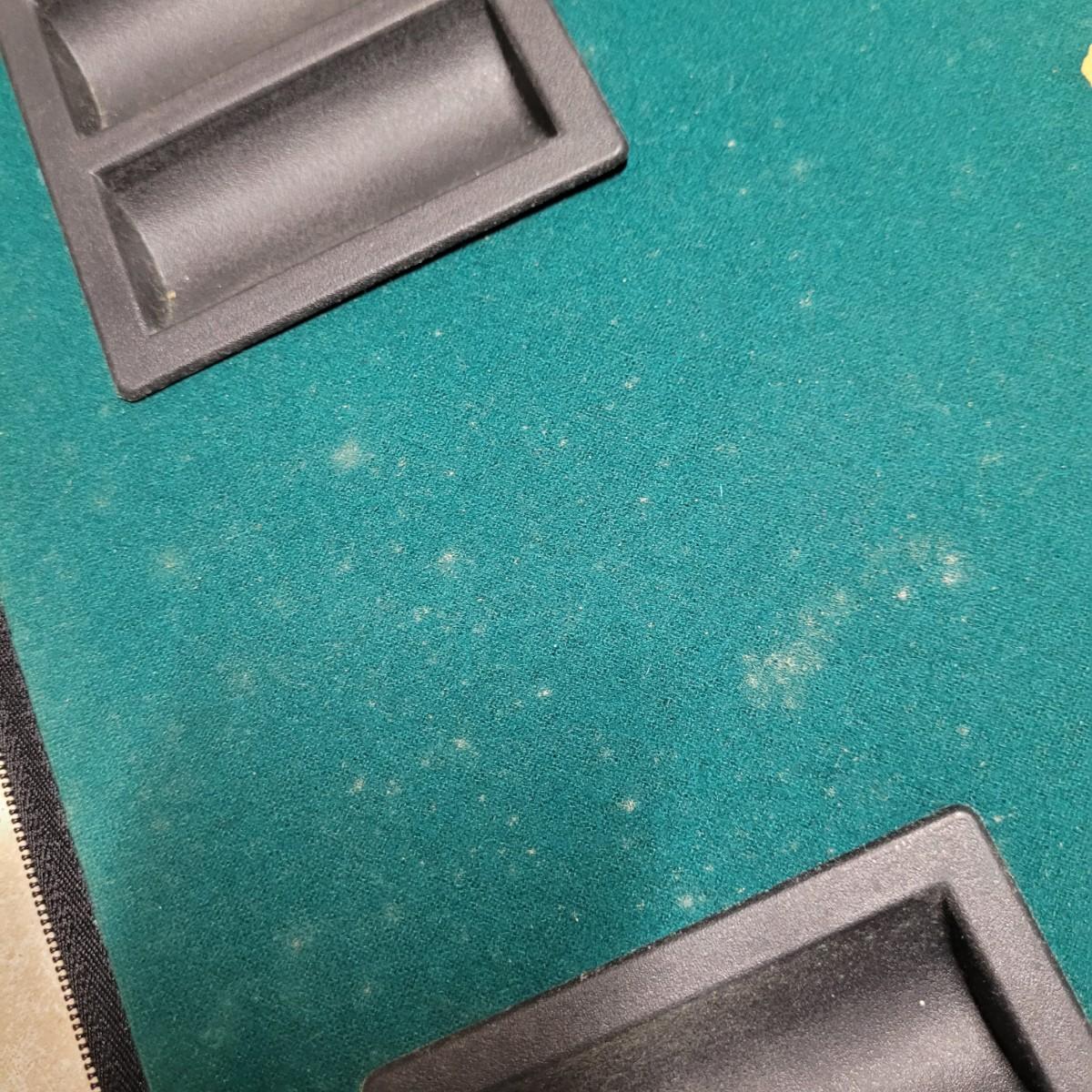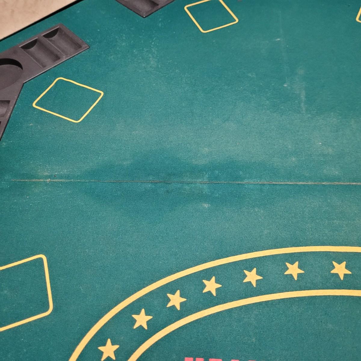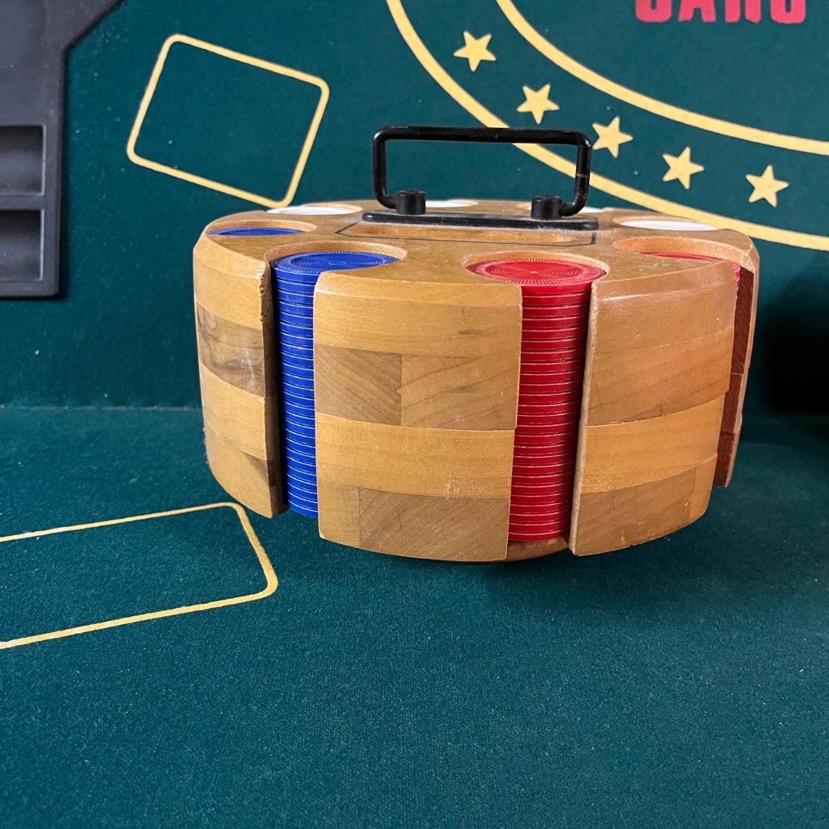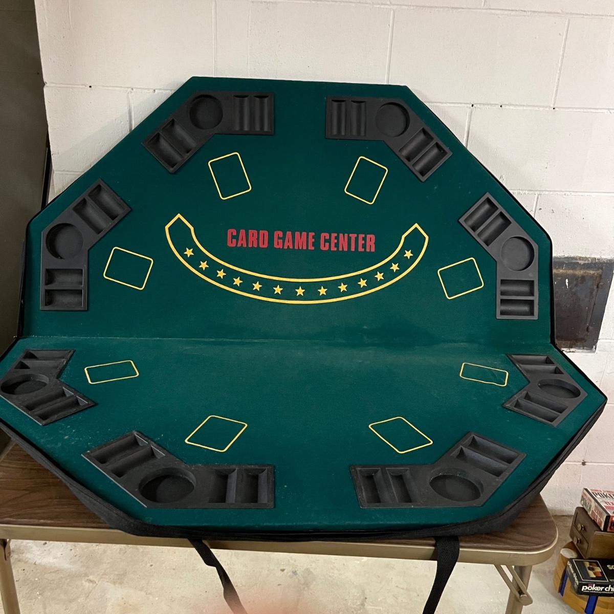 Lot includes a folding octagon shaped card table top, two wooden chip holders with plastic chips, card shuffler, cards and a pack of plastic poker chips. The table has been stored in a basement and the felt is damp with some mildew, see pictures. Table measures 48” x 48”.