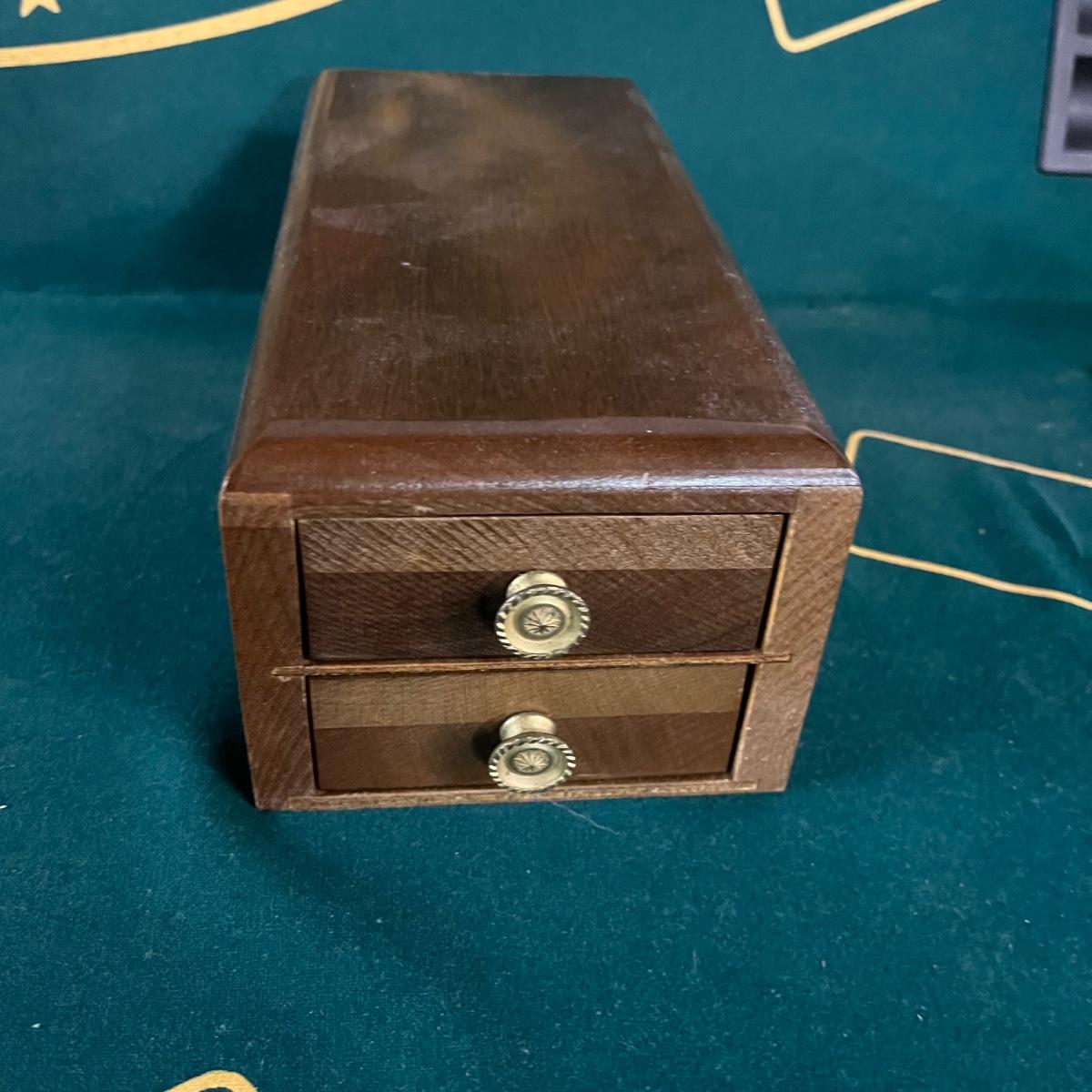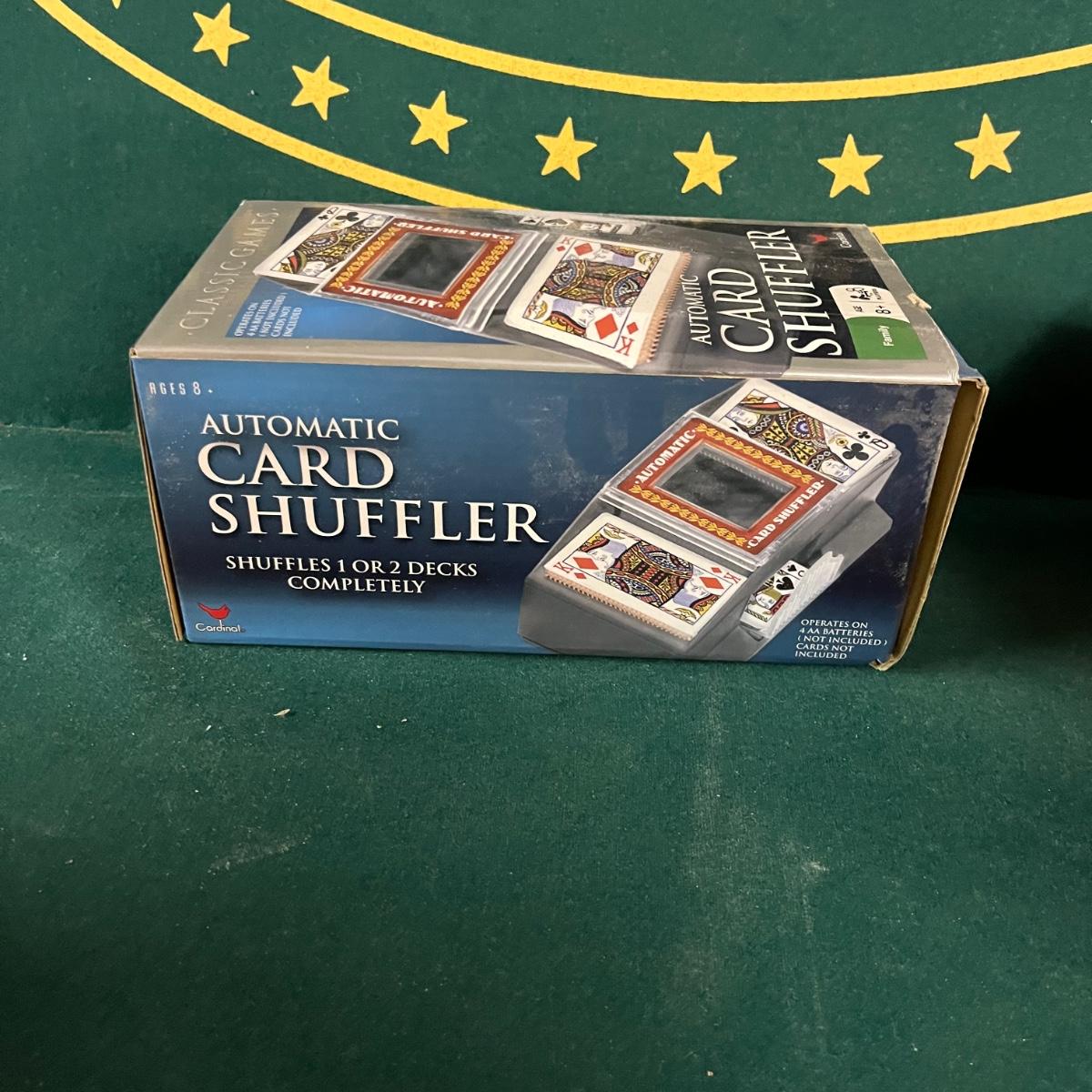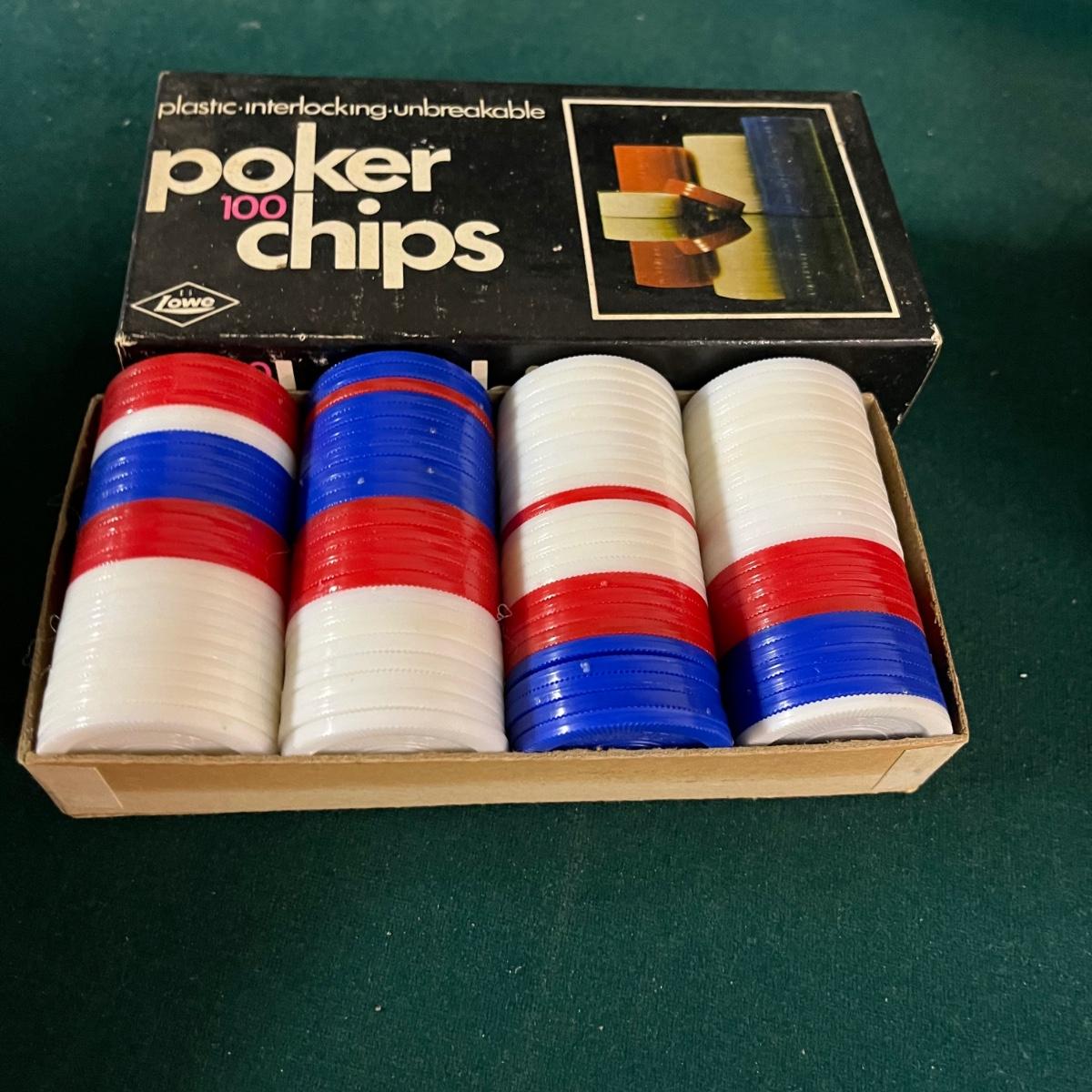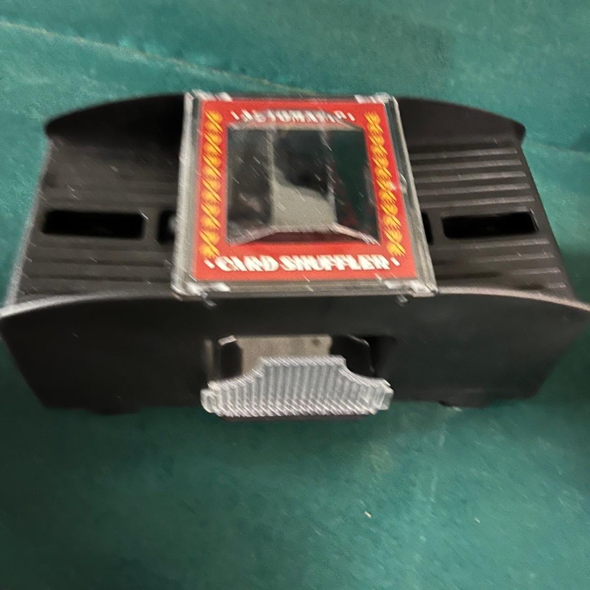Lot includes a folding octagon shaped card table top, two wooden chip holders with plastic chips, card shuffler, cards and a pack of plastic poker chips. The table has been stored in a basement and the felt is damp with some mildew, see pictures. Table measures 48” x 48”.