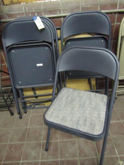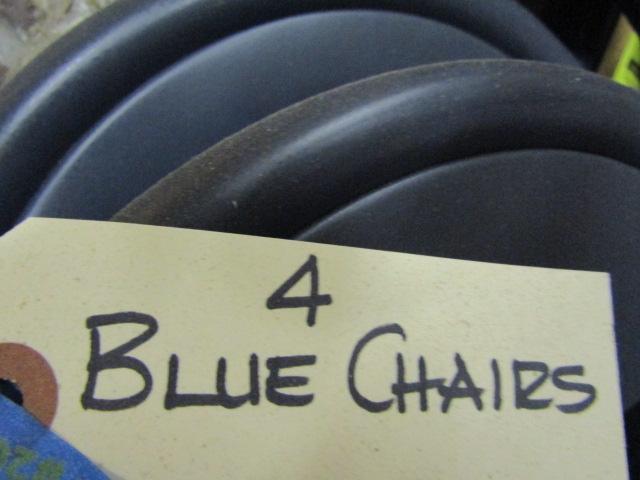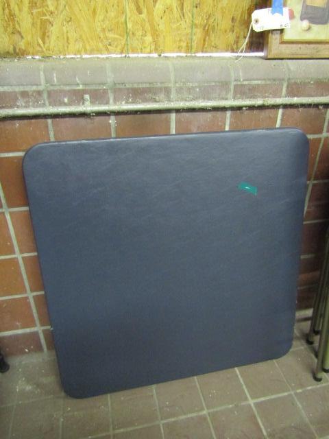 Folding Card Table and Four Chairs: Blue (Loc). Table is 32 1/2" Square and has a small tear on top. Please See Pictures.