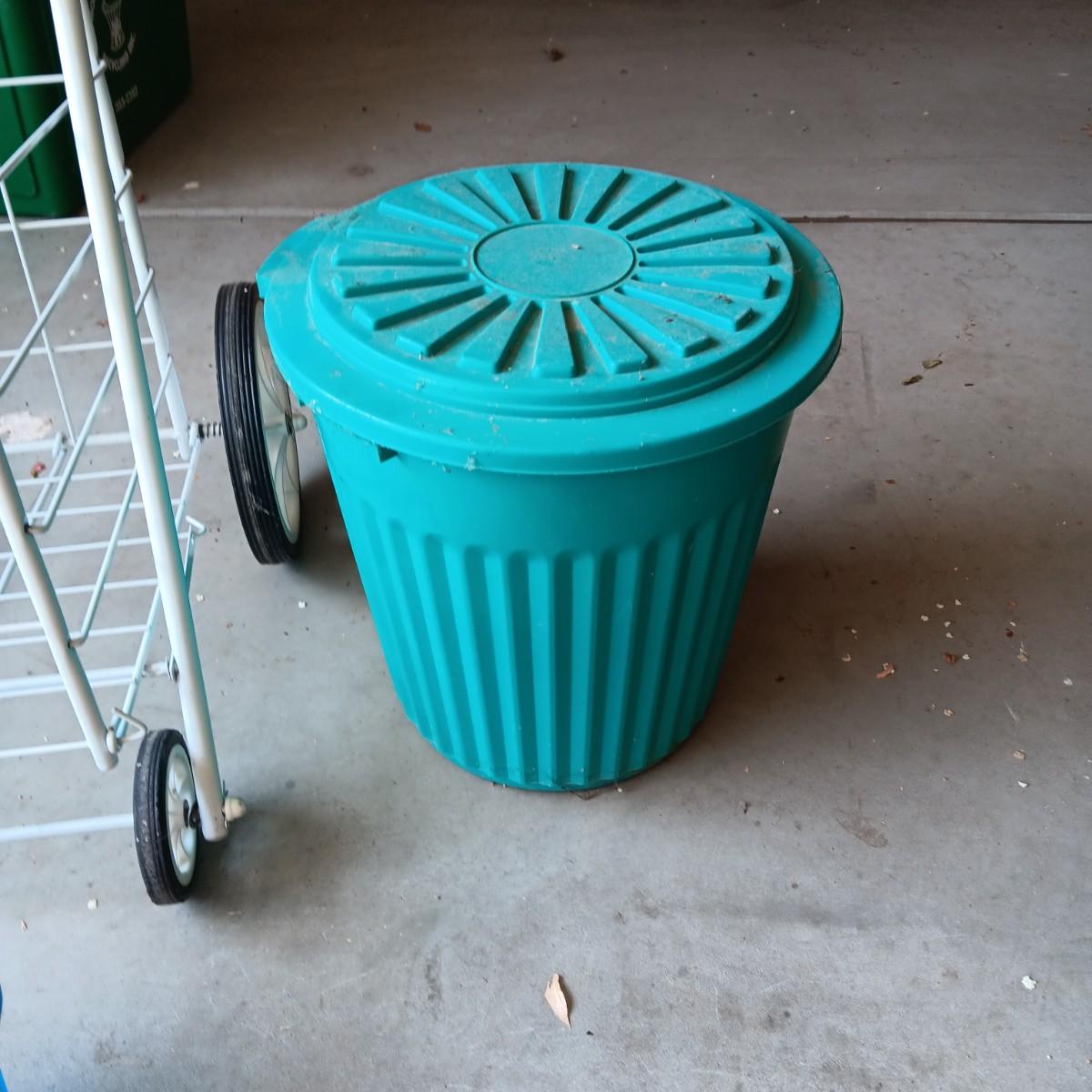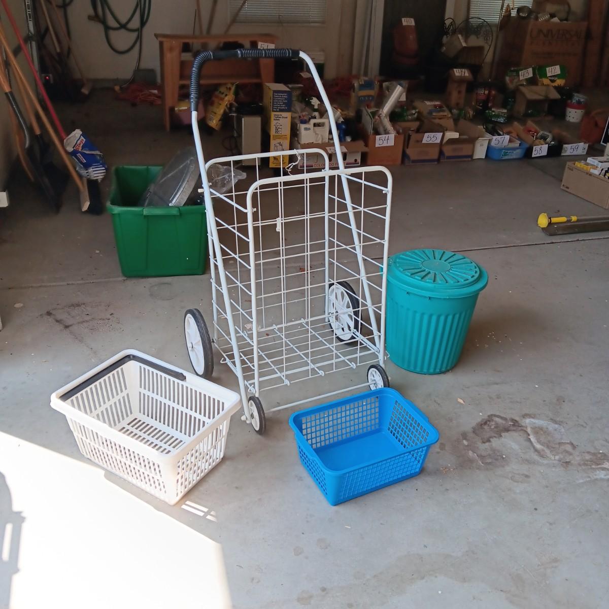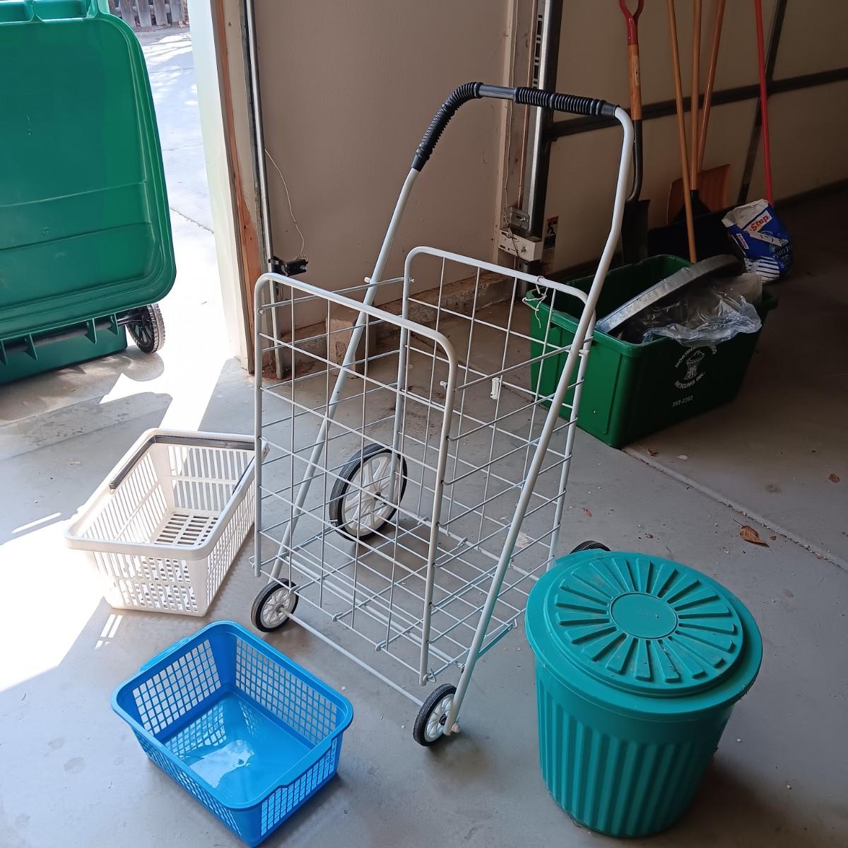 FOLDING CART, SMALL TRASH CAN AND PLASTIC BASKETS