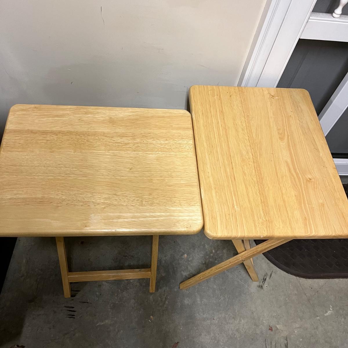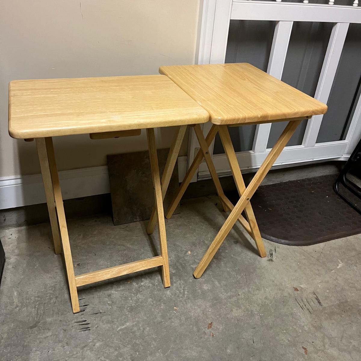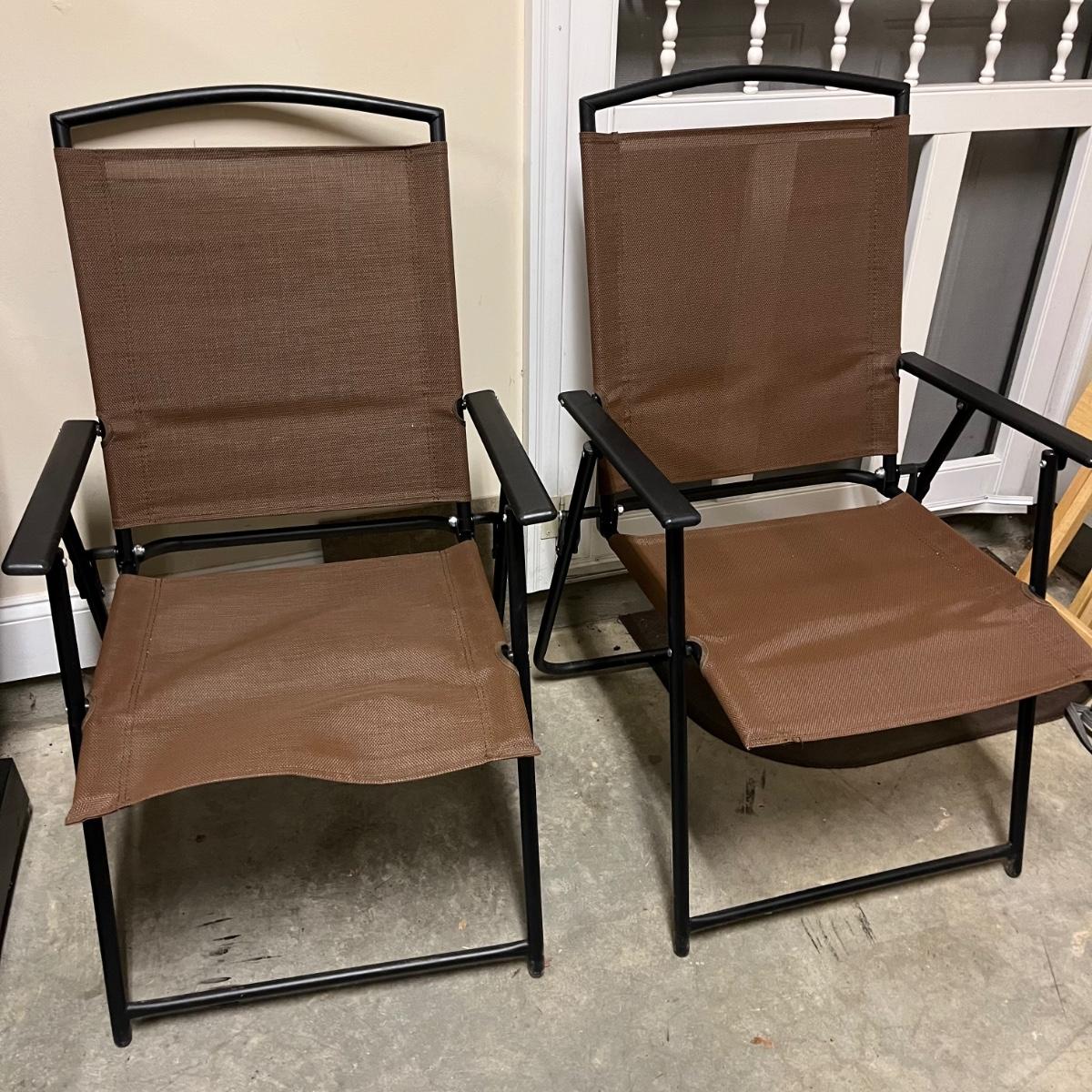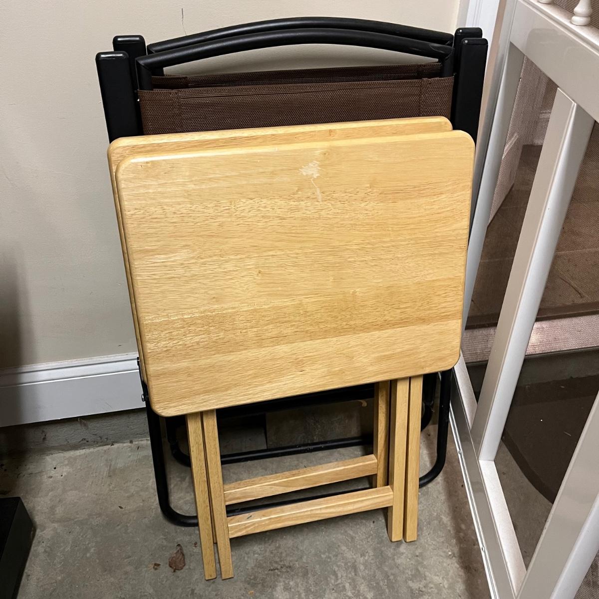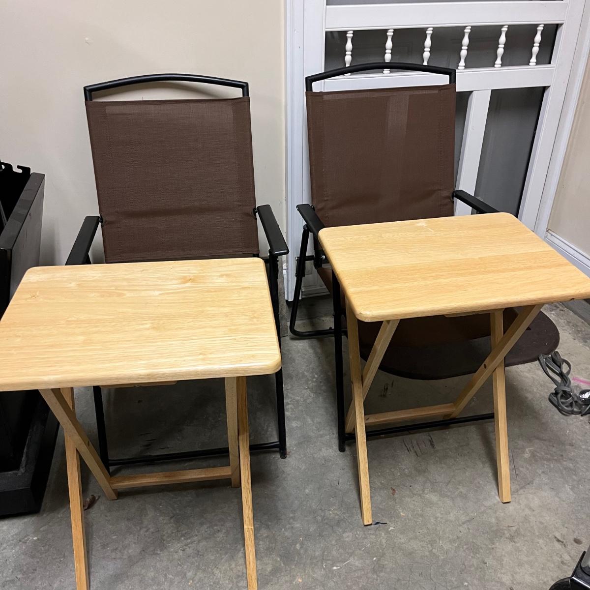Lot includes two metal folding chairs with nylon type fabric and two wooden TV trays.
