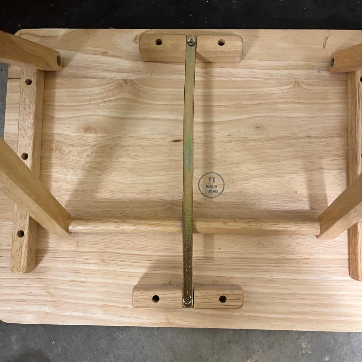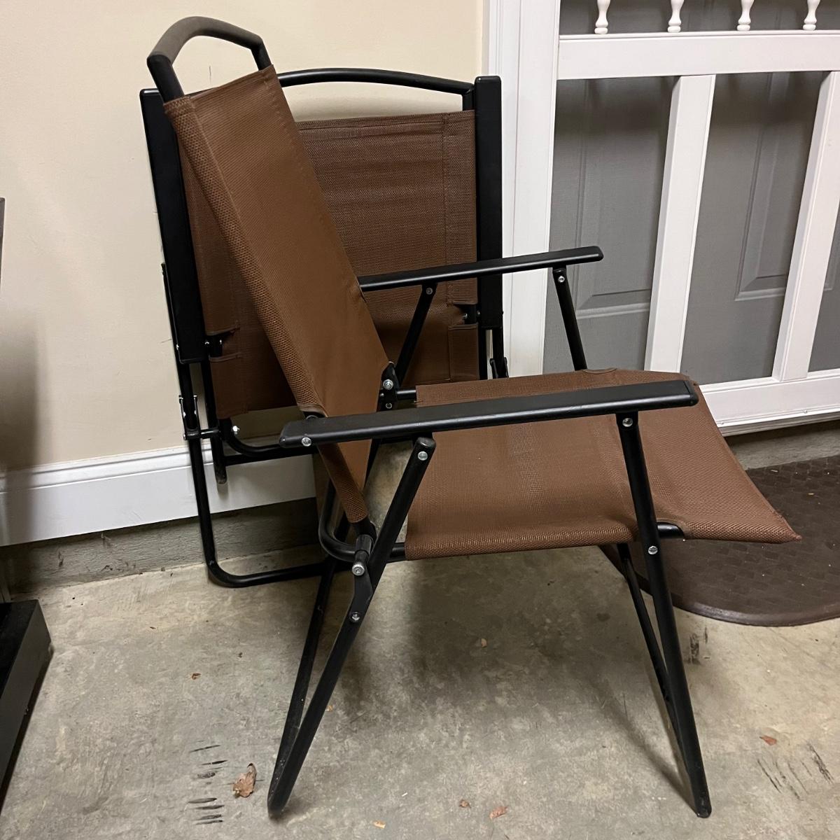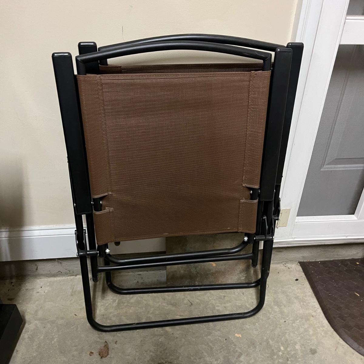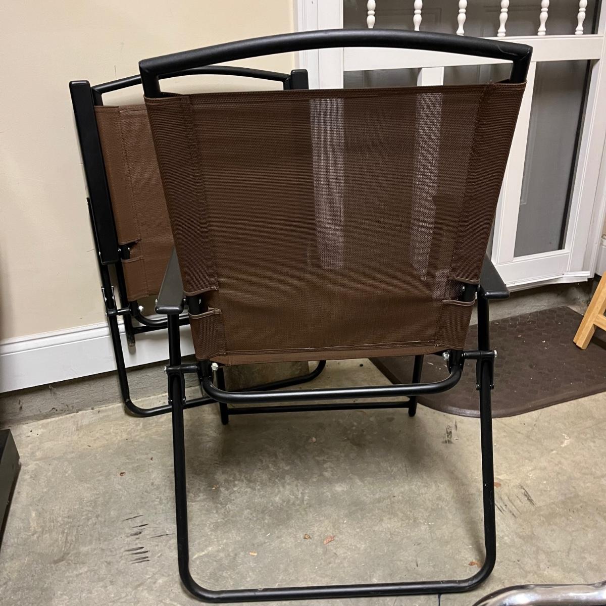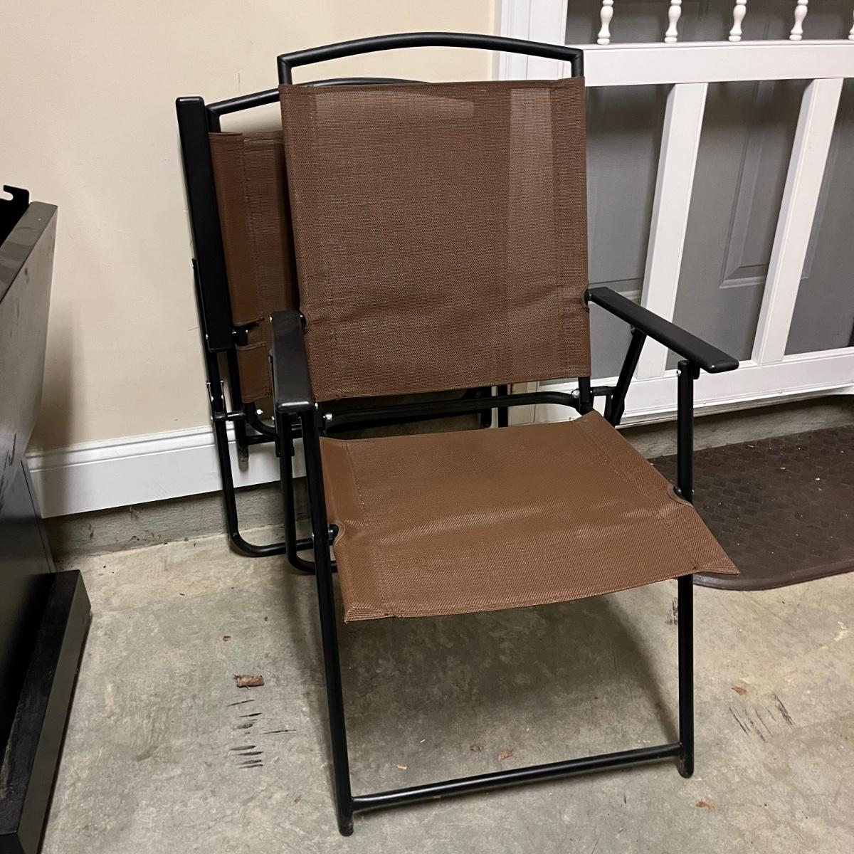 Lot includes two metal folding chairs with nylon type fabric and two wooden TV trays.