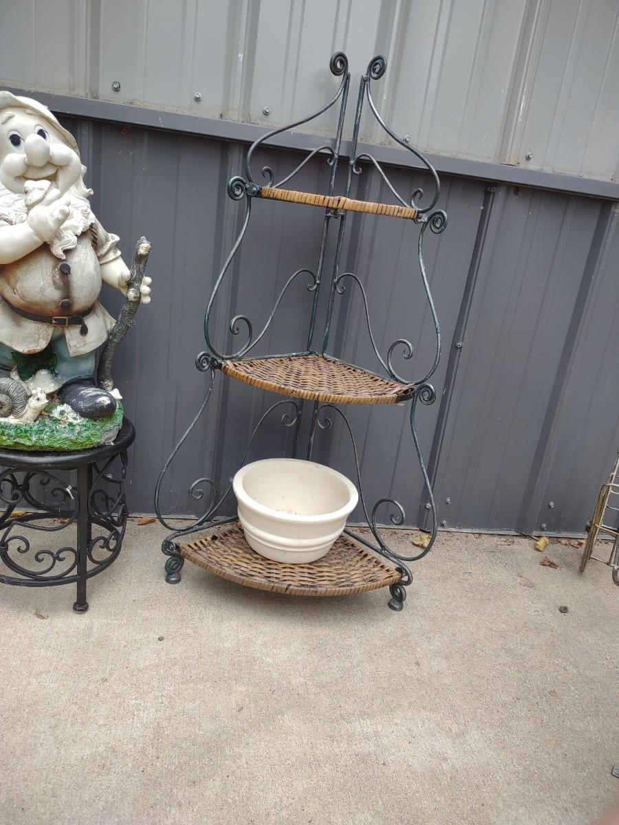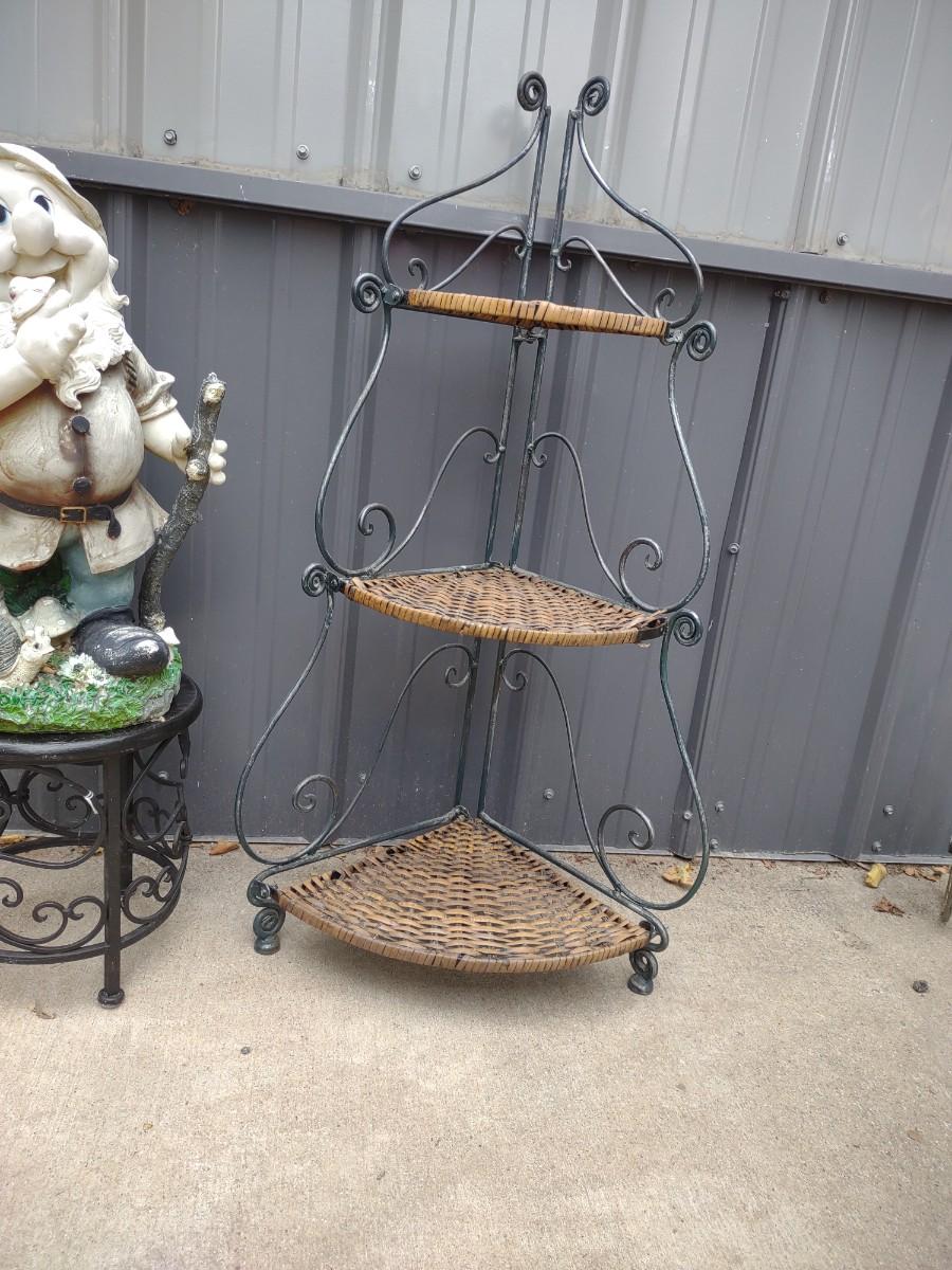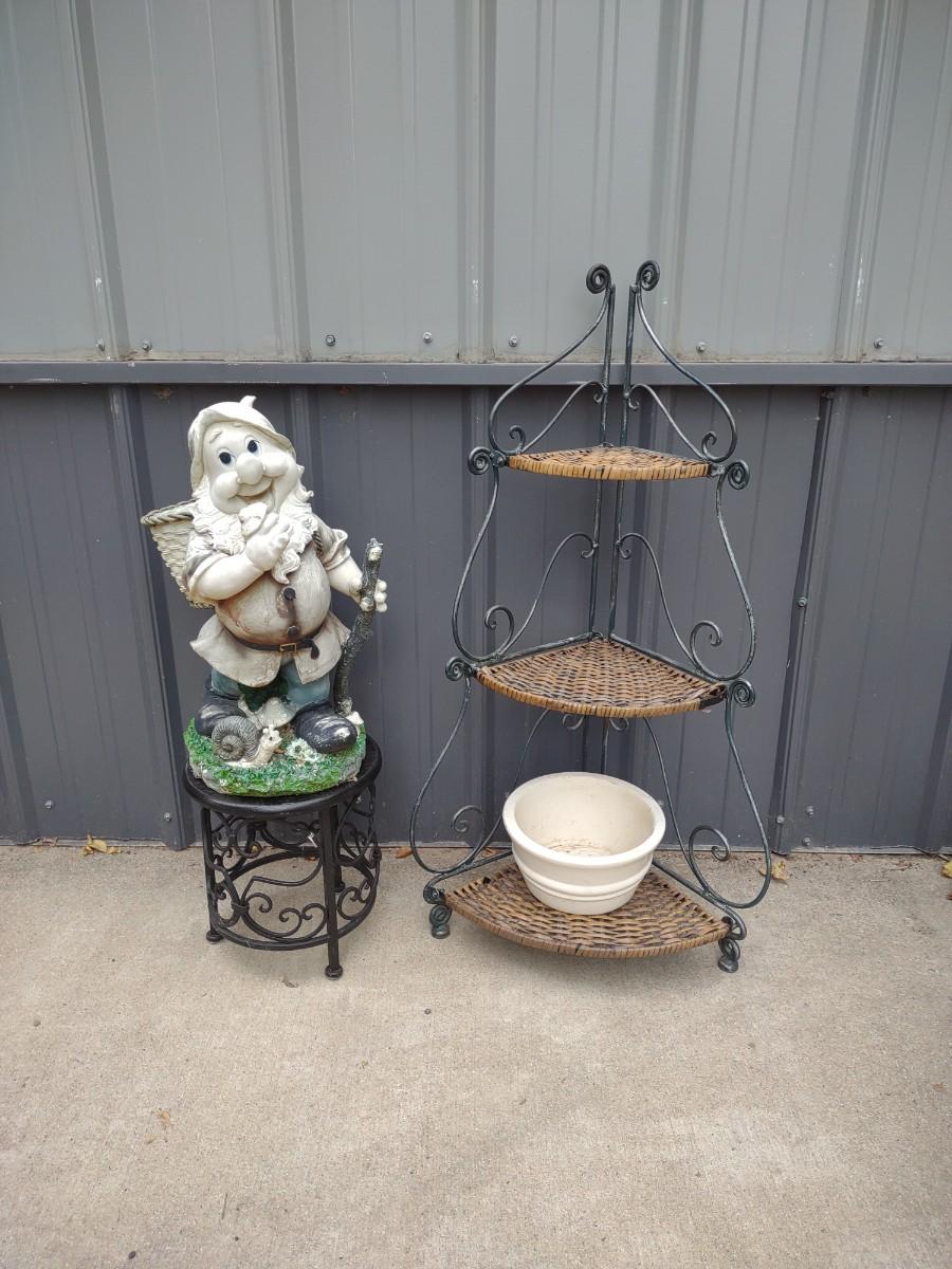 FOLDING CORNER WICKER STAND AND 1 OF THE 7 DWARFS? ON A METAL PLANT STAND