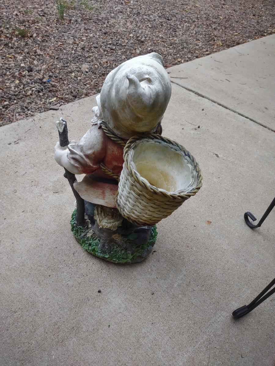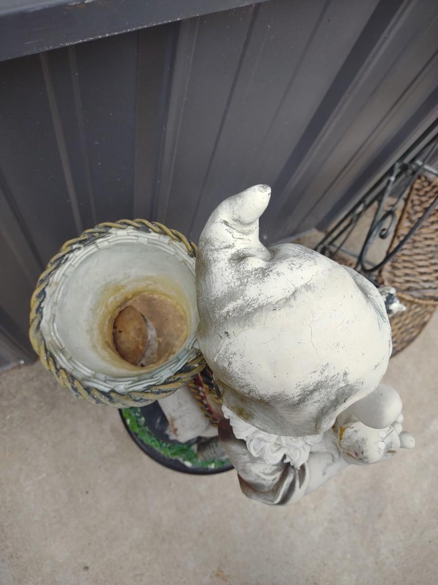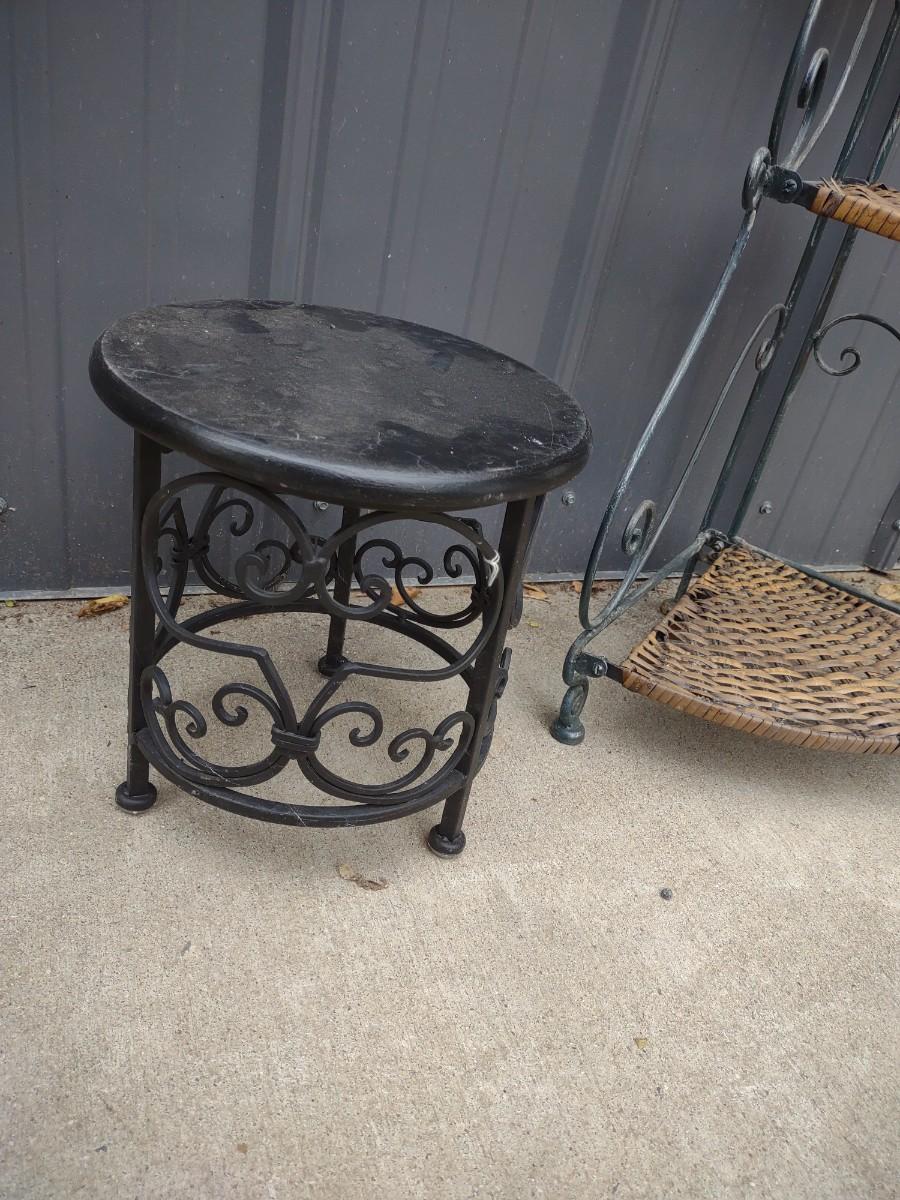 FOLDING CORNER WICKER STAND AND 1 OF THE 7 DWARFS? ON A METAL PLANT STAND