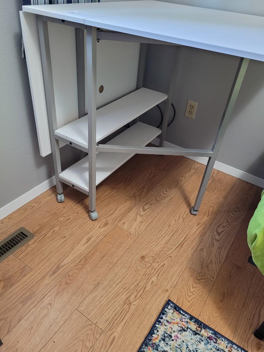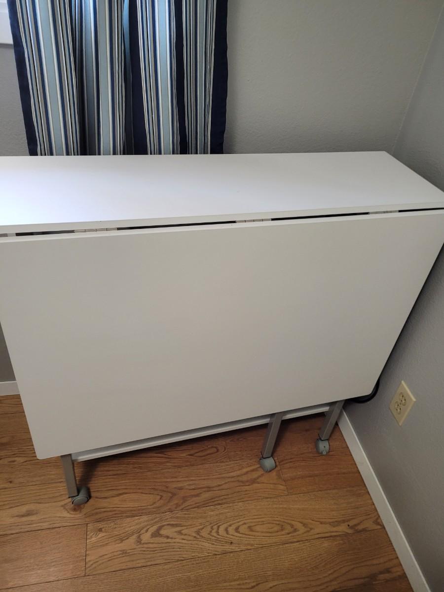 Folding craft table with both sides extended 60l x 36w x 36h folded it is 12 inches each side adds 24 inches. It has 2 shelfs for storage. No chips or nicks very little use.