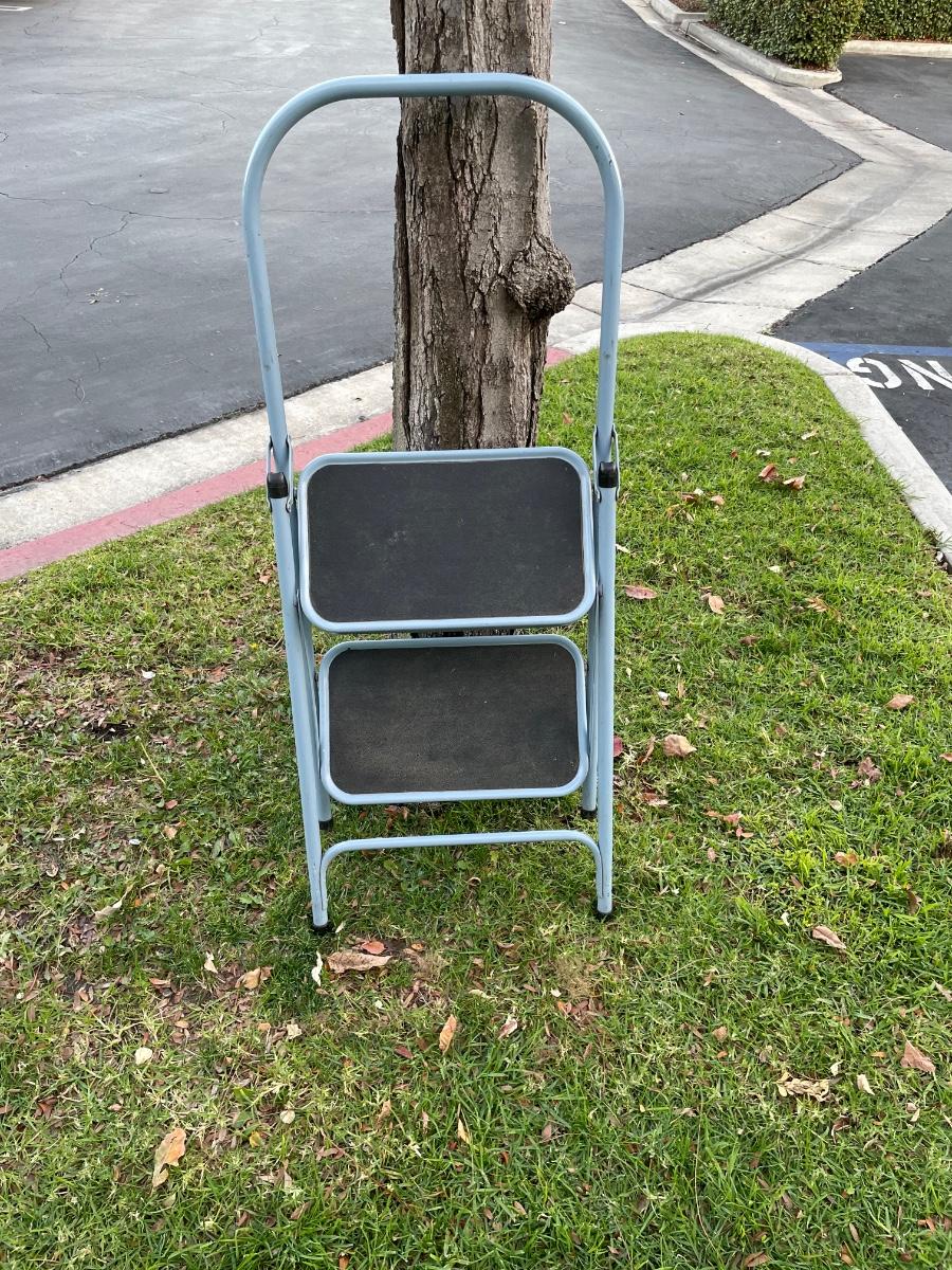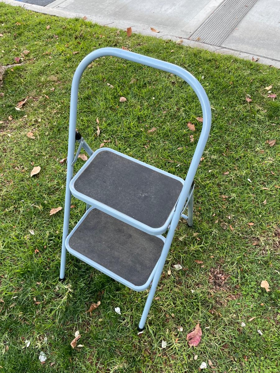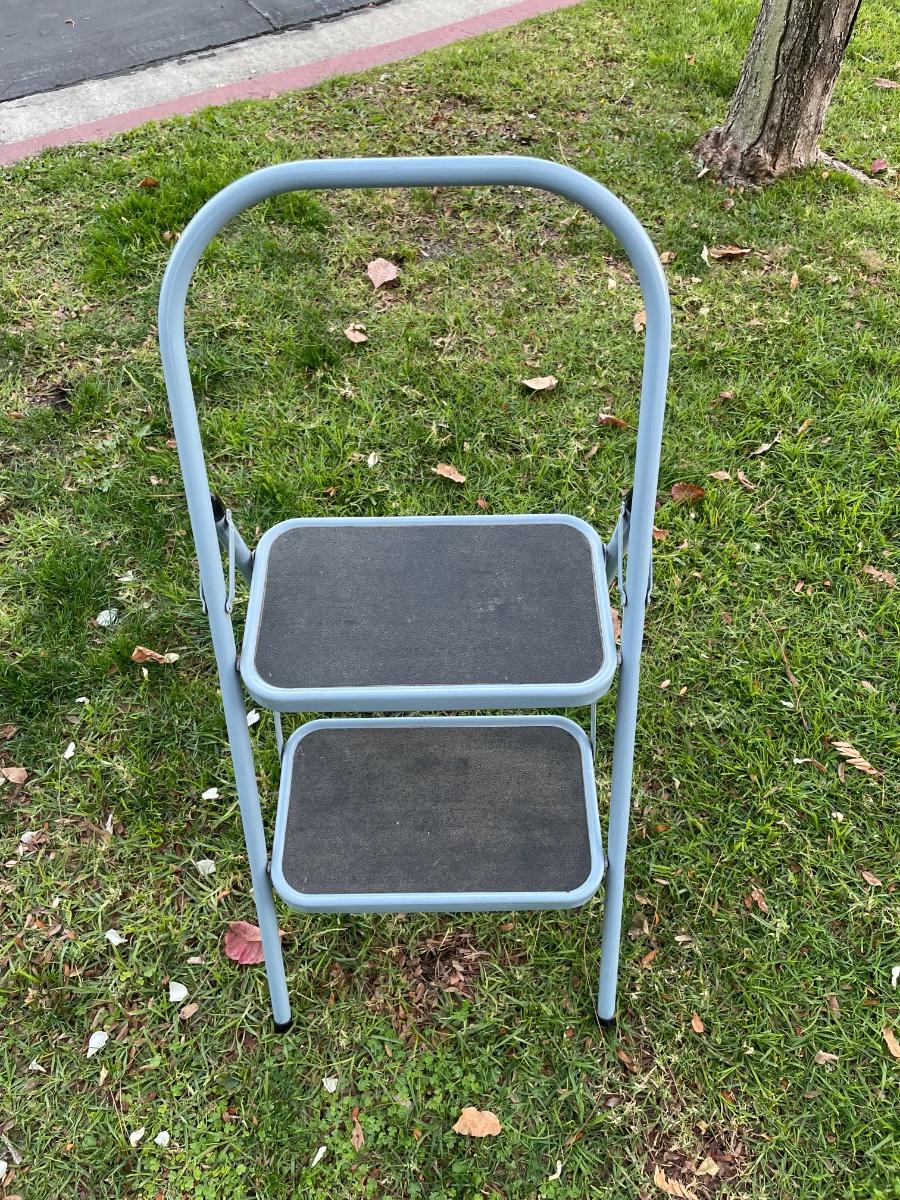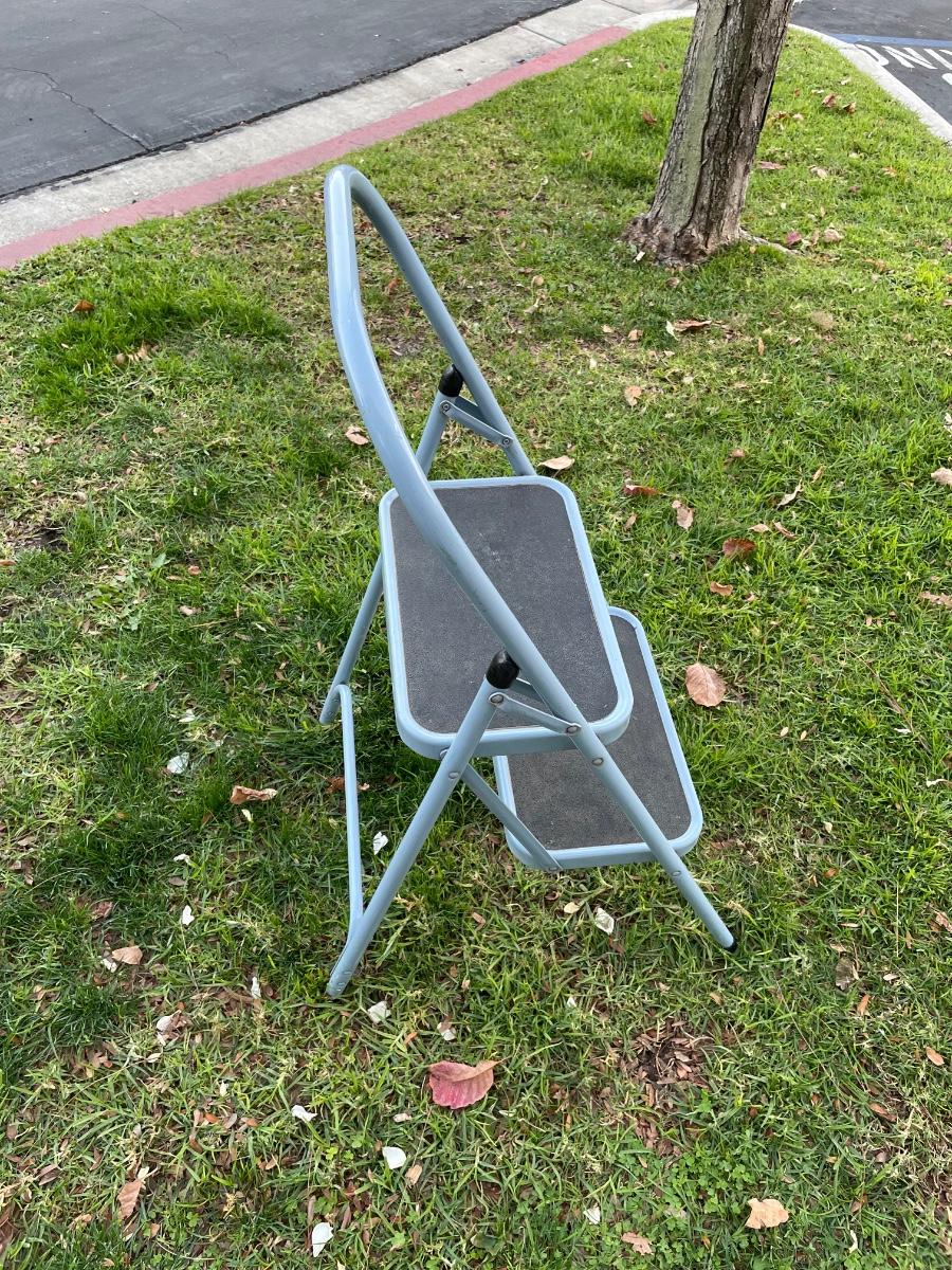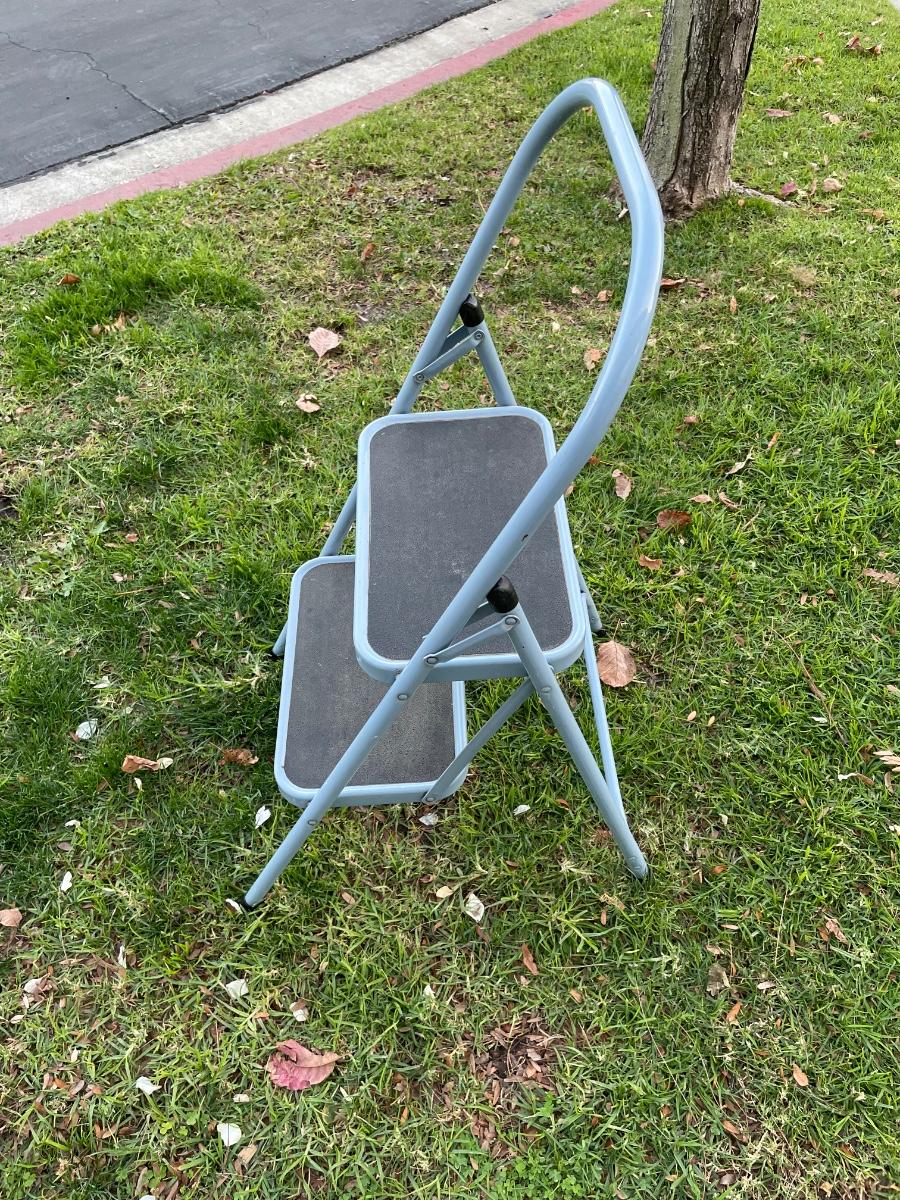 Folds flat for easy storage in a closet or other narrow space. Steel tubing and steps.