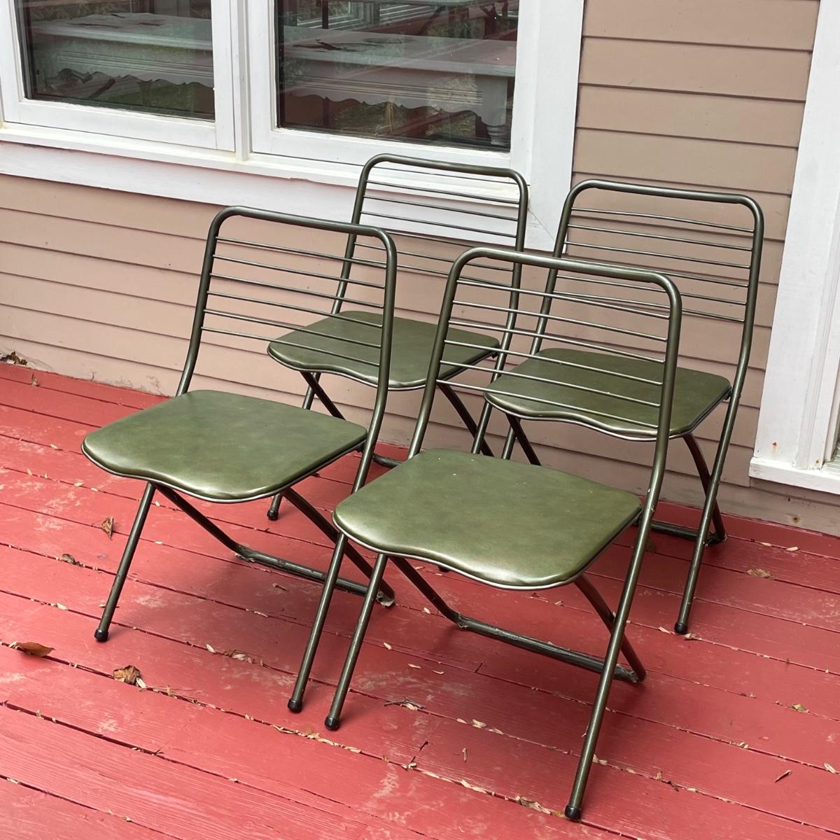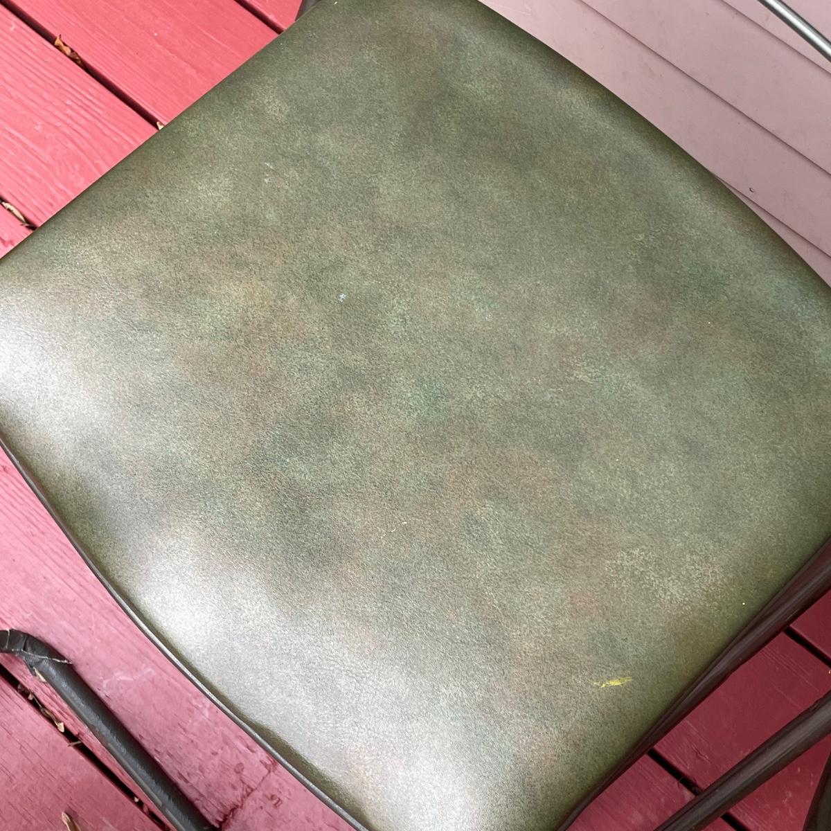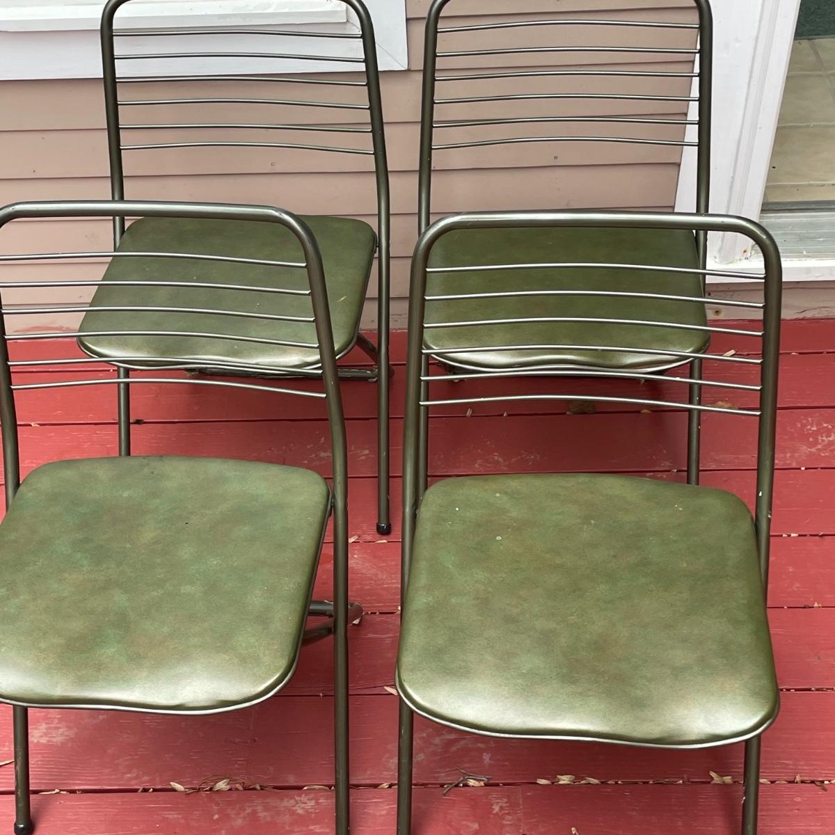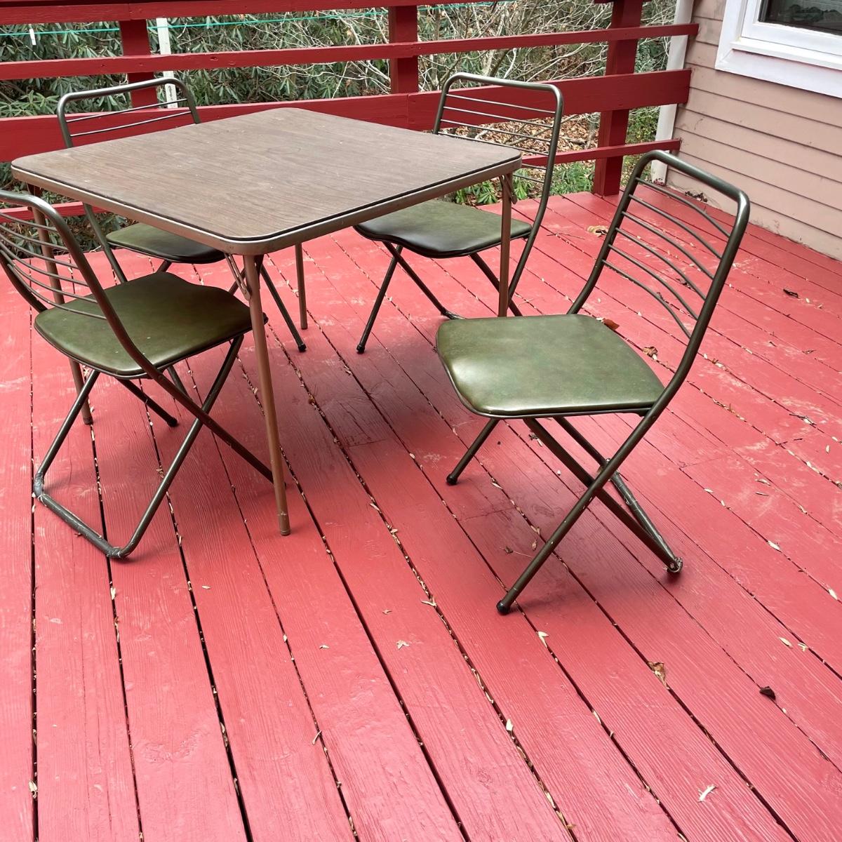 These four vintage folding chairs have green/brown metal frames with metallic-like green padded vinyl seats. There are some light marks on all chairs. The card table features a wood grain pattern on its surface. It does have some rust, see images; measures 34” square x 26” tall. Chairs measure 17” x 18” x 30” with 16” seat height.