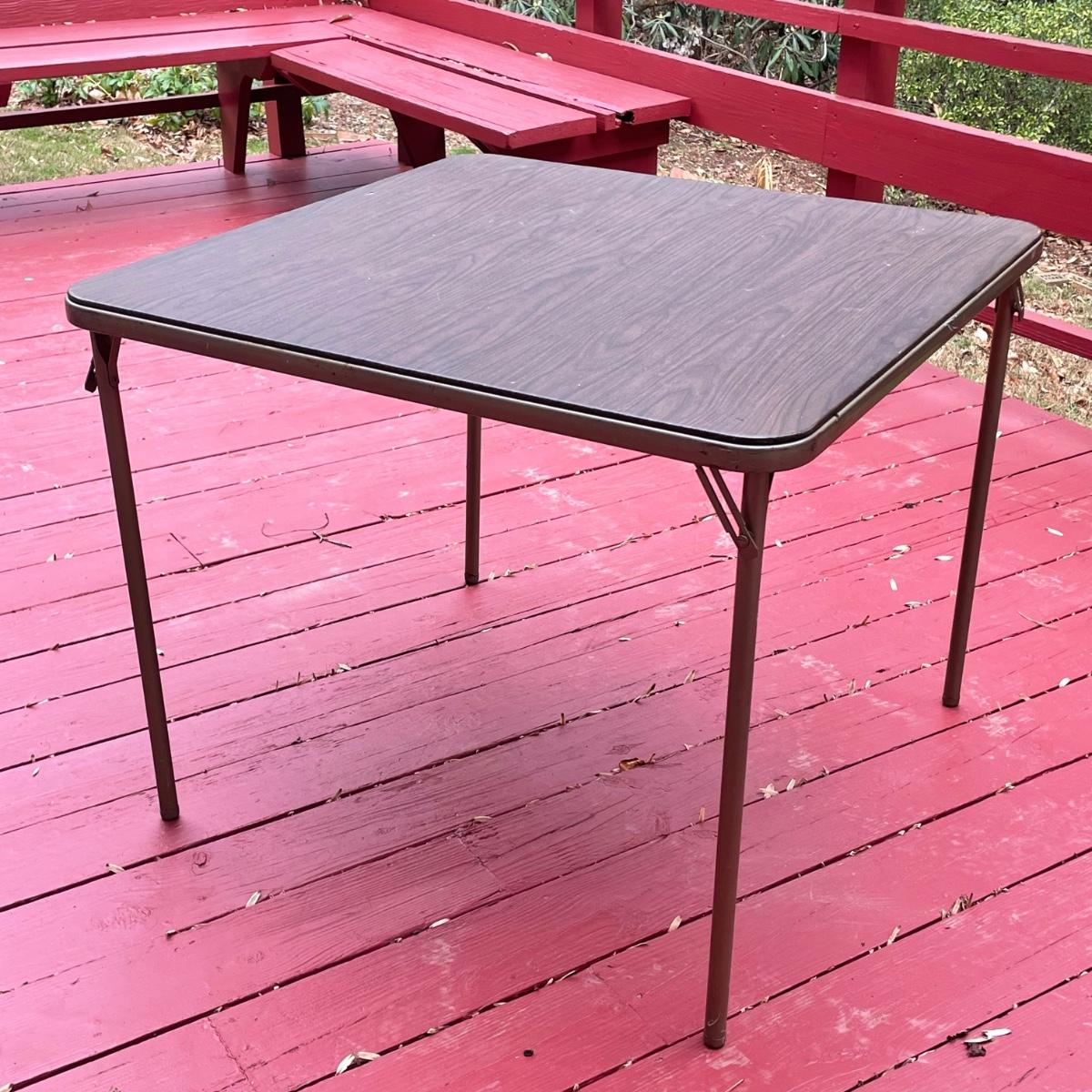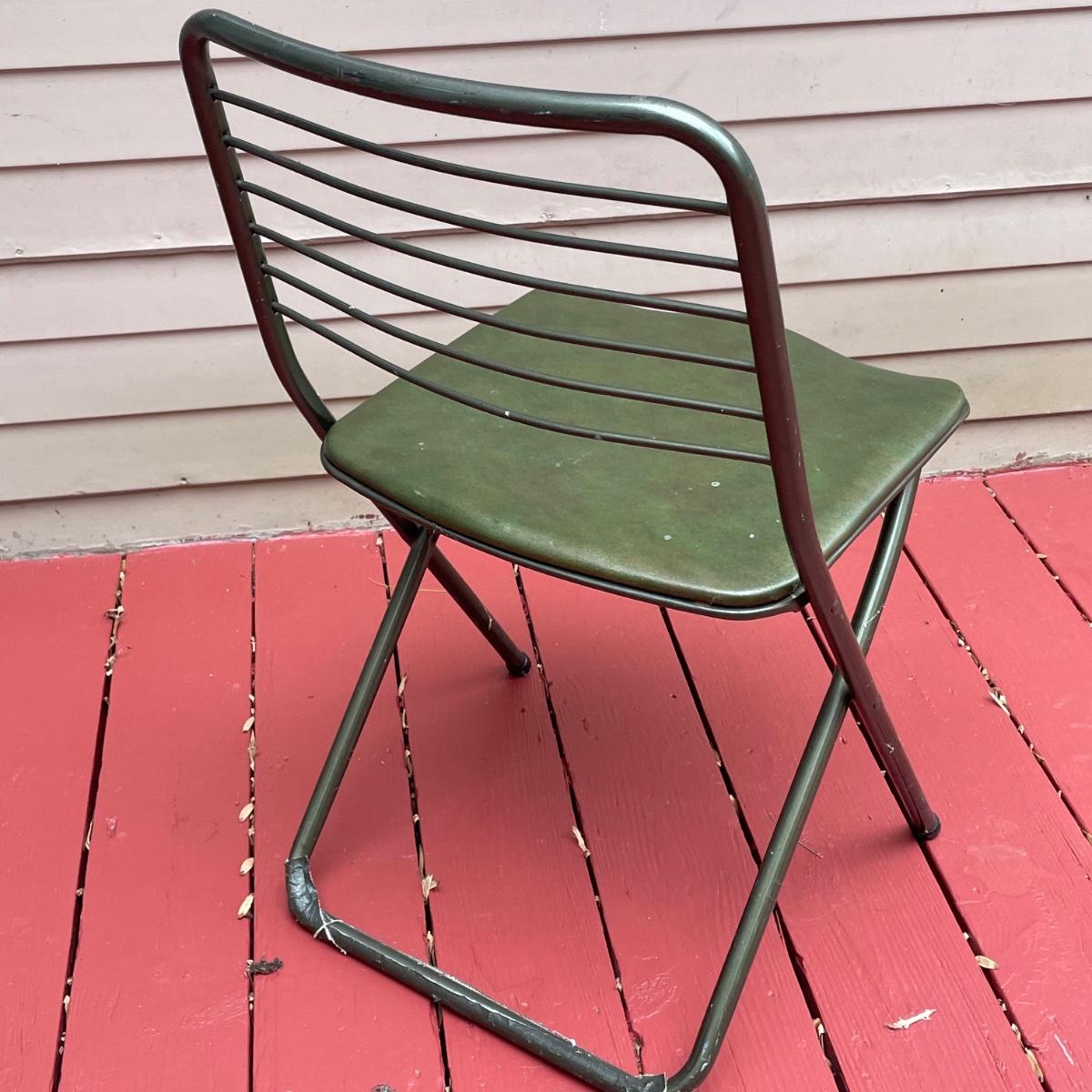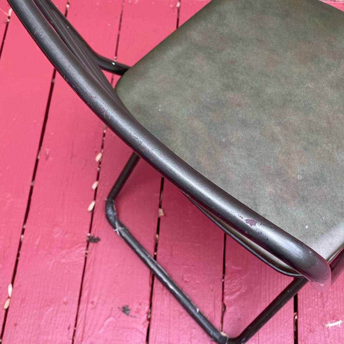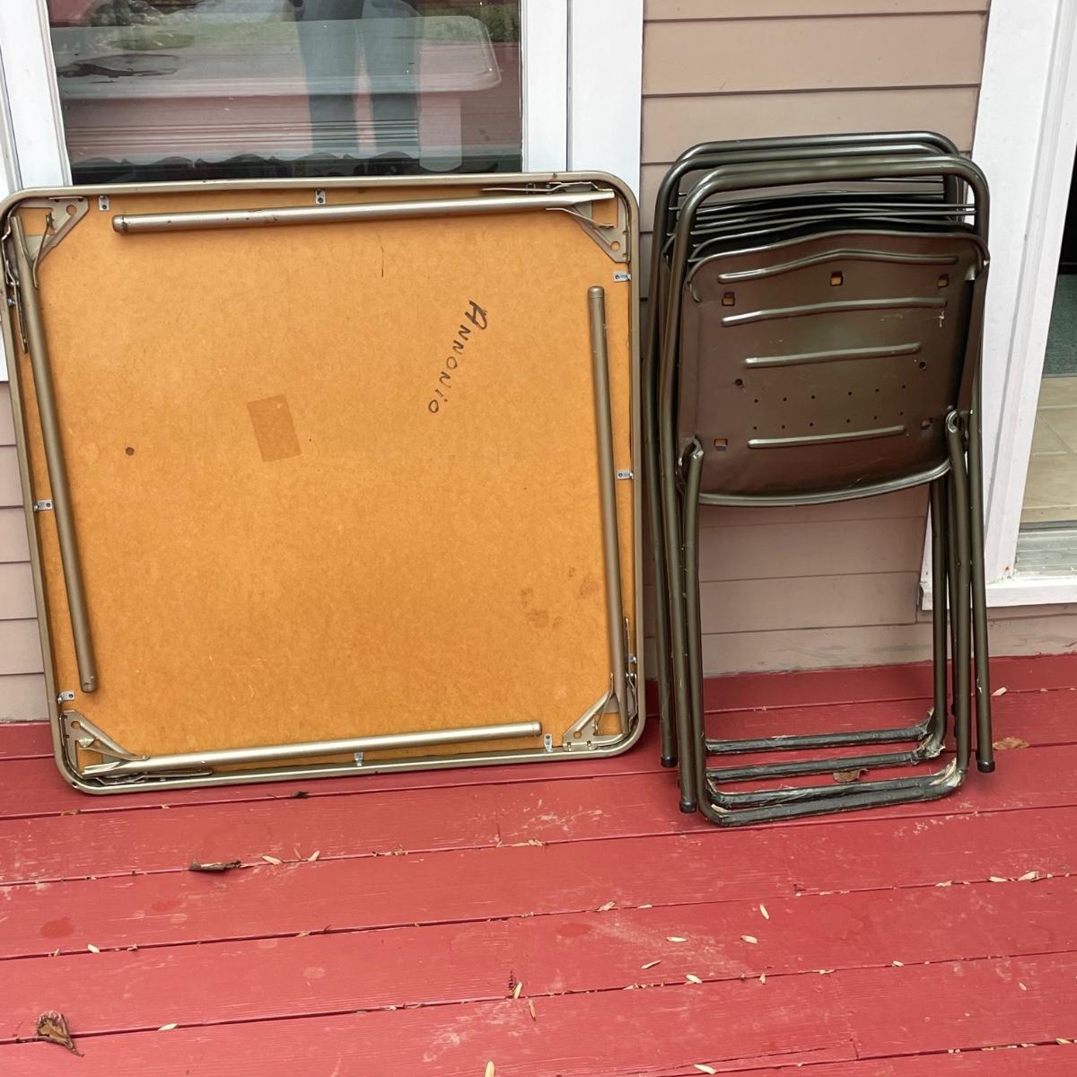 These four vintage folding chairs have green/brown metal frames with metallic-like green padded vinyl seats. There are some light marks on all chairs. The card table features a wood grain pattern on its surface. It does have some rust, see images; measures 34” square x 26” tall. Chairs measure 17” x 18” x 30” with 16” seat height.