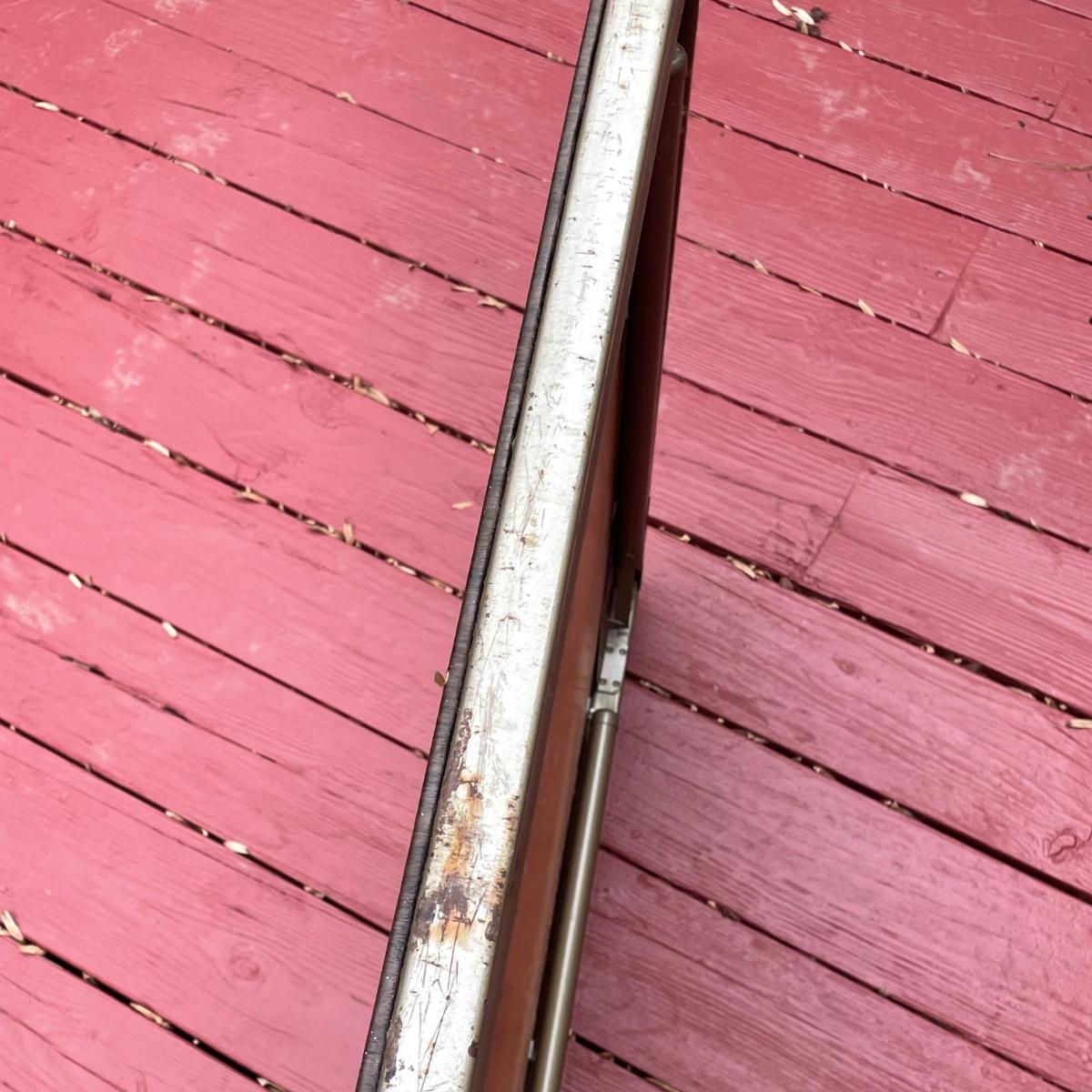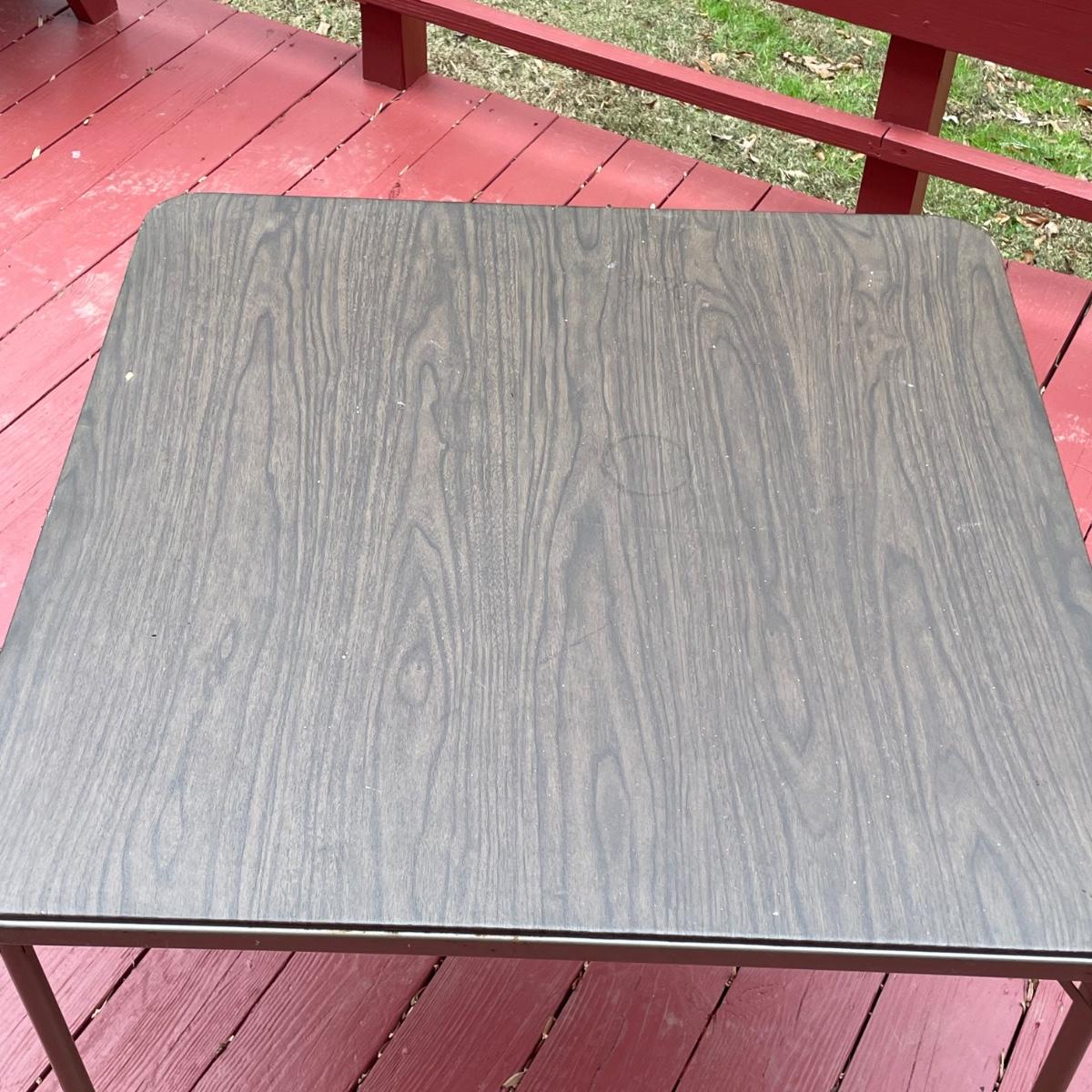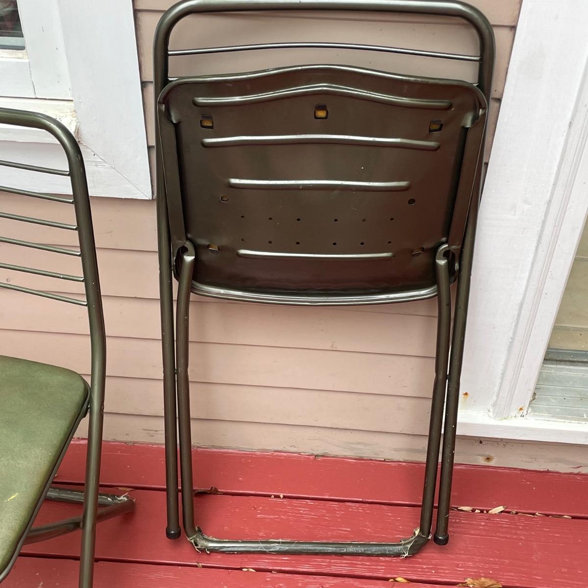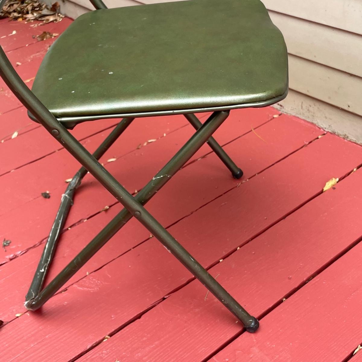 These four vintage folding chairs have green/brown metal frames with metallic-like green padded vinyl seats. There are some light marks on all chairs. The card table features a wood grain pattern on its surface. It does have some rust, see images; measures 34” square x 26” tall. Chairs measure 17” x 18” x 30” with 16” seat height.