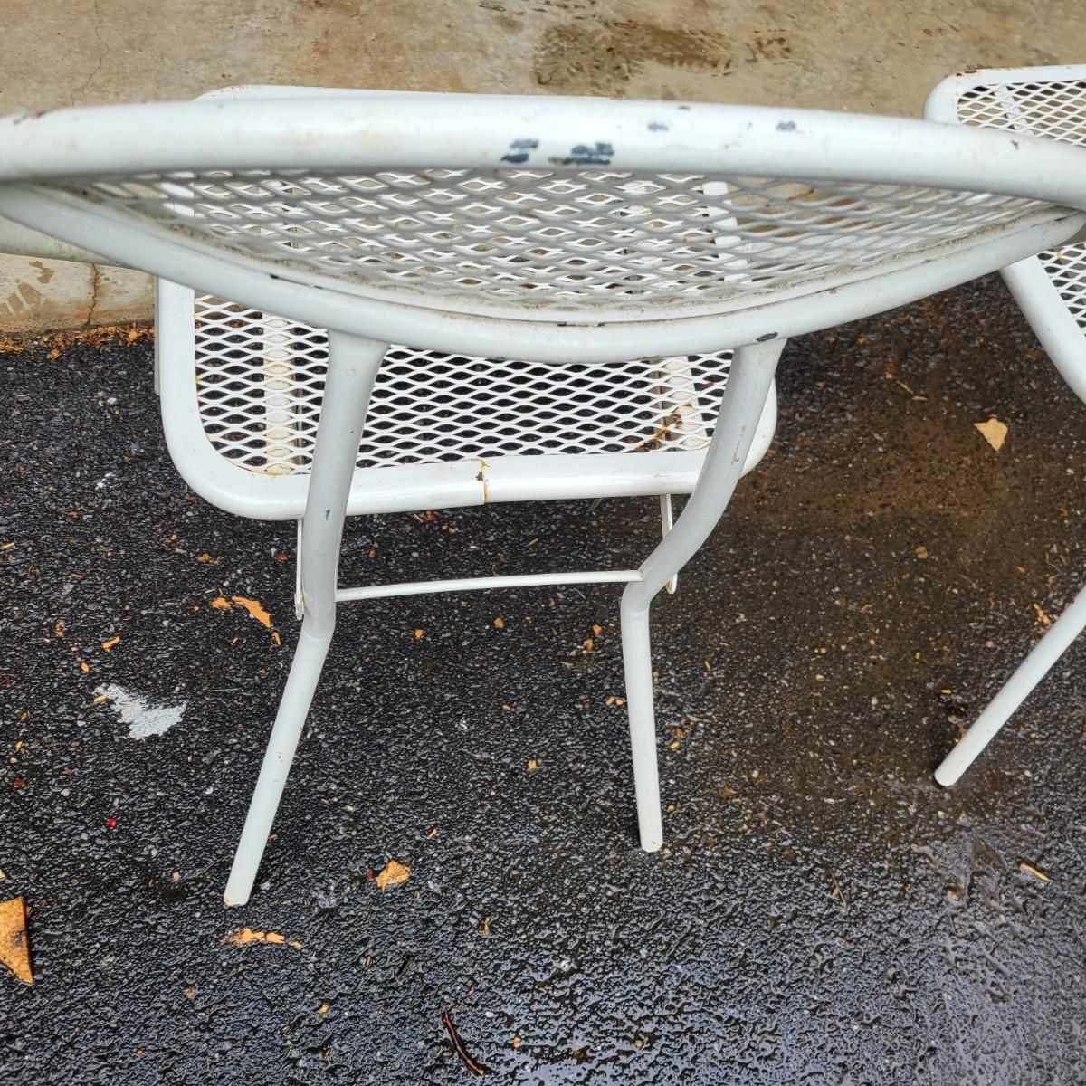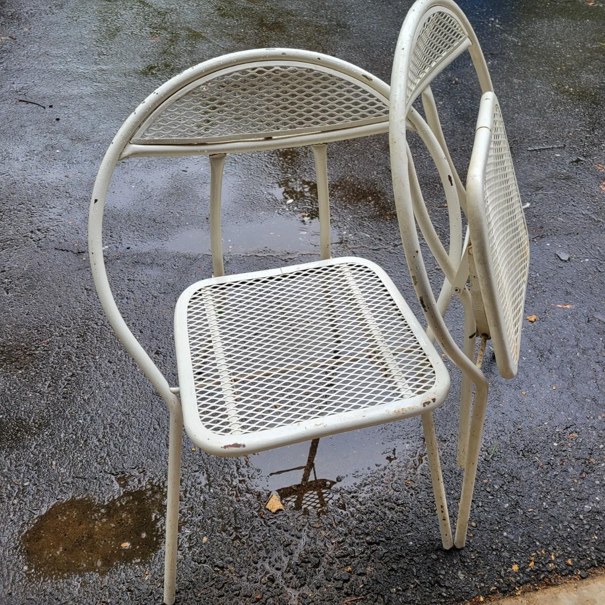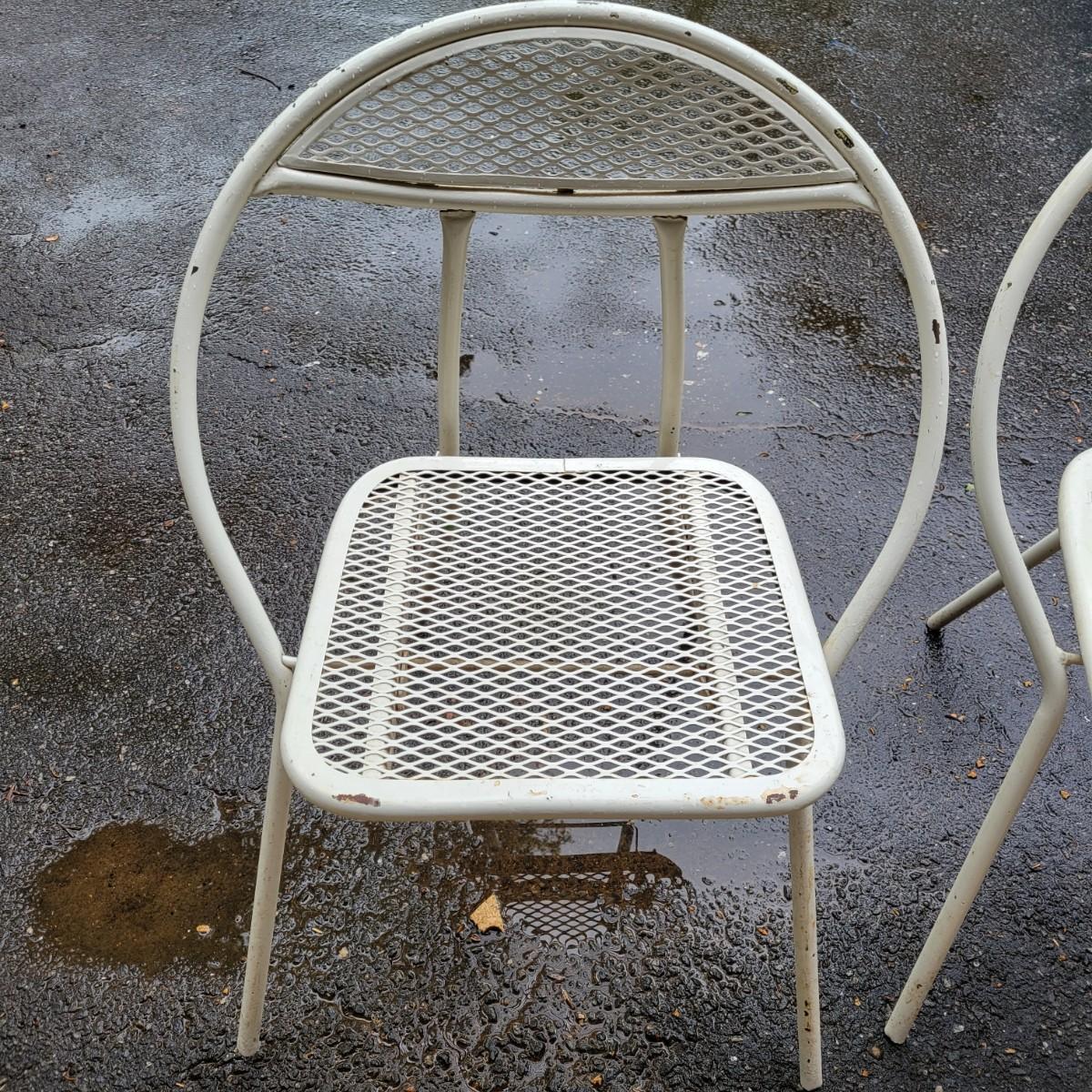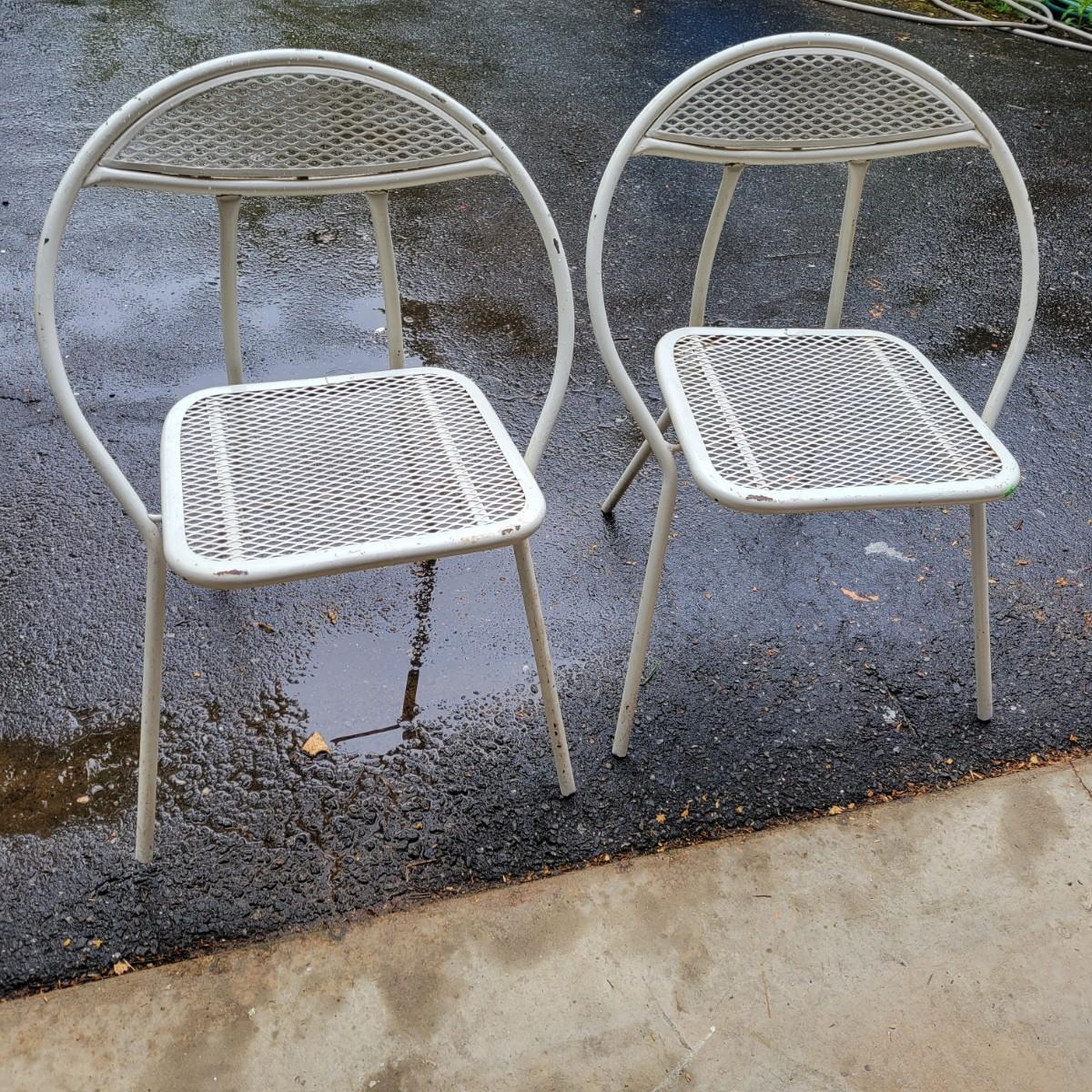 A pair of metal folding patio chairs that are painted white. Each chair measures approximately 23.5" x 16.5" x 30.5"H with a seat height of 17". There is some minor rust on these chairs. Local pickup only