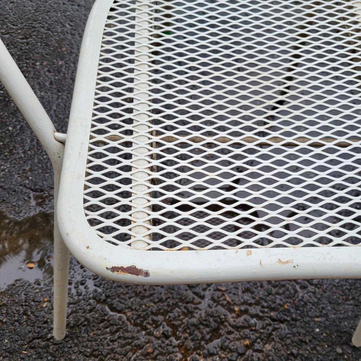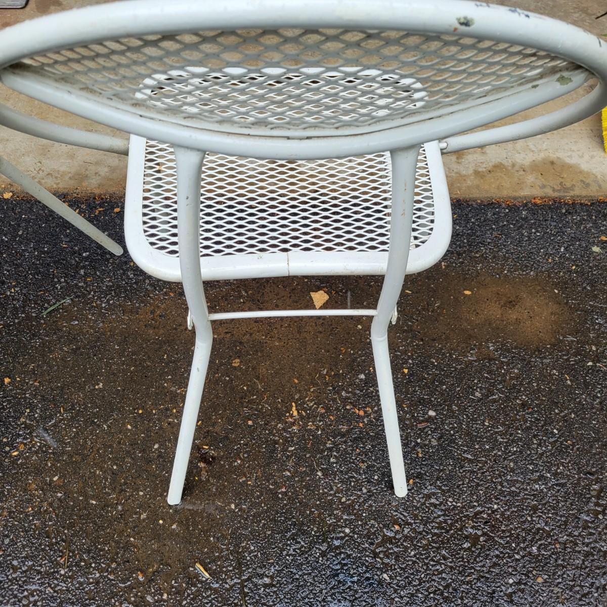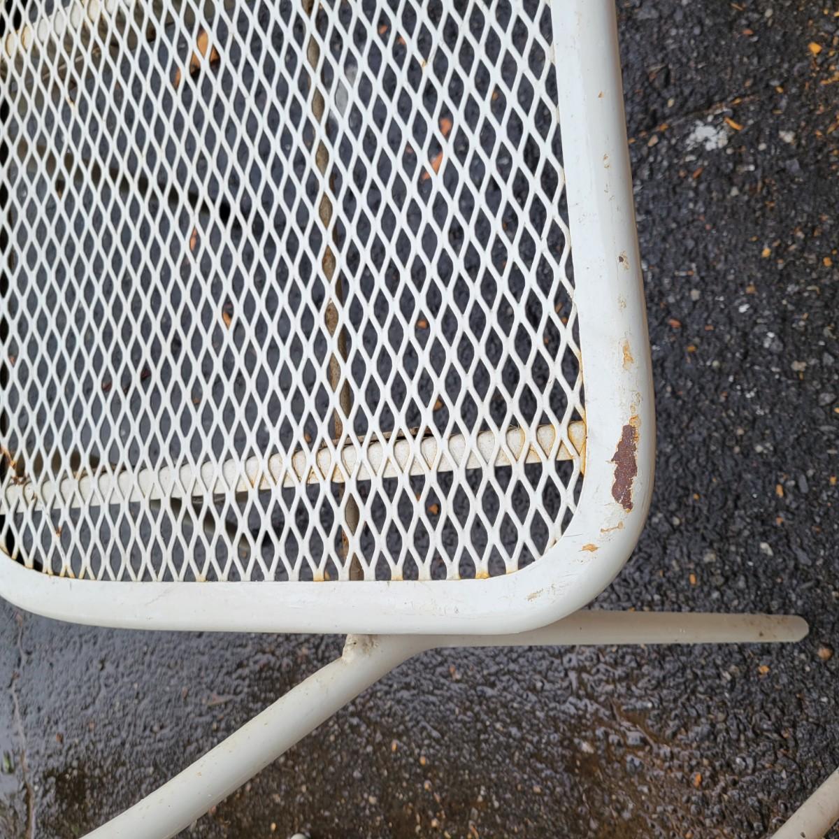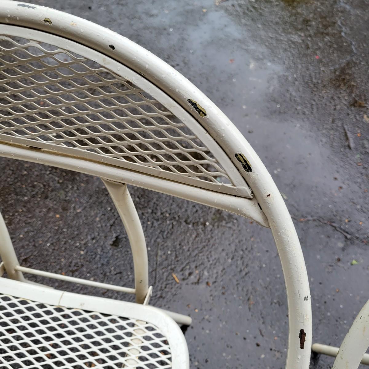 A pair of metal folding patio chairs that are painted white. Each chair measures approximately 23.5" x 16.5" x 30.5"H with a seat height of 17". There is some minor rust on these chairs. Local pickup only
