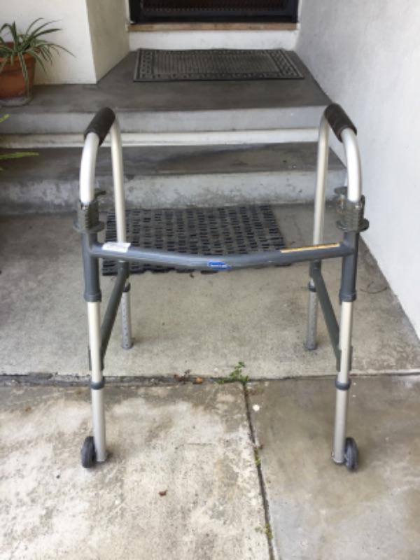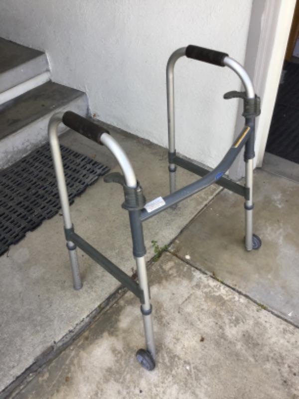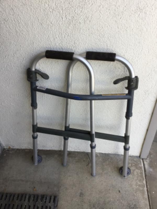 Folding metal walker. Wheels on the front legs. Folds easily and is light weight.