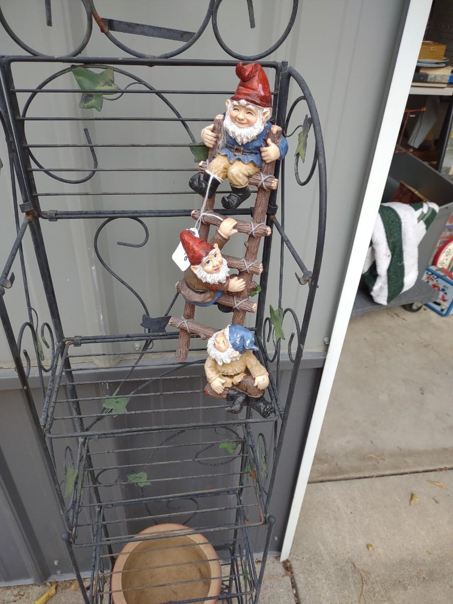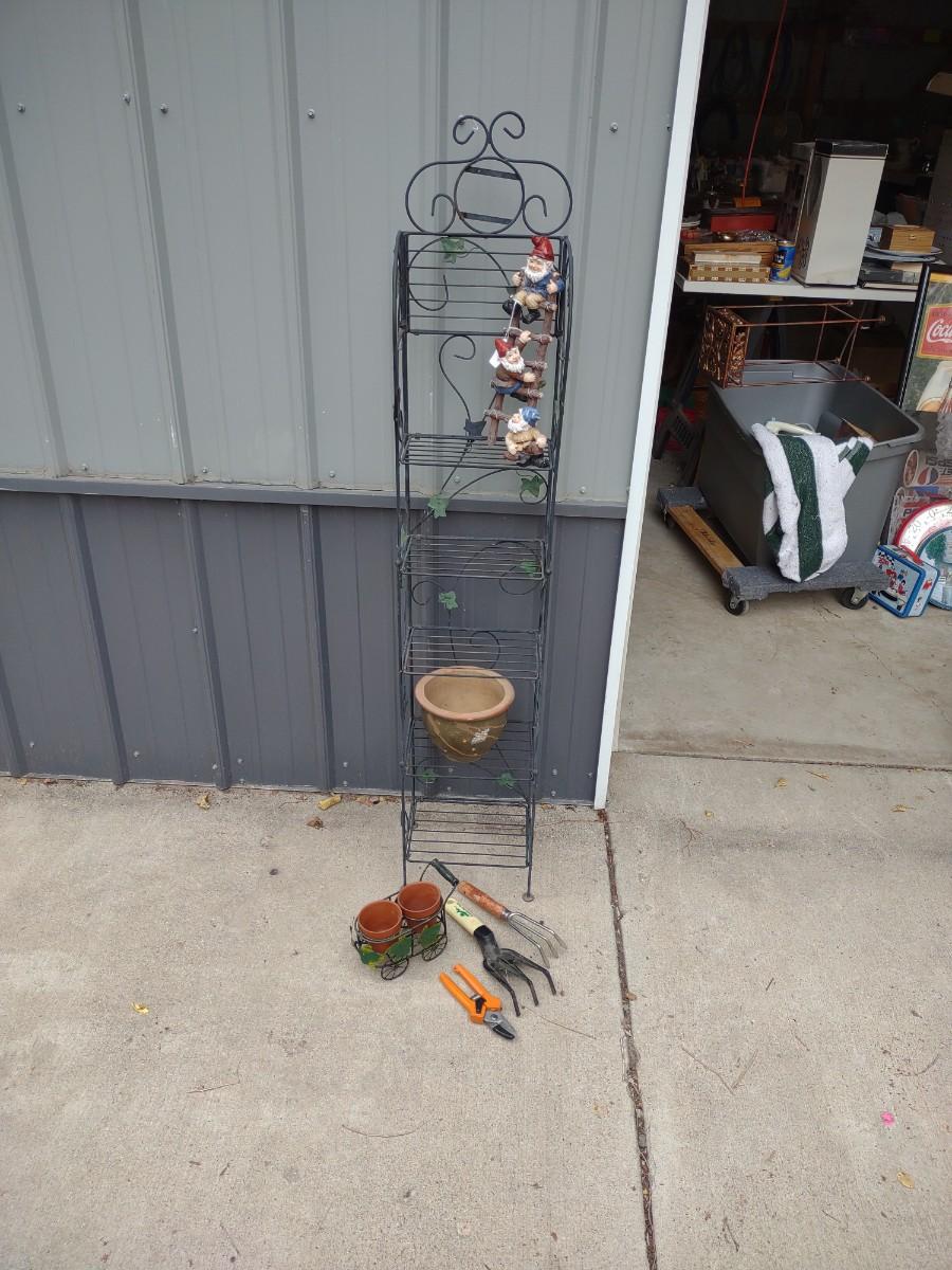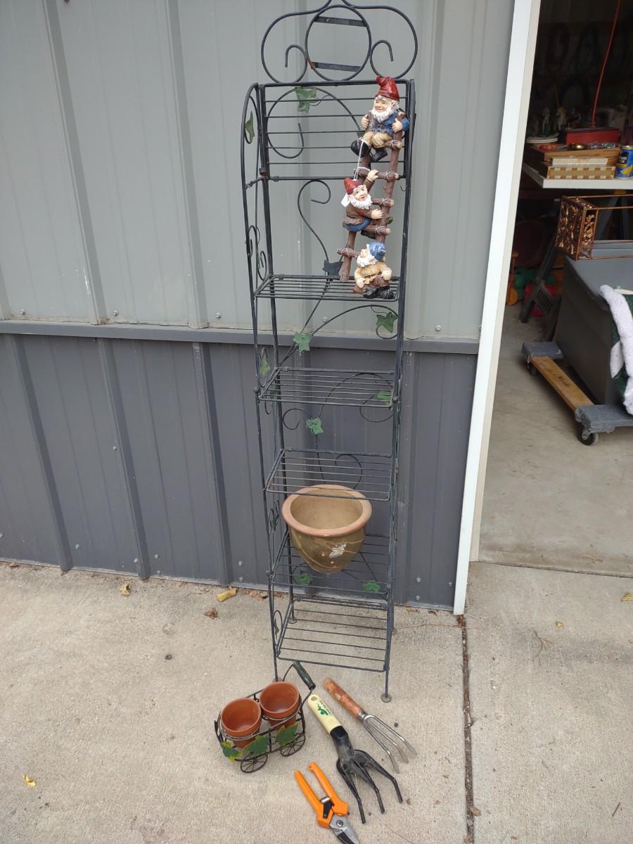 FOLDING NARROW METAL SHELF, GNOMES CLIMBING A LADDER, FLOWER POTS AND GARDEN TOOLS
