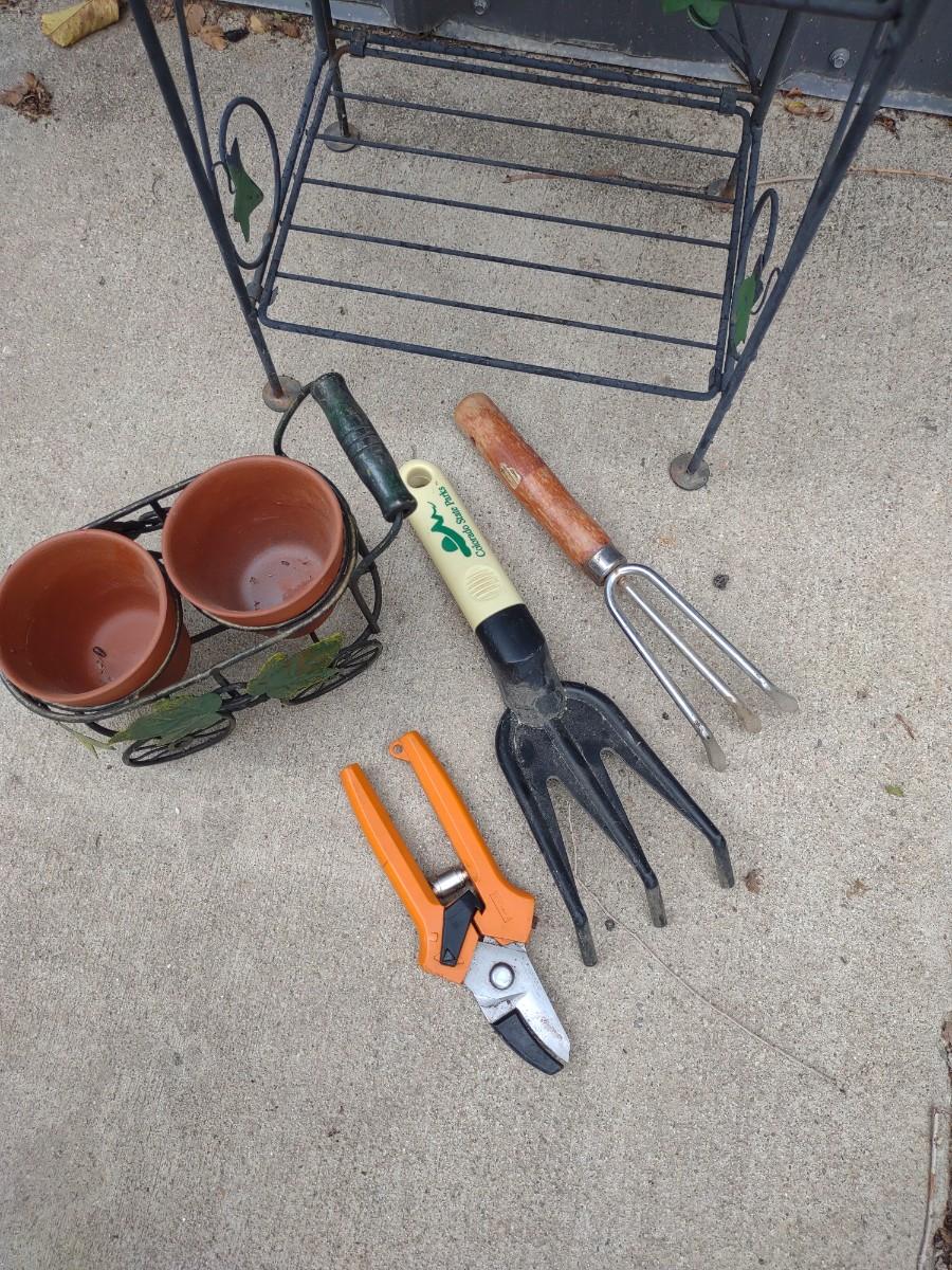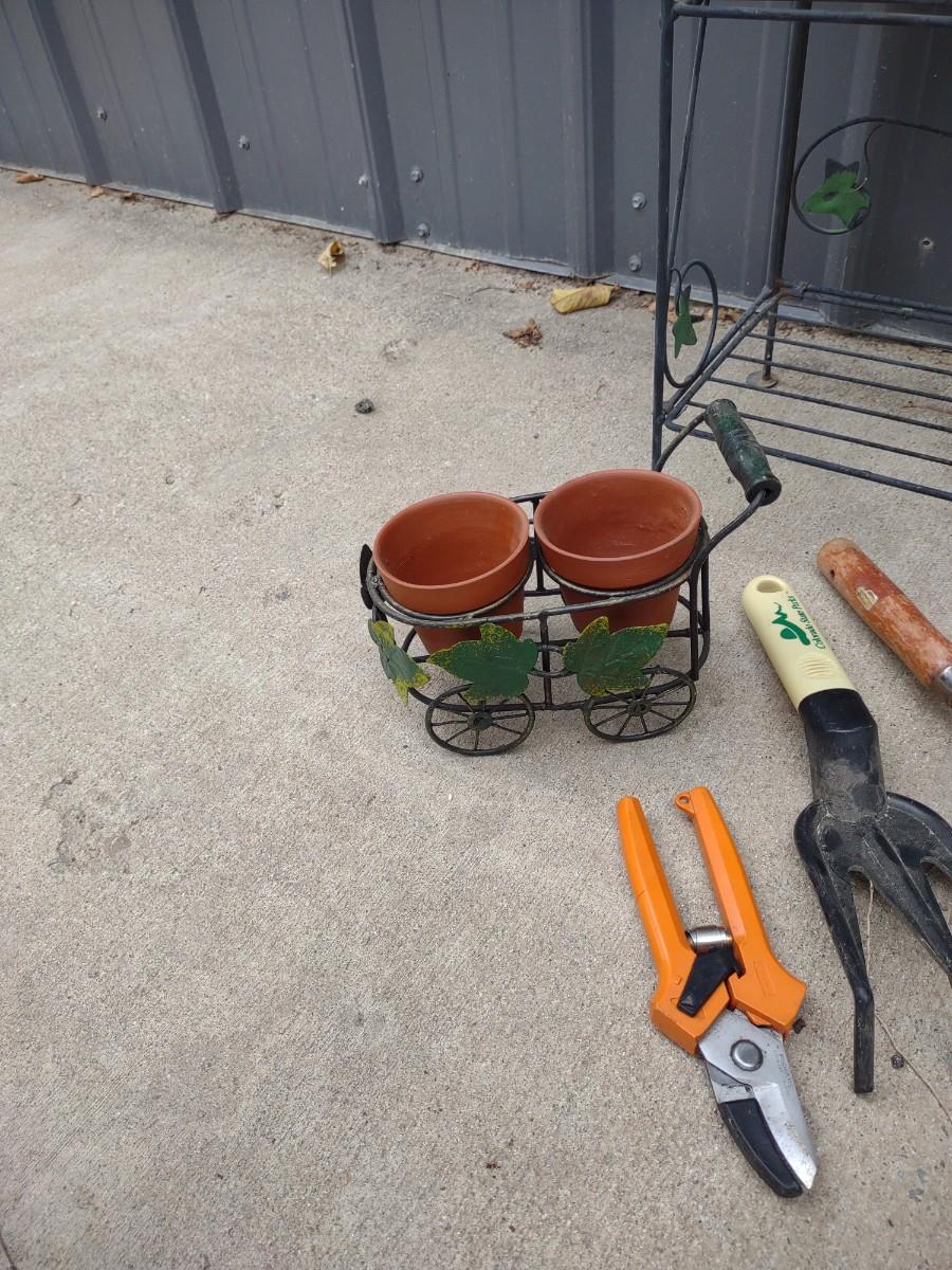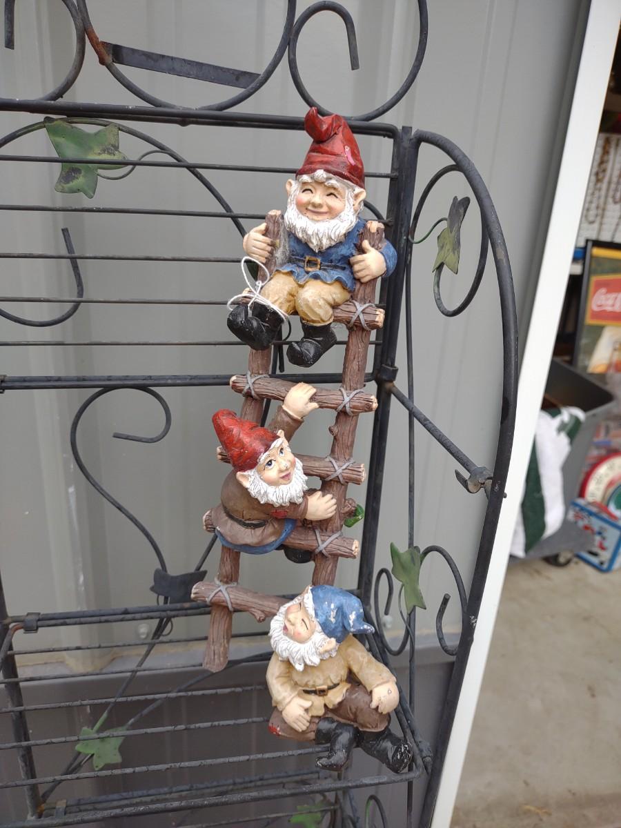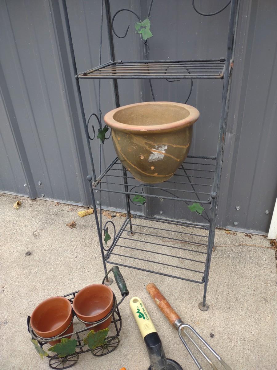 FOLDING NARROW METAL SHELF, GNOMES CLIMBING A LADDER, FLOWER POTS AND GARDEN TOOLS