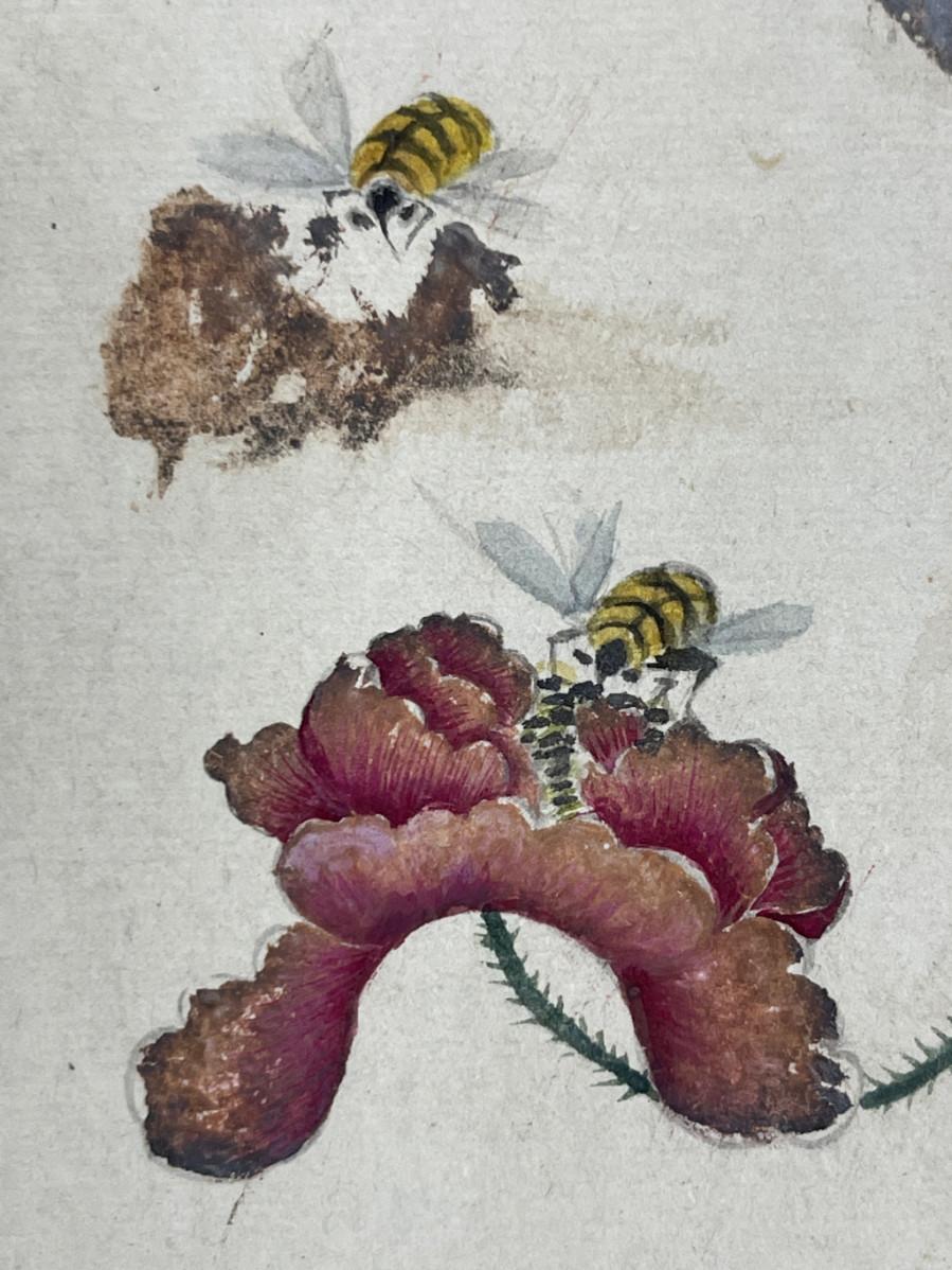 DESCRIPTION: This lot is includes three nature scenes hand painted on what appears to be hand made paper. The garden floral vignettes pose honey bees on flowers, and delicate but colorful flower blossoms, and close with a center fold.