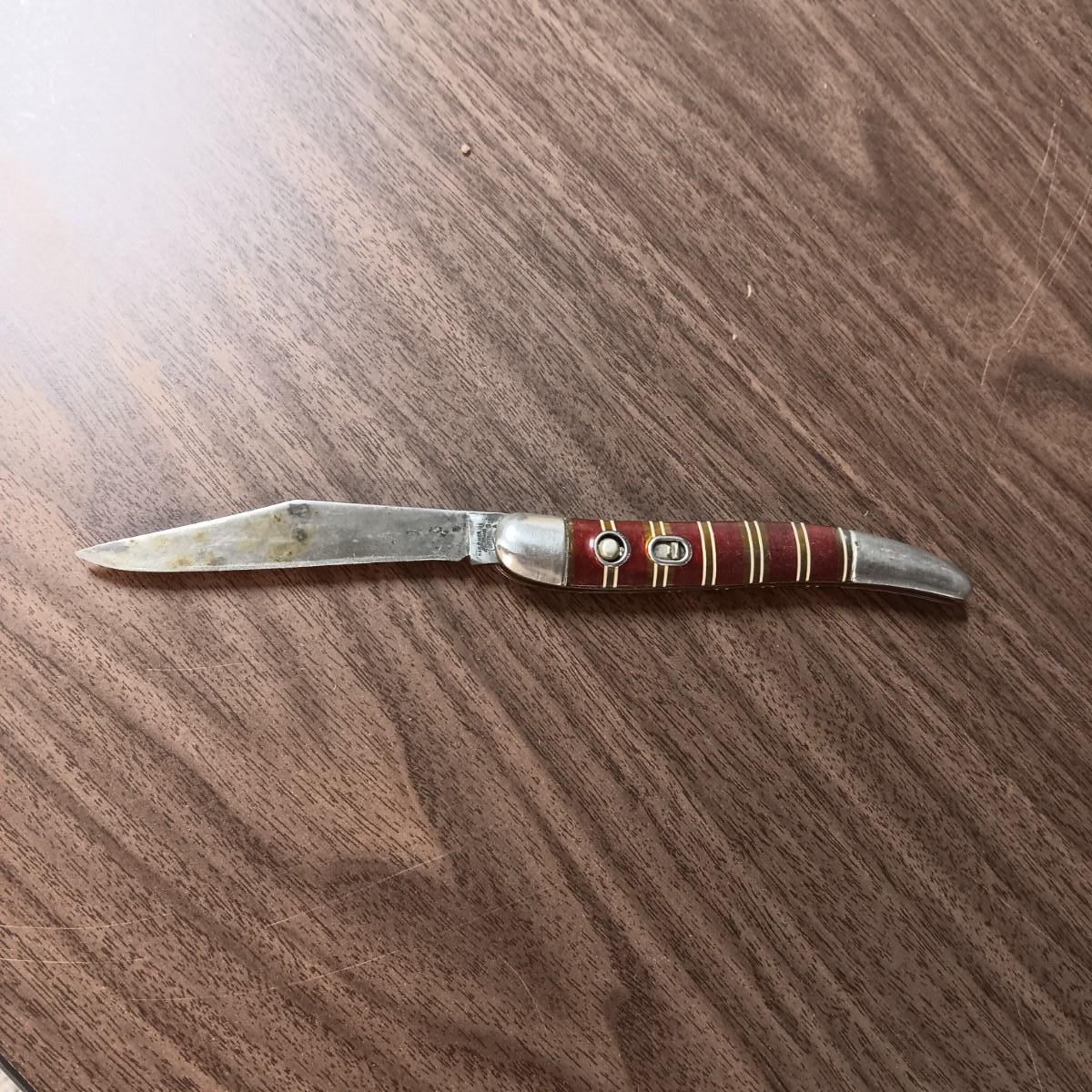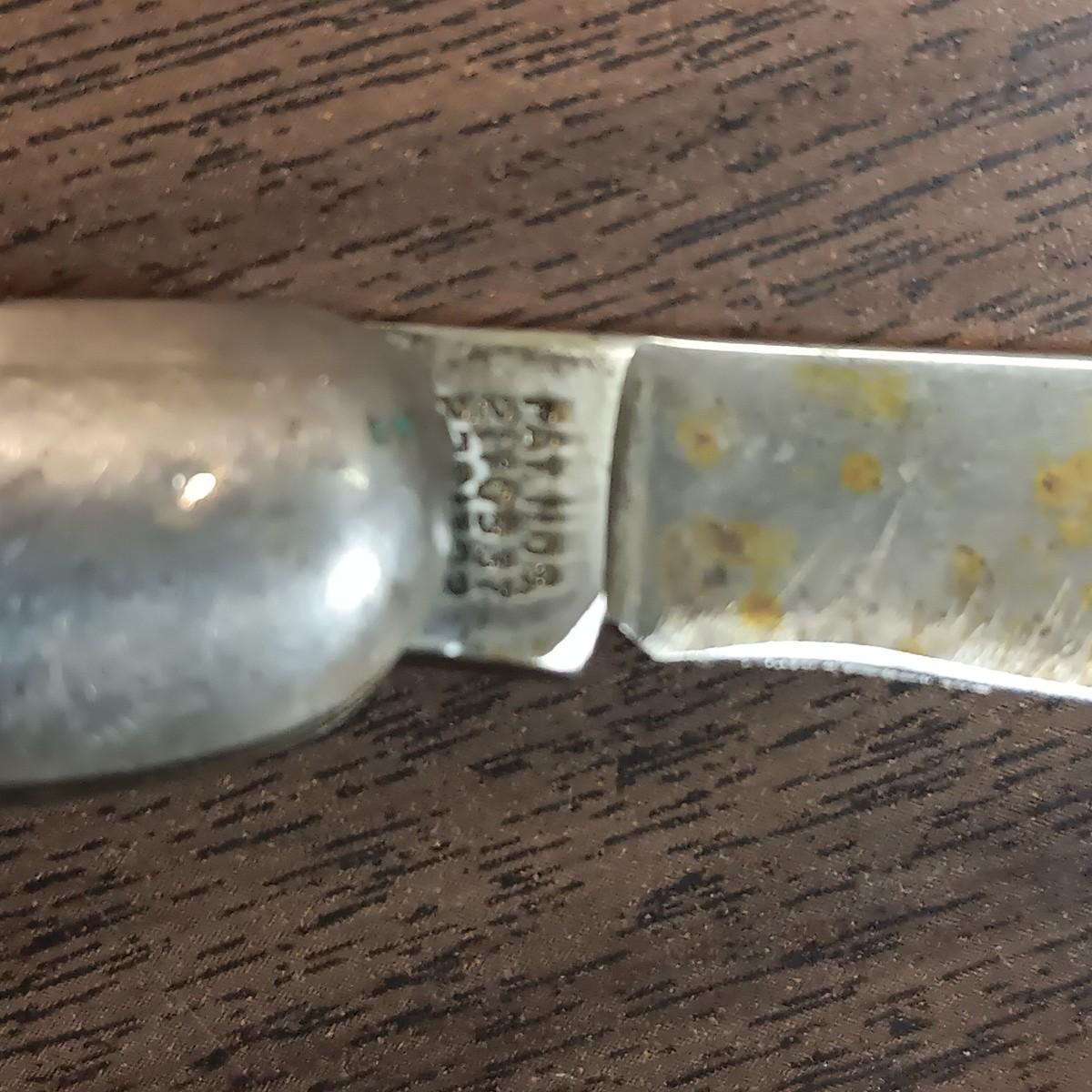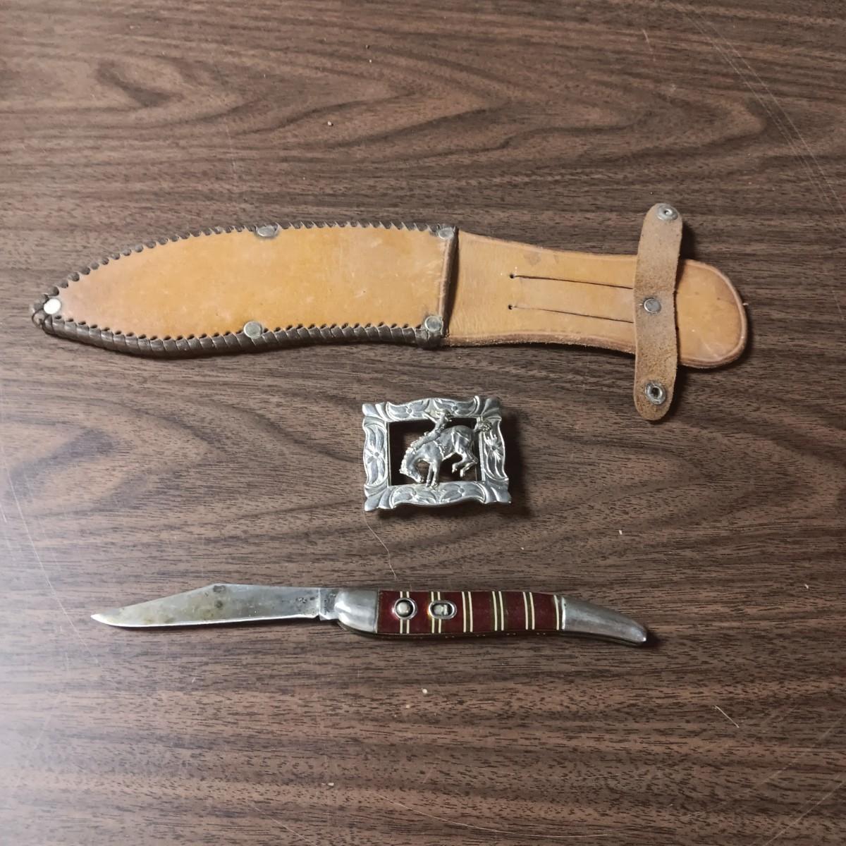 FOLDING POCKET KNIFE, LEATHER SHEATH AND SMALL BELT BUCKLE