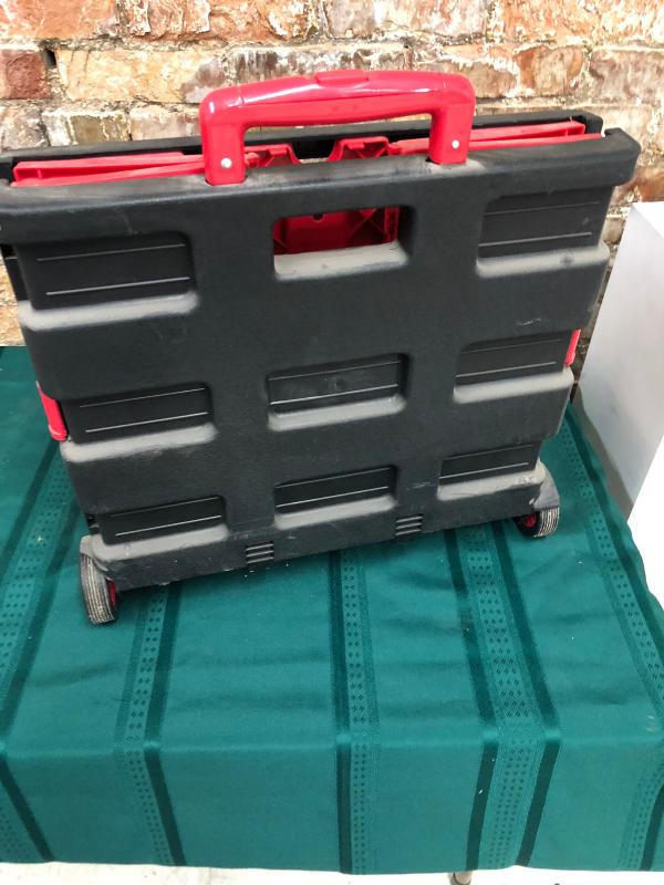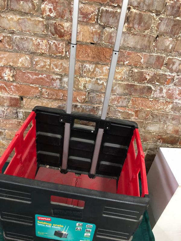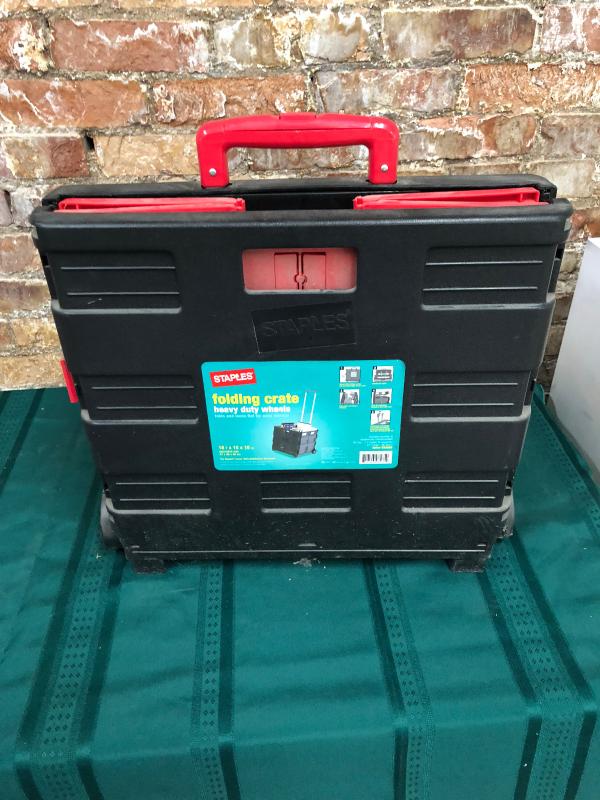 With some dust from storage, very light use on this handy folding and rolling collapsible crate...