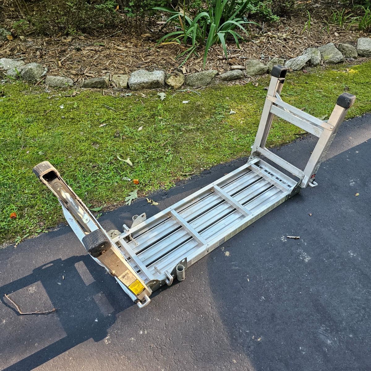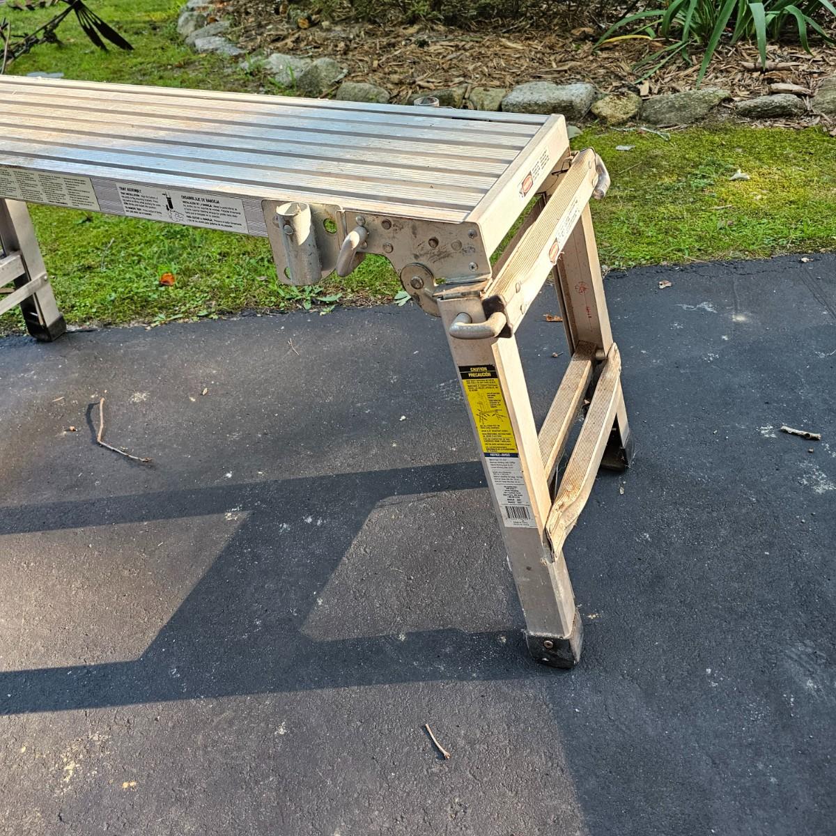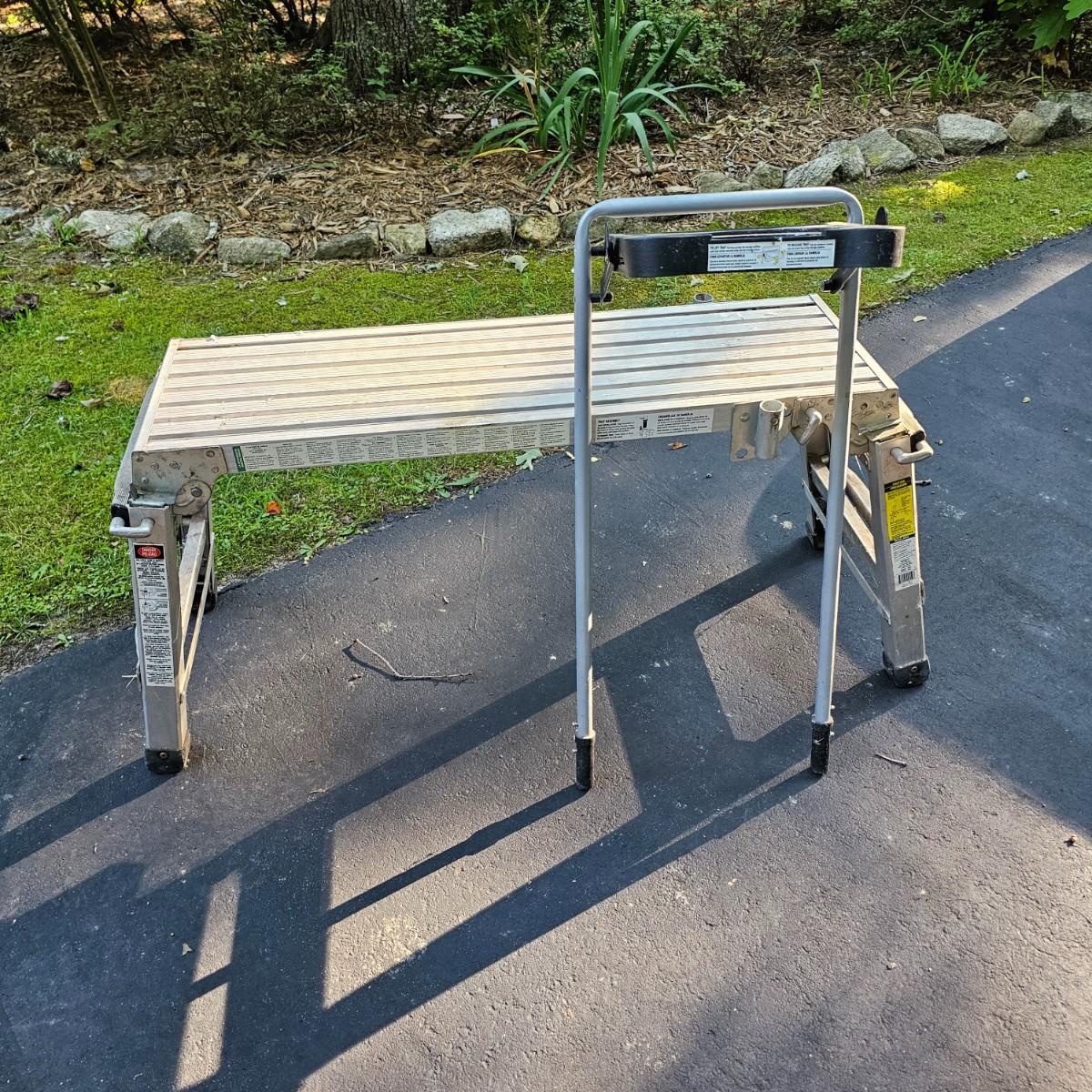 Aluminum folding scaffold with extendable legs and a detachable work tray. Unit folds flat for storage, is 40" x 16" x 8"H. Open to first position it is 22"H, and extended legs give it a 34"H platform. Added work tray makes it 64" to top of tray. Locking pins hold unit at all levels, ready to pull and re-position. Open grid top plate. See photos for details. Local pickup only.