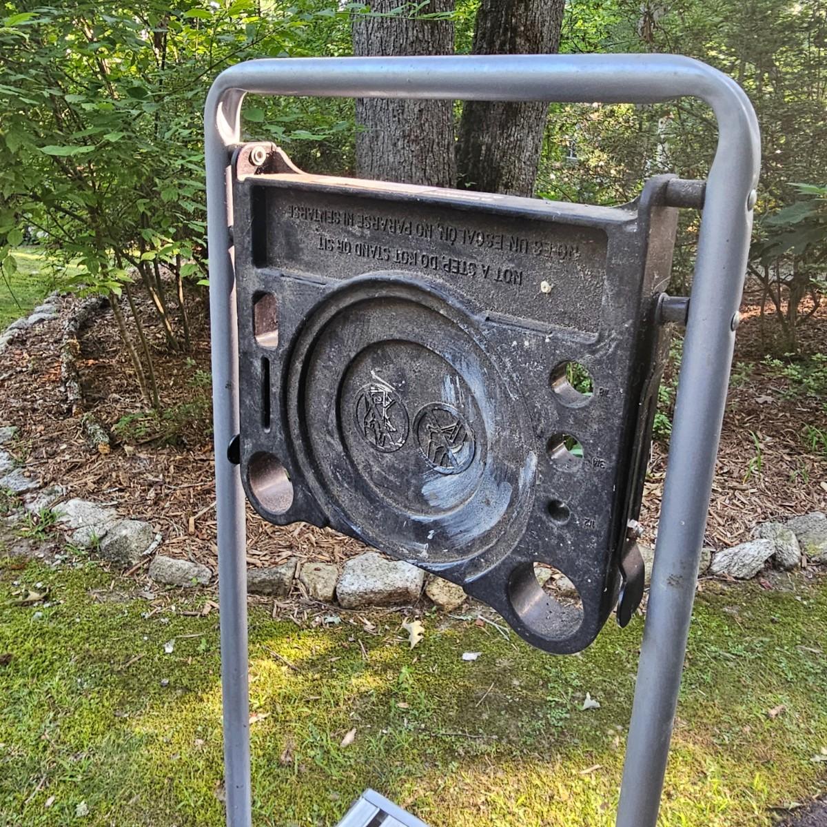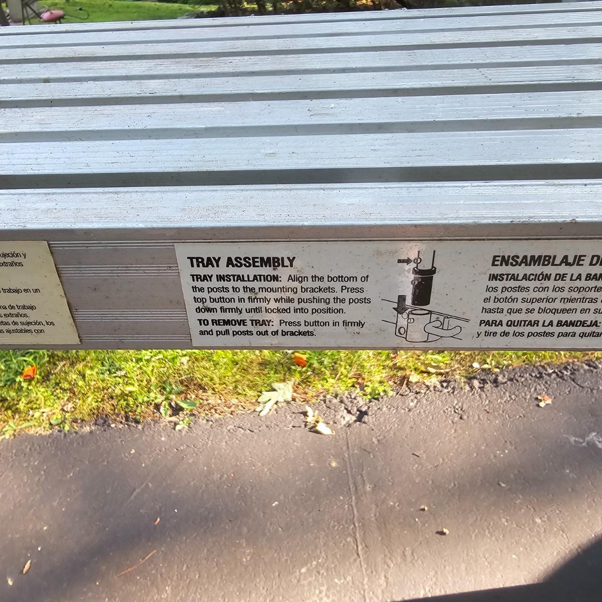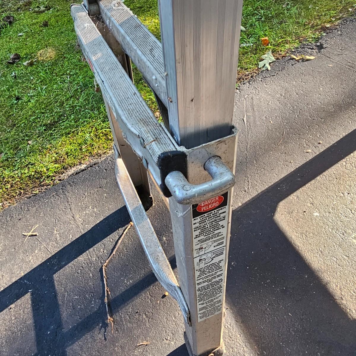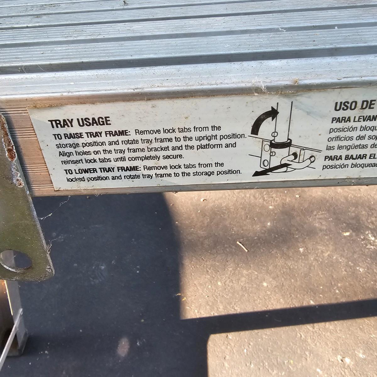 Aluminum folding scaffold with extendable legs and a detachable work tray. Unit folds flat for storage, is 40" x 16" x 8"H. Open to first position it is 22"H, and extended legs give it a 34"H platform. Added work tray makes it 64" to top of tray. Locking pins hold unit at all levels, ready to pull and re-position. Open grid top plate. See photos for details. Local pickup only.