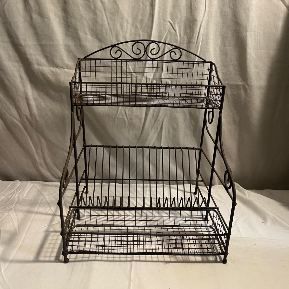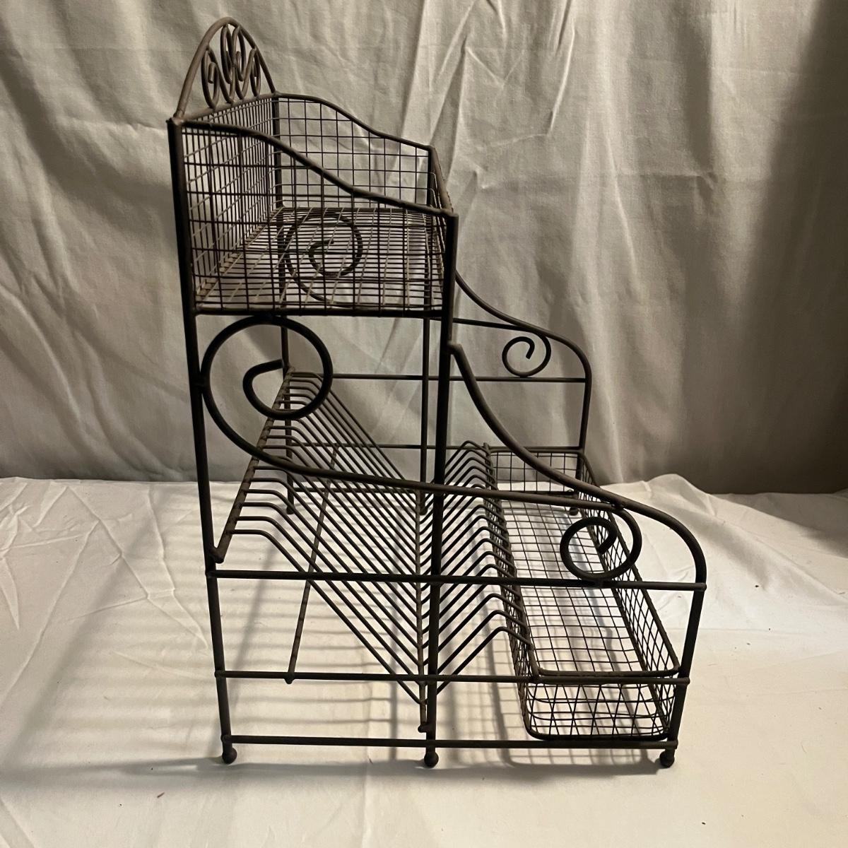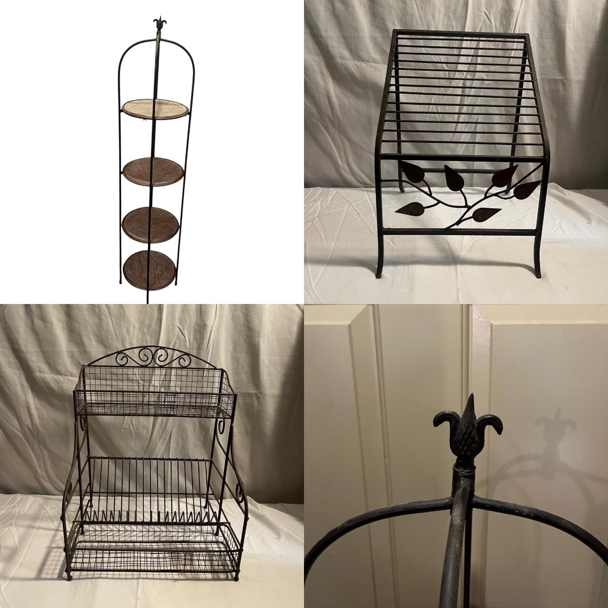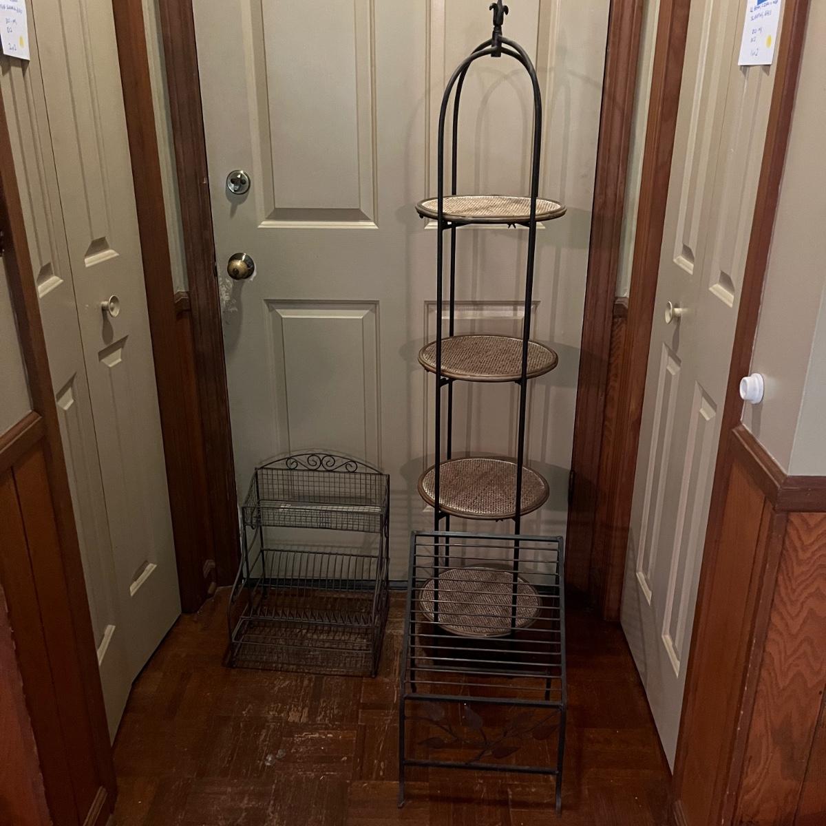 Lot includes a metal folding four tier shelf, metal shelf and a metal magazine rack. Folding shelf measures 13.6” x 13.5” x 59”H when open and magazine rack measures 13” x 14” x 18”H.