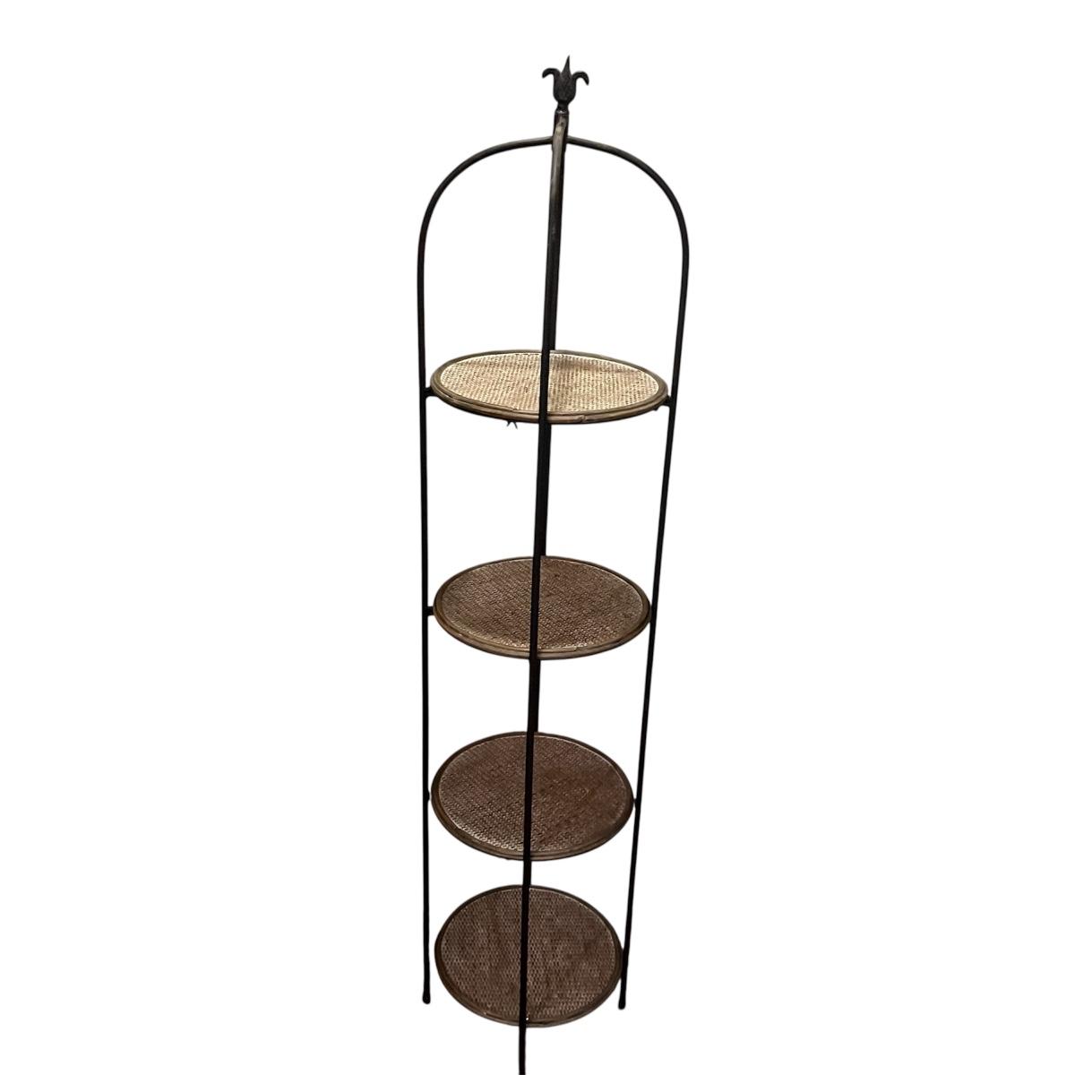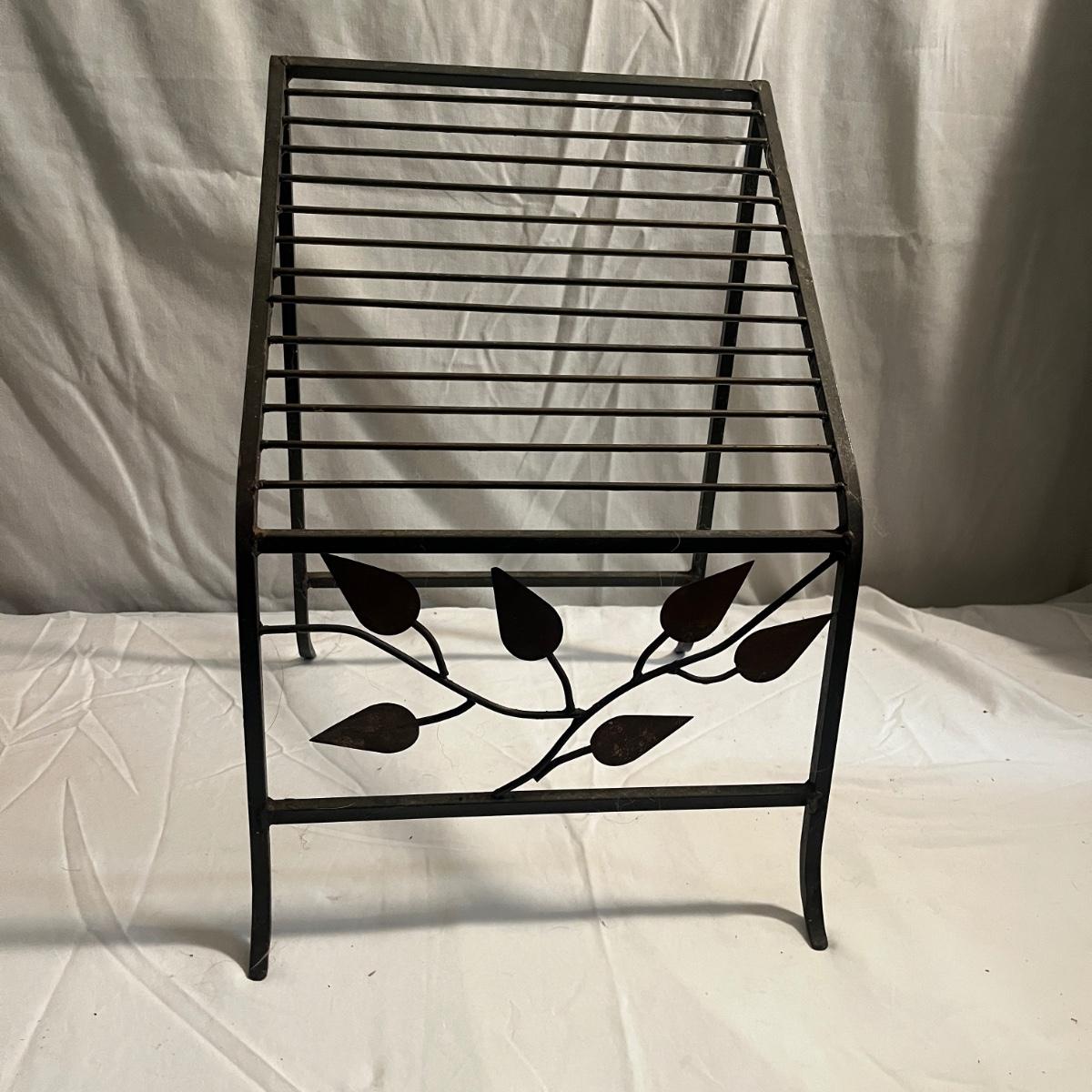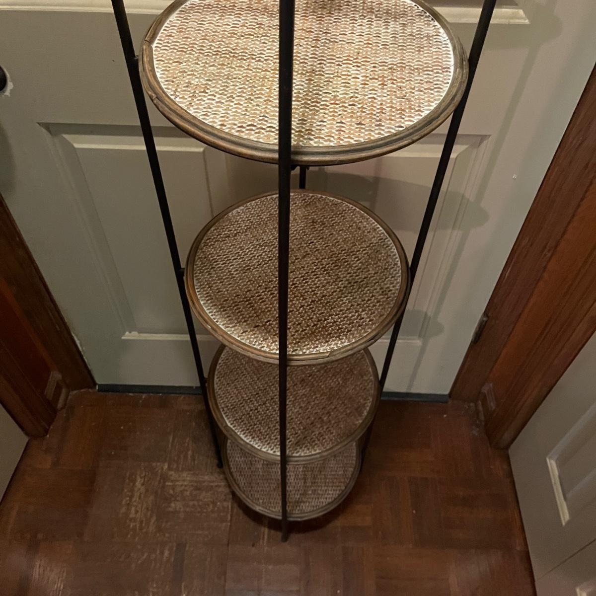Lot includes a metal folding four tier shelf, metal shelf and a metal magazine rack. Folding shelf measures 13.6” x 13.5” x 59”H when open and magazine rack measures 13” x 14” x 18”H.