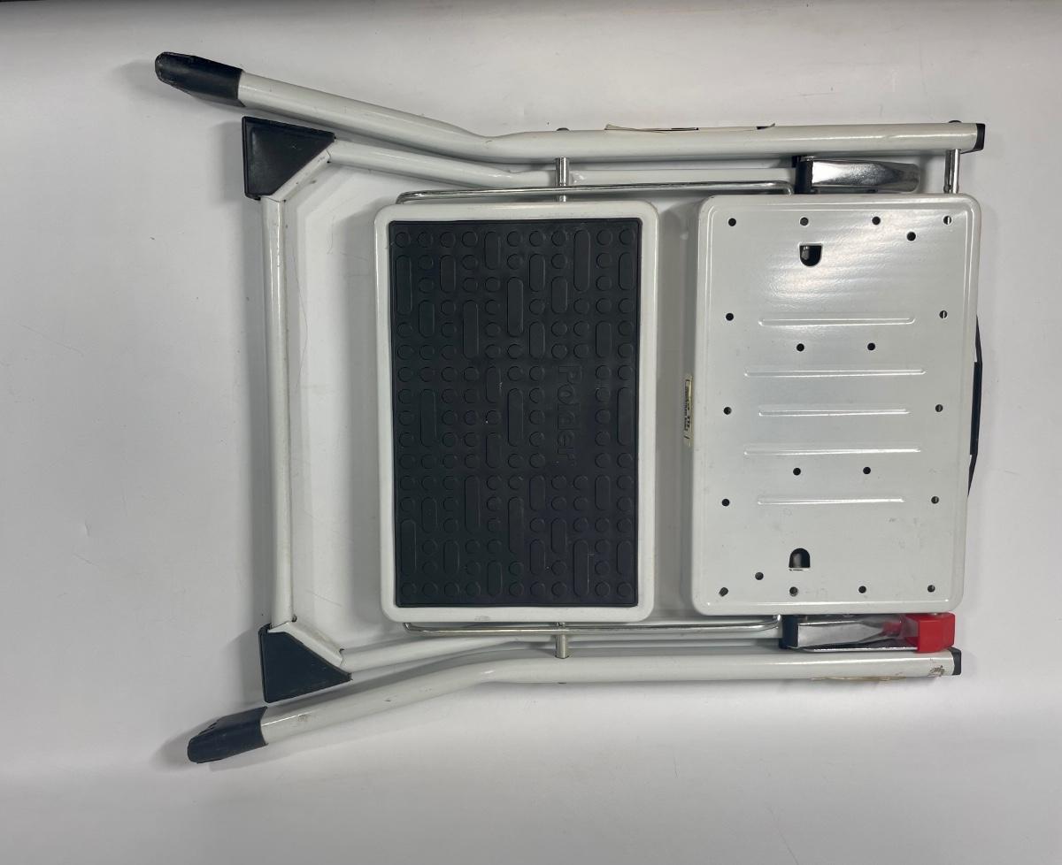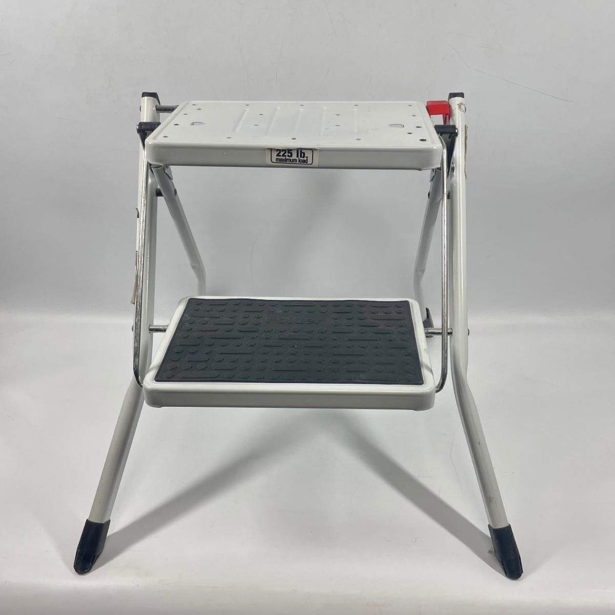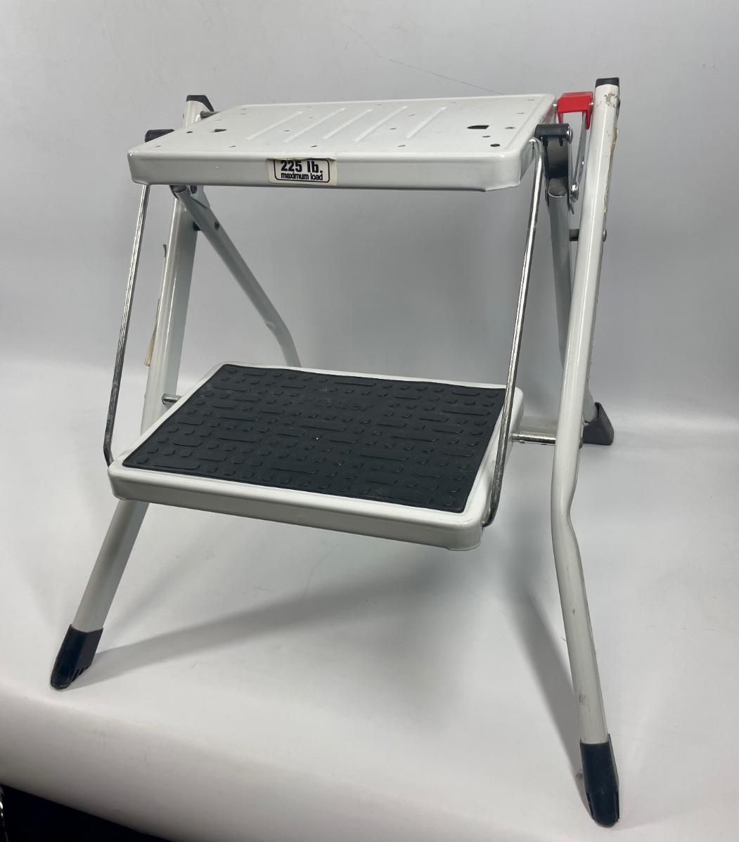 Polder folding steel stepladder. Rated to 225 pounds, Approx. 18” high. Folds to less then 1.5” wide to easily be stored in a cabinet or next to a refrigerator.