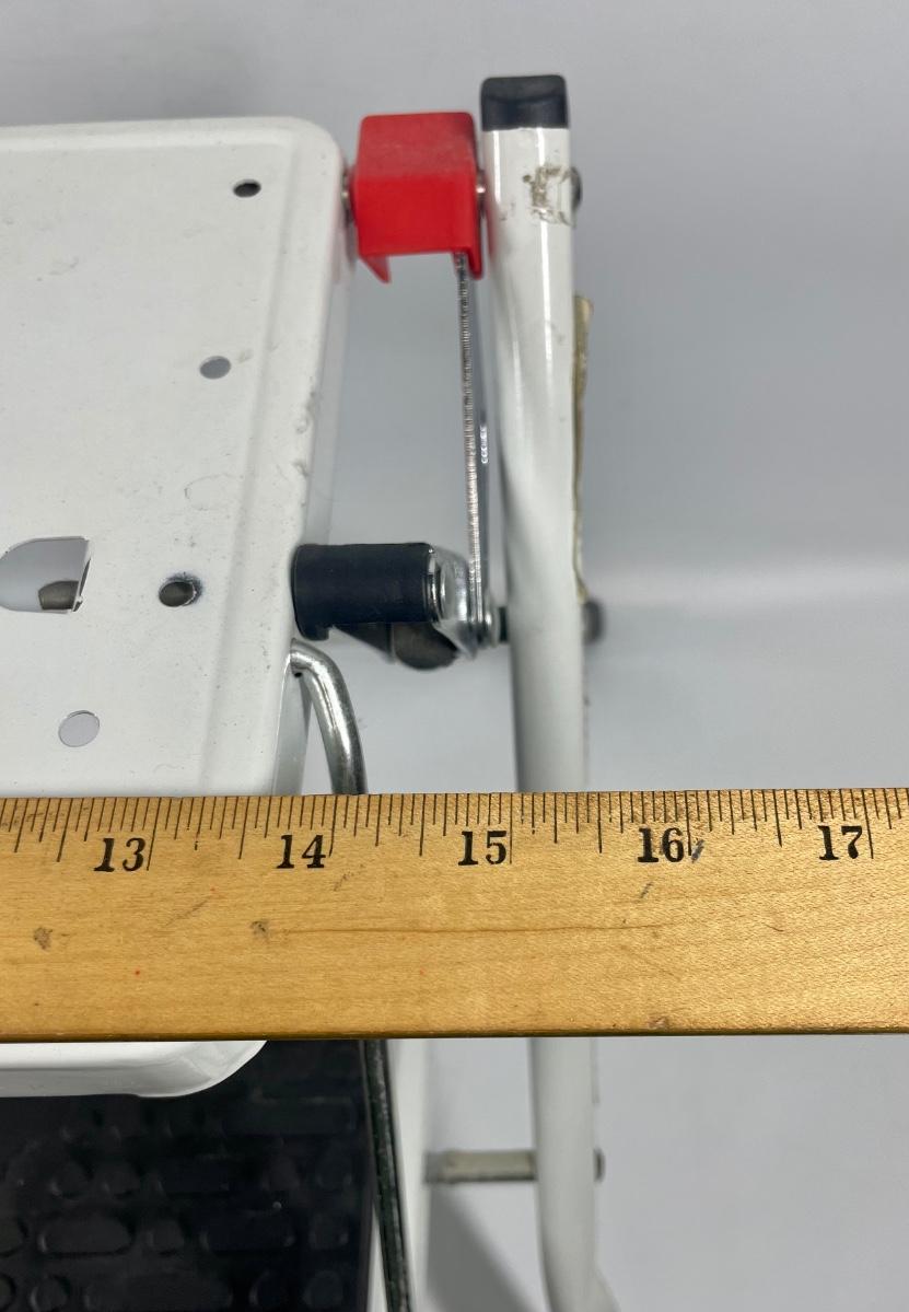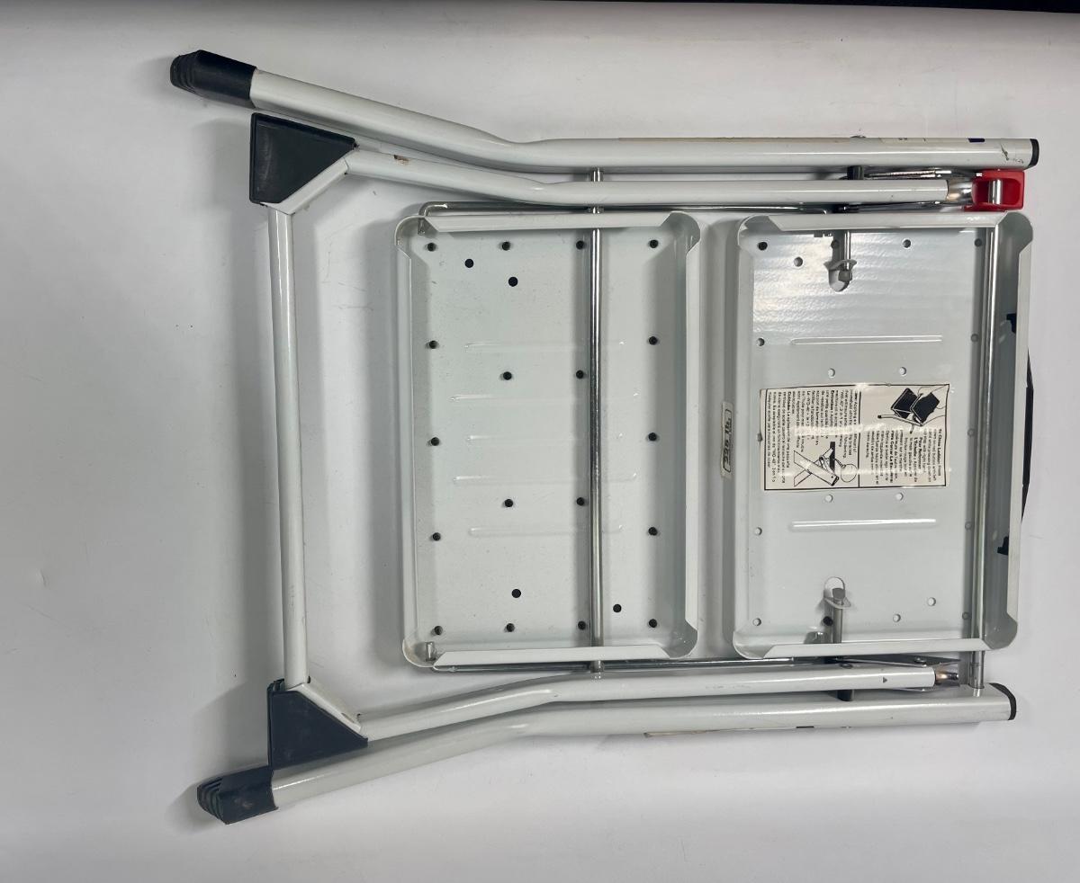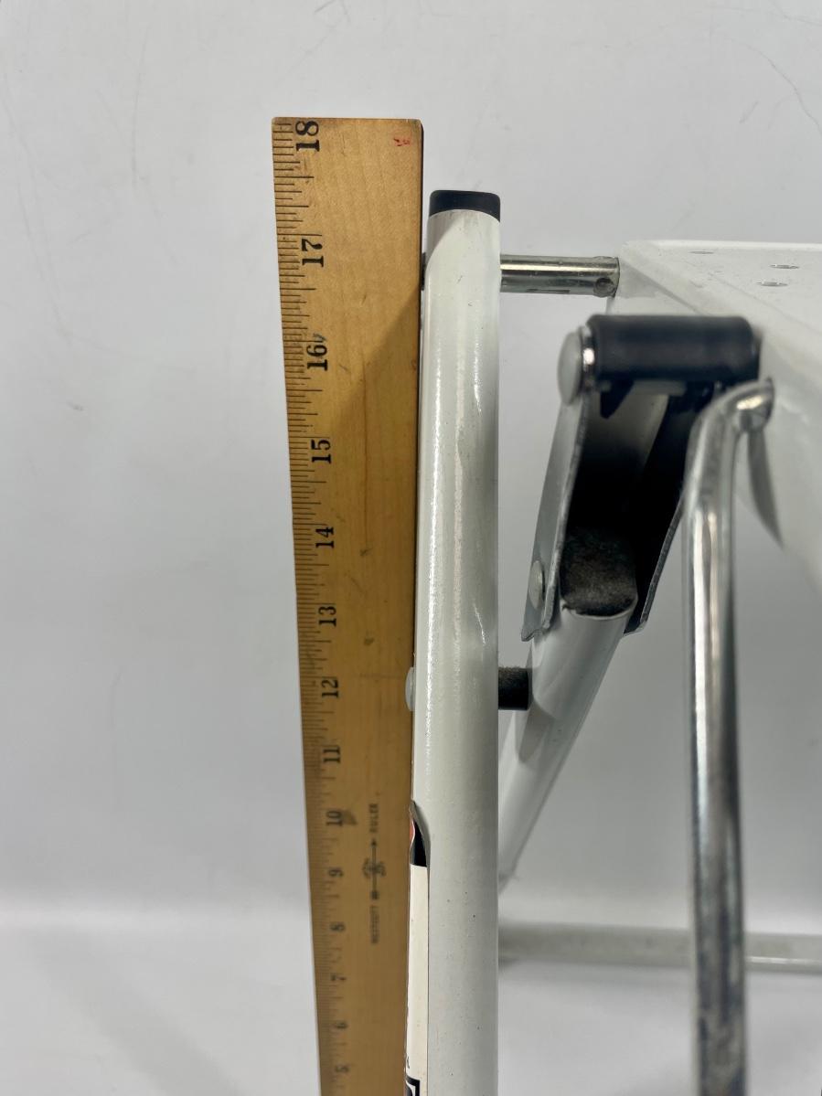 Polder folding steel stepladder. Rated to 225 pounds, Approx. 18” high. Folds to less then 1.5” wide to easily be stored in a cabinet or next to a refrigerator.