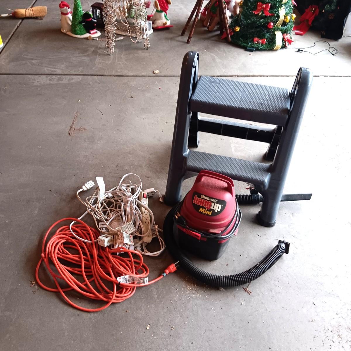 FOLDING STEP STOOL, MINI SHOP VAC AND EXTENSION CORDS
