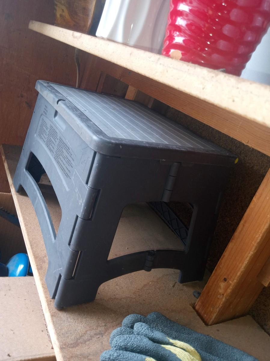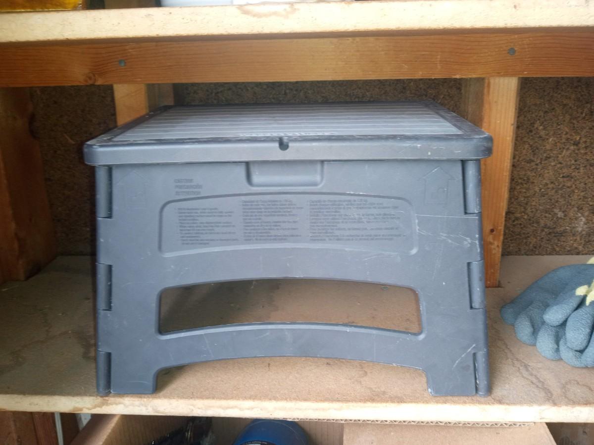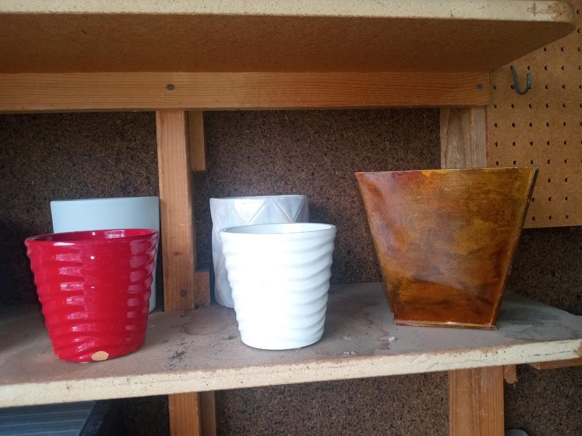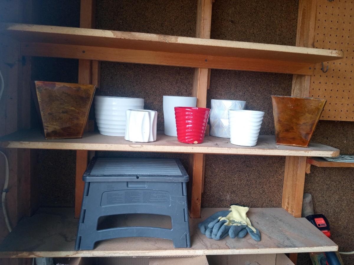 FOLDING STOOL, WORK GLOVES AND FLOWER POTS